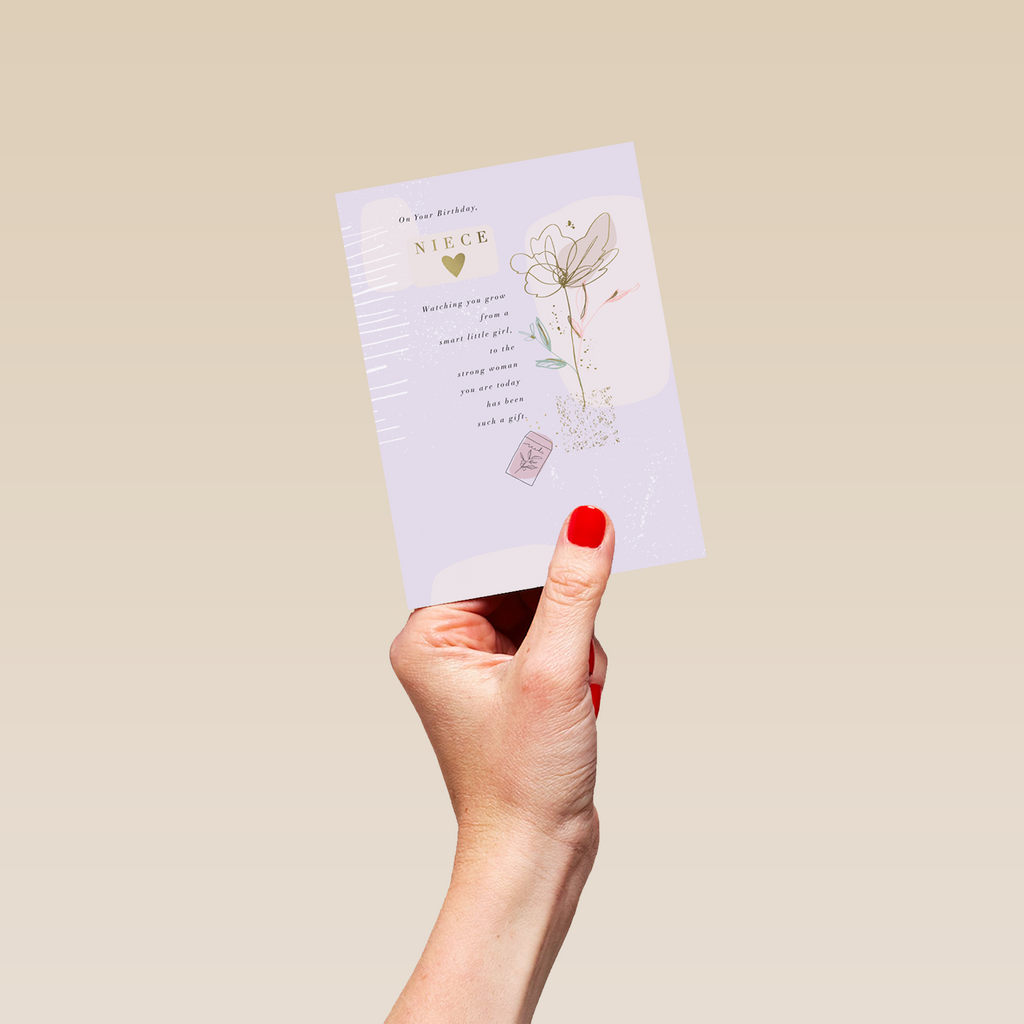 Show them you care with a personalised heartfelt traditional floral birthday card for niece from Hallmark. Our birthday cards are printed on premium quality, FSC®-certified card & delivered nationwide. This card is available as standard 12cm by 16.7cm and large 15.5cm by 21.6cm.