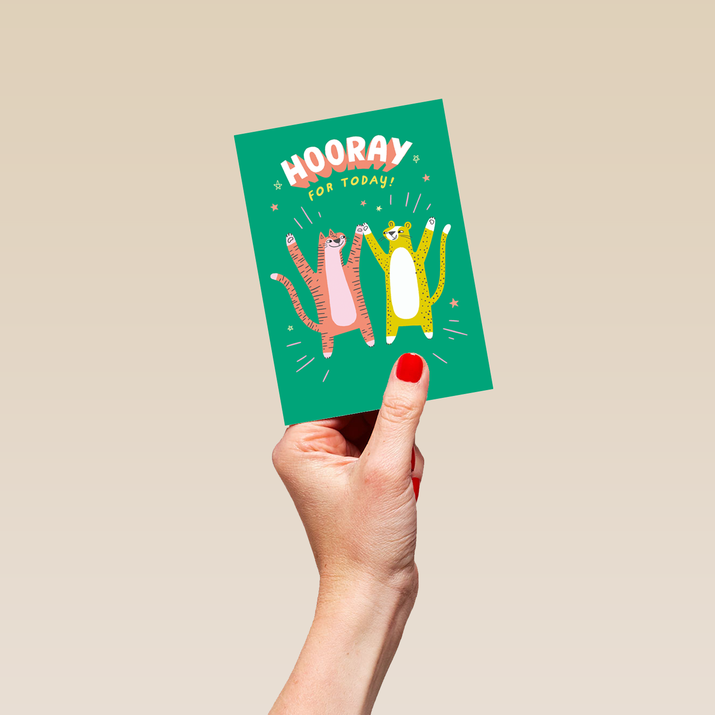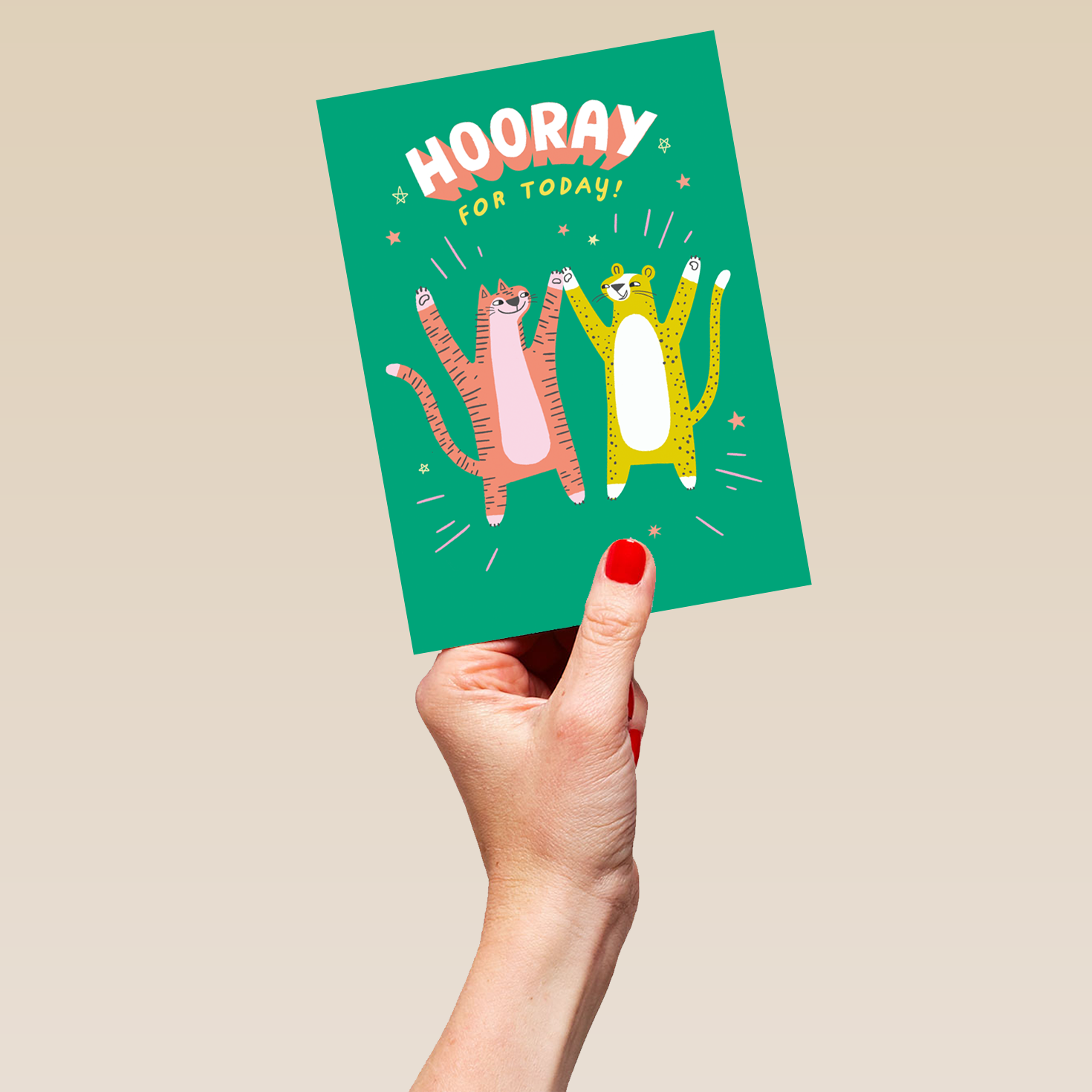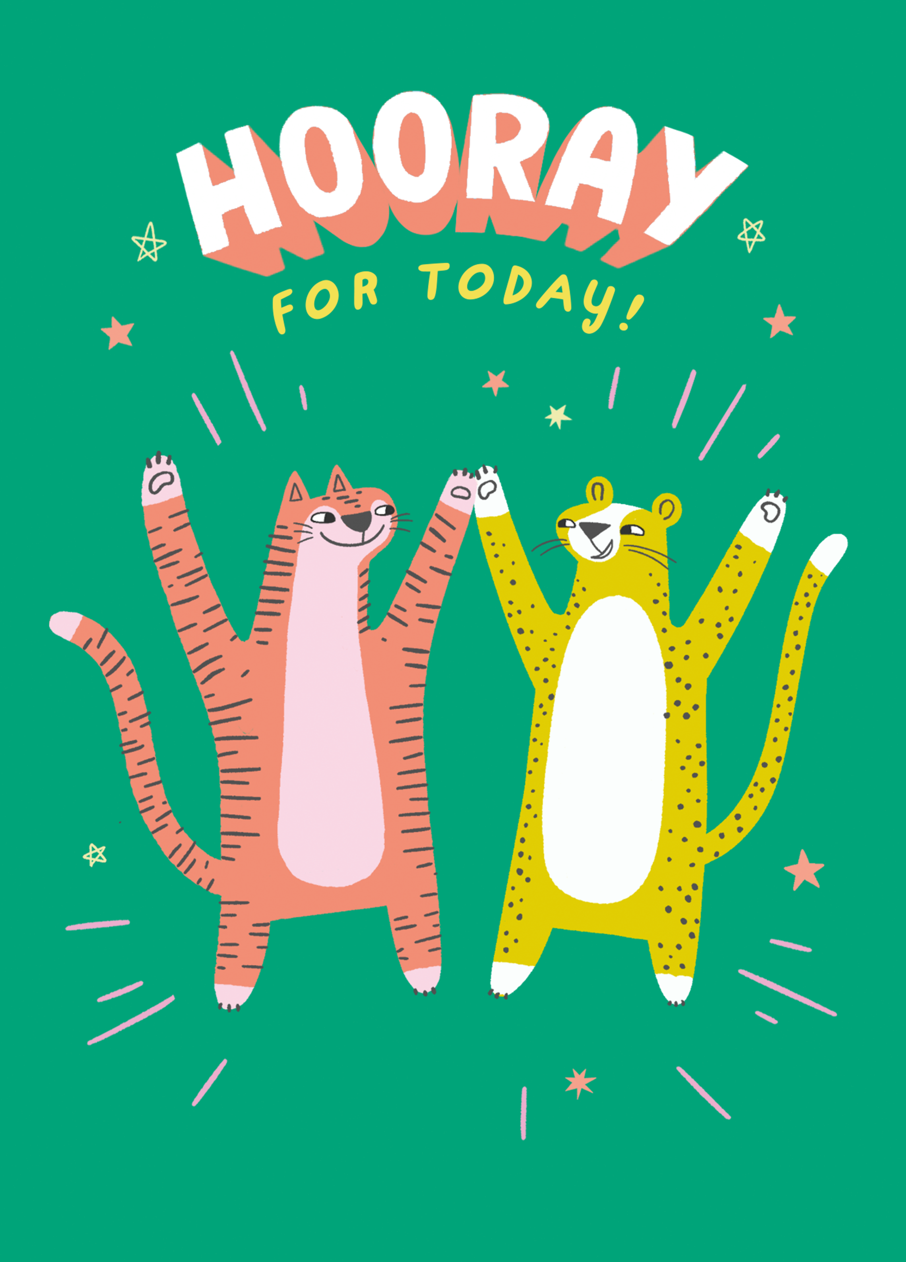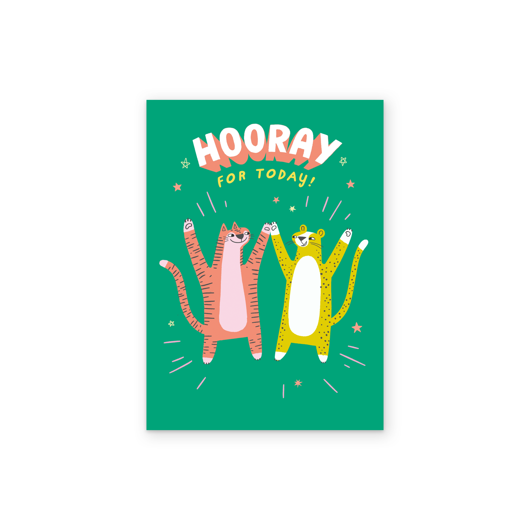 Printed on premium-quality board, this card features a super-cute illustration of two big cats, one pinky orange with stripes and one yellow and white with spots, surrounded by tiny stars and 'rays' set against a jade green background beneath white and pink 3D lettering and simple yellow lettering, with the message 'Hooray for today!', and comes complete with a co-ordinating white envelope.