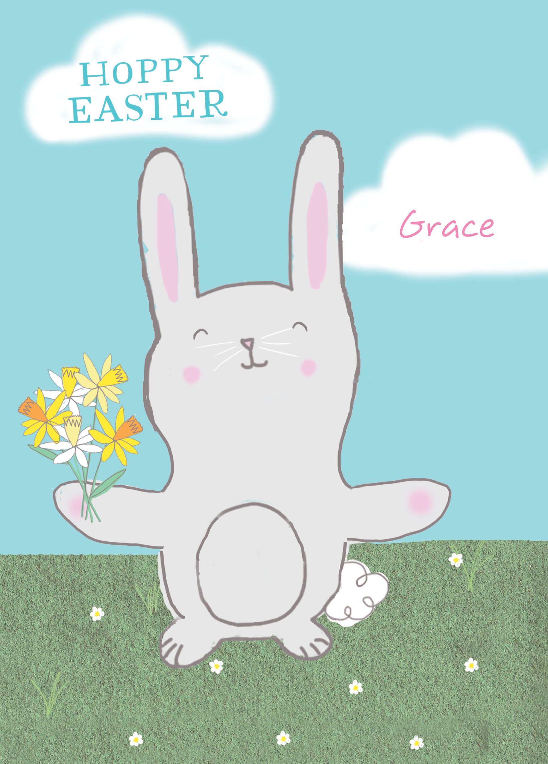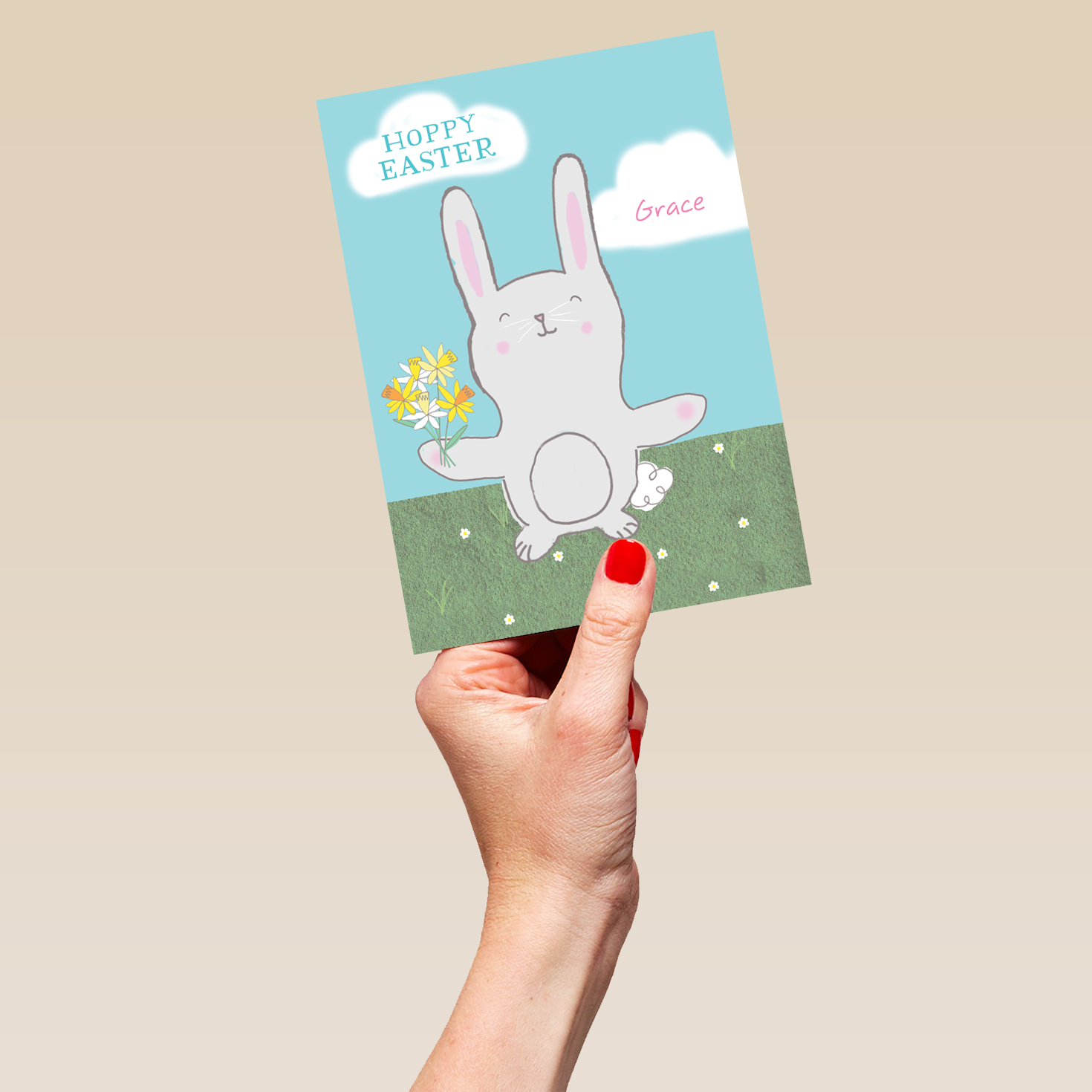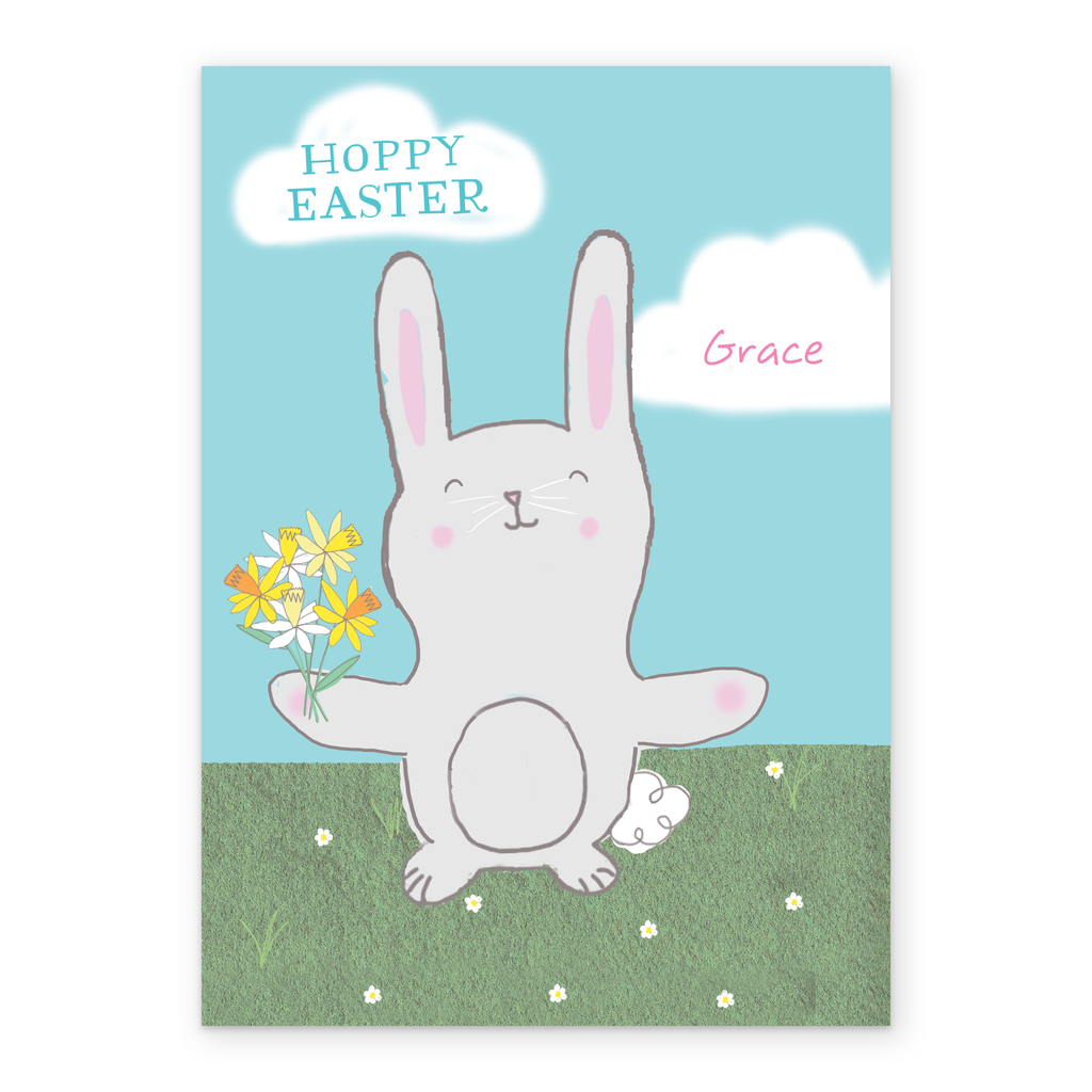 Printed on premium-quality board, this card features a cute contemporary illustrated Easter bunny, playing in the grass while holding a bouquet of beautiful daffodils, with the message 'Hoppy Easter', space to personalise a name, and comes complete with a co-ordinating white envelope.