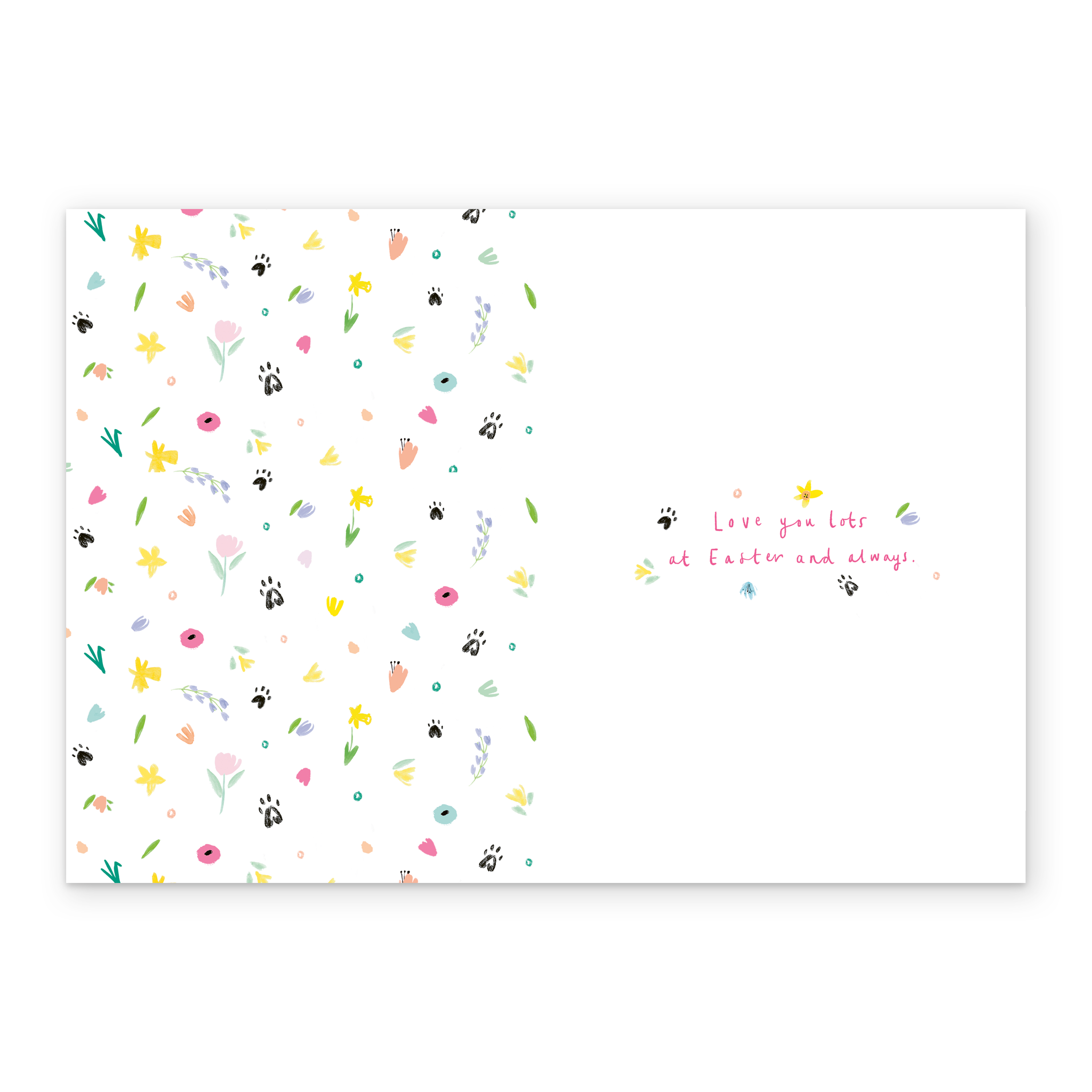 Printed on premium-quality board, this card features pink and black text and a cute illustrated Easter bunny wearing a colourful floral crown, on a white background, with the message 'To a lovely ___ have a hoppy Easter!', space to personalise a name, and comes complete with a co-ordinating white envelope.