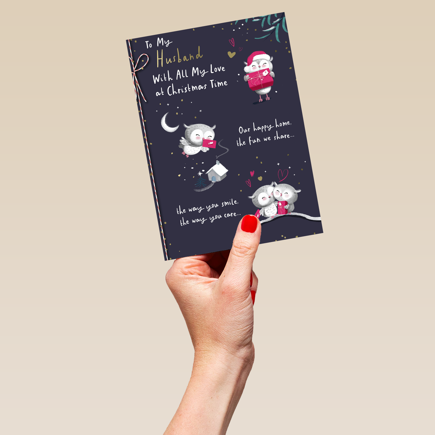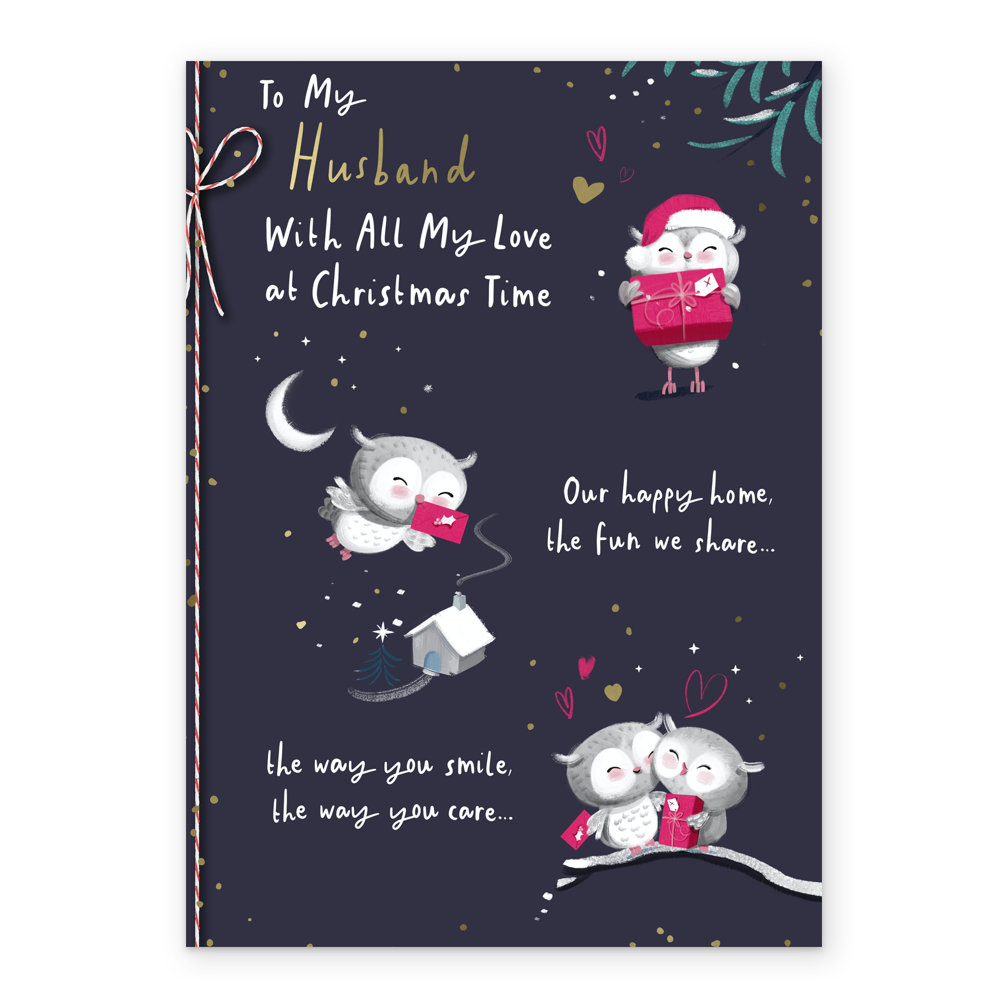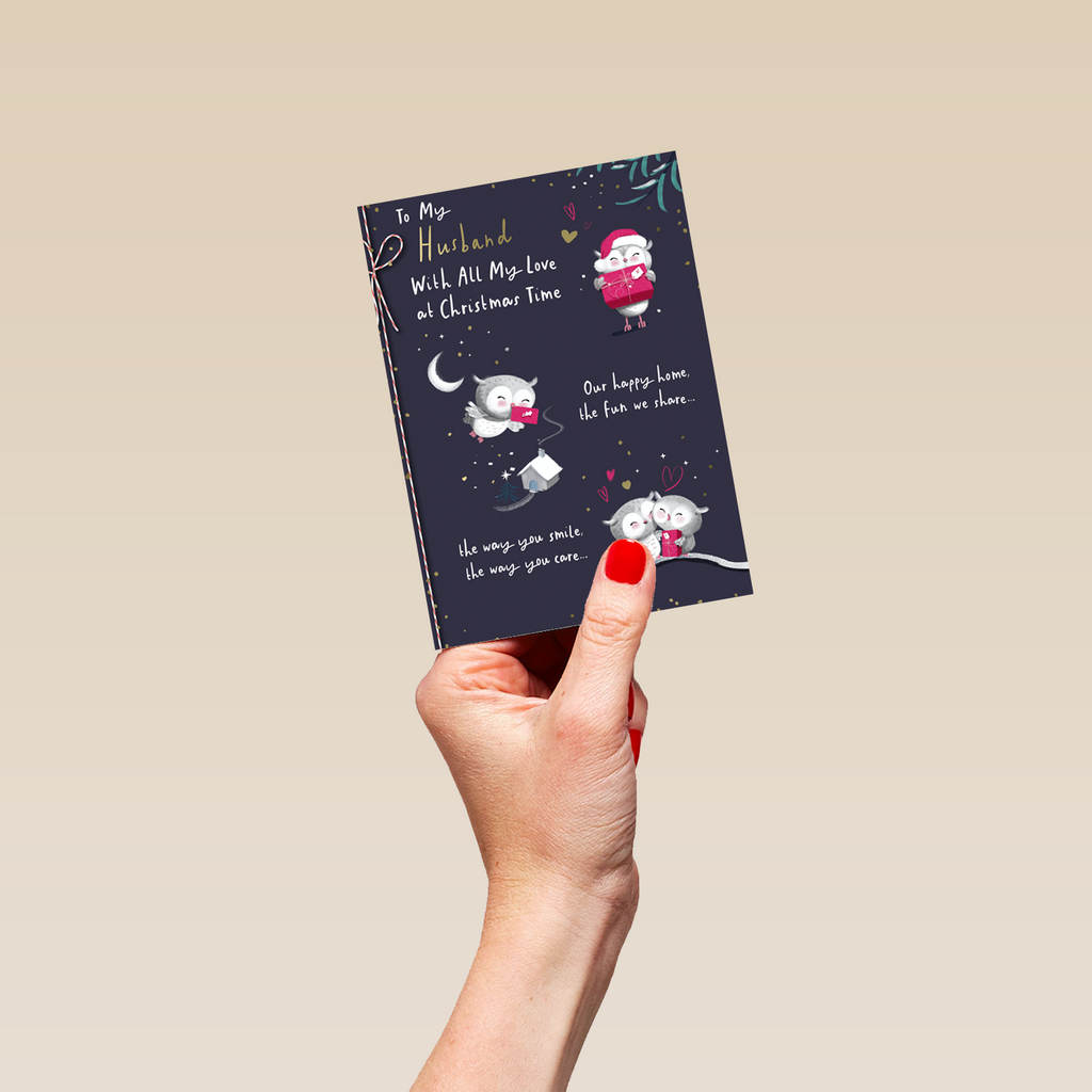 Show them you care with a personalised husband cute owls rebus verse Christmas card from Hallmark. Our greetings cards are printed on premium quality, FSC®-certified card & delivered nationwide. This card is available as standard 12cm by 16.7cm and large 15.5cm by 21.6cm.