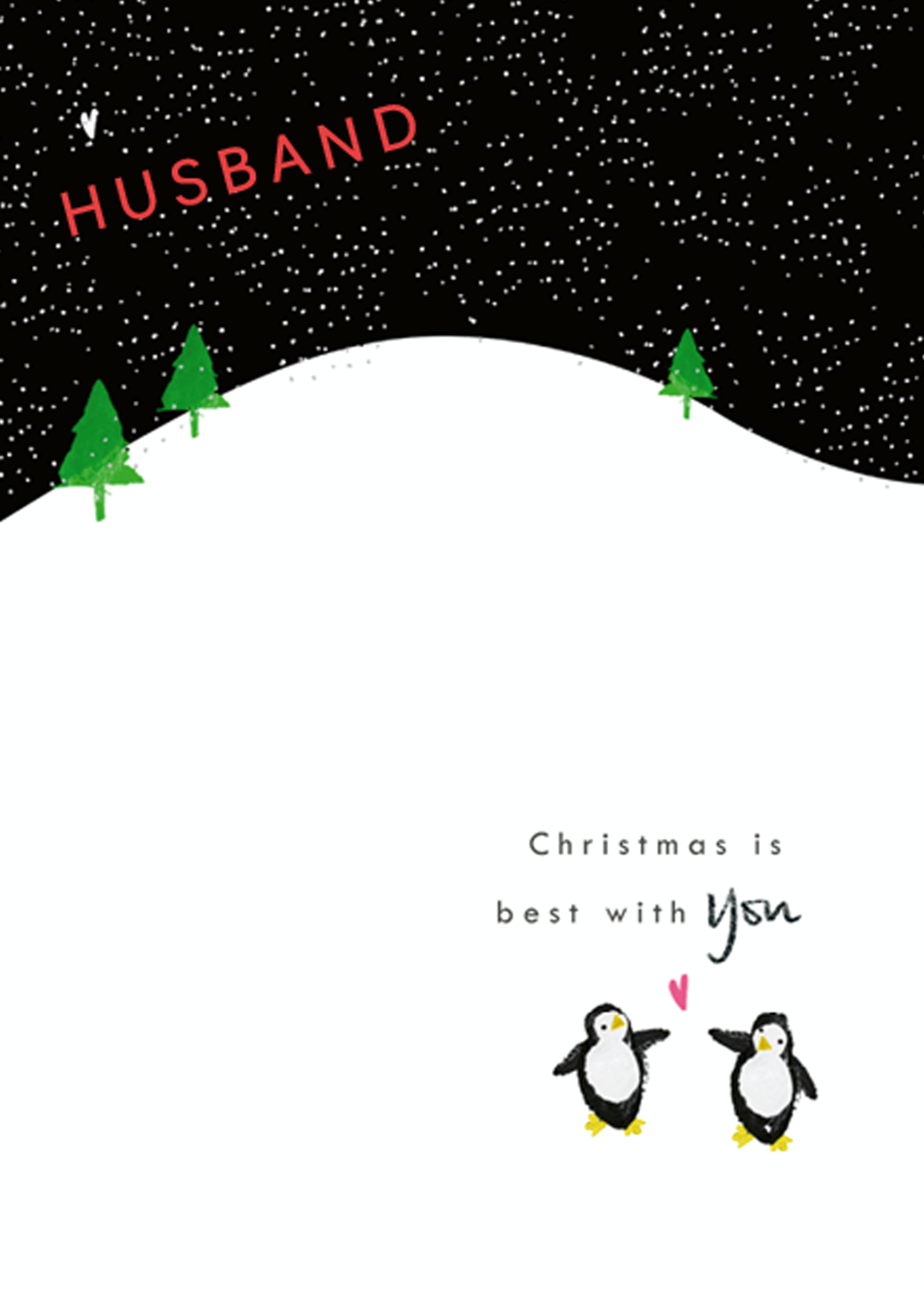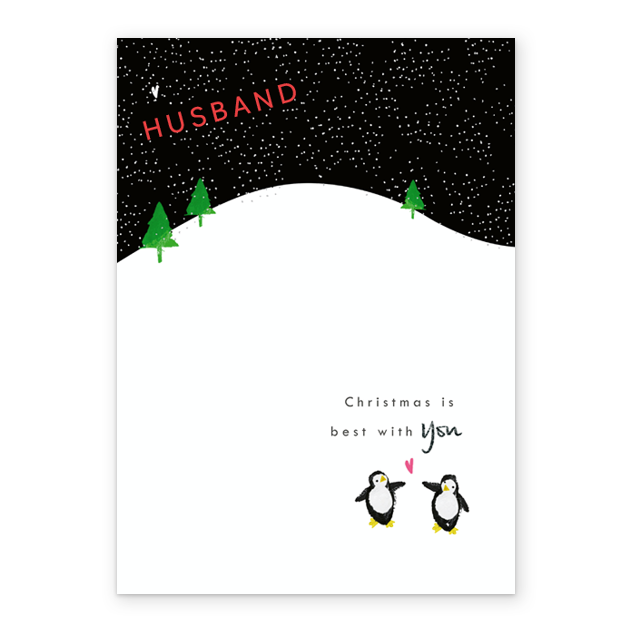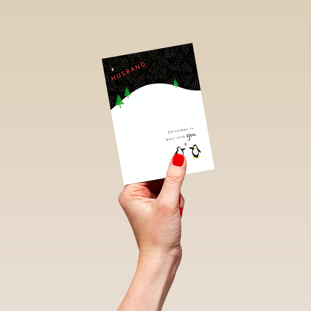 Show them you care with a personalised husband cute penguins heart hill Christmas card from Hallmark. Our greetings cards are printed on premium quality, FSC®-certified card & delivered nationwide. This card is available as standard 12cm by 16.7cm and large 15.5cm by 21.6cm.