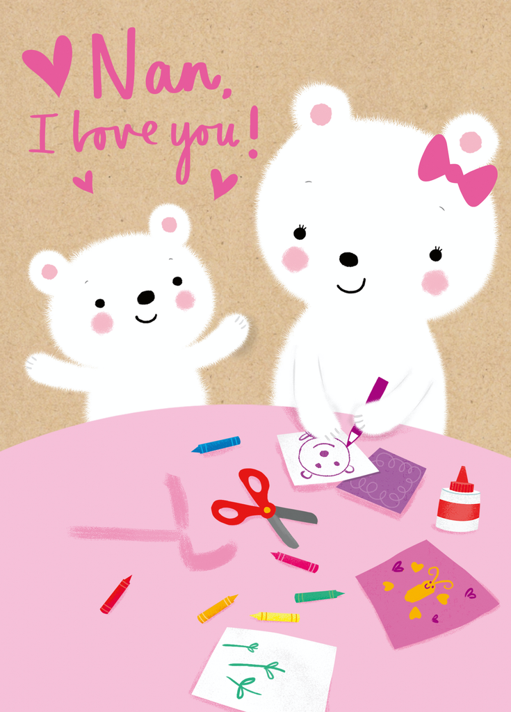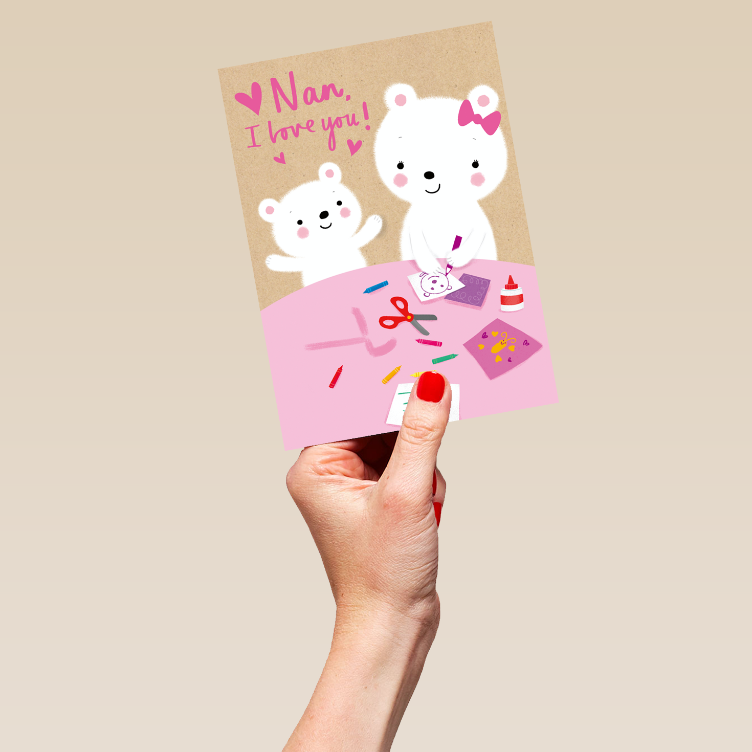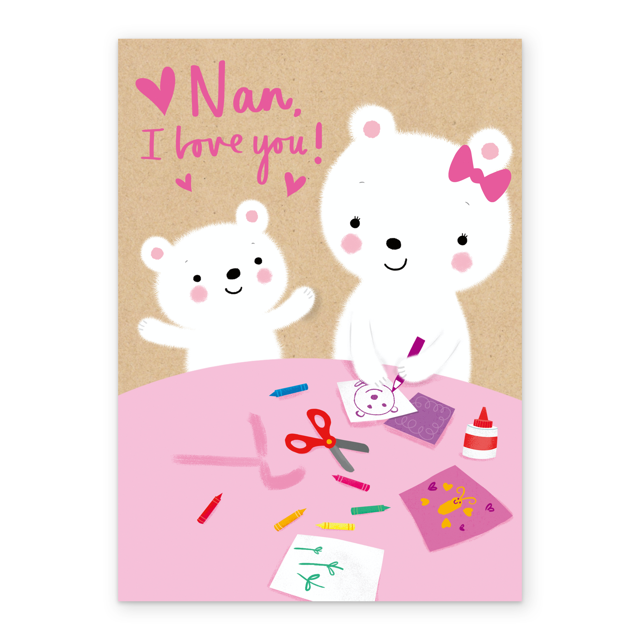 Show them you care with a personalised I love you nan crafting bears birthday card from Hallmark. Our bear cards are printed on premium quality, FSC®-certified card & delivered nationwide. This card is available as standard 12cm by 16.7cm and large 15.5cm by 21.6cm.