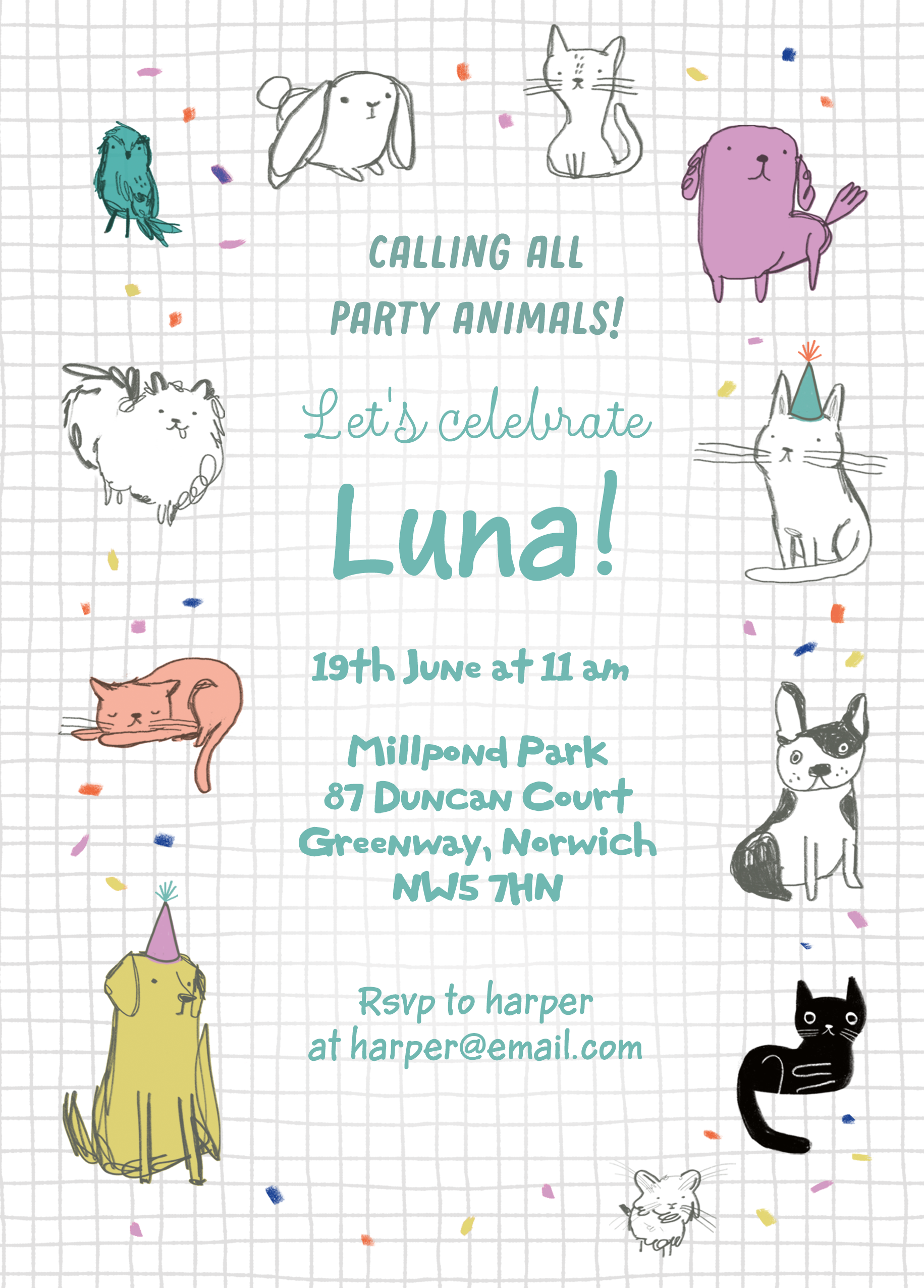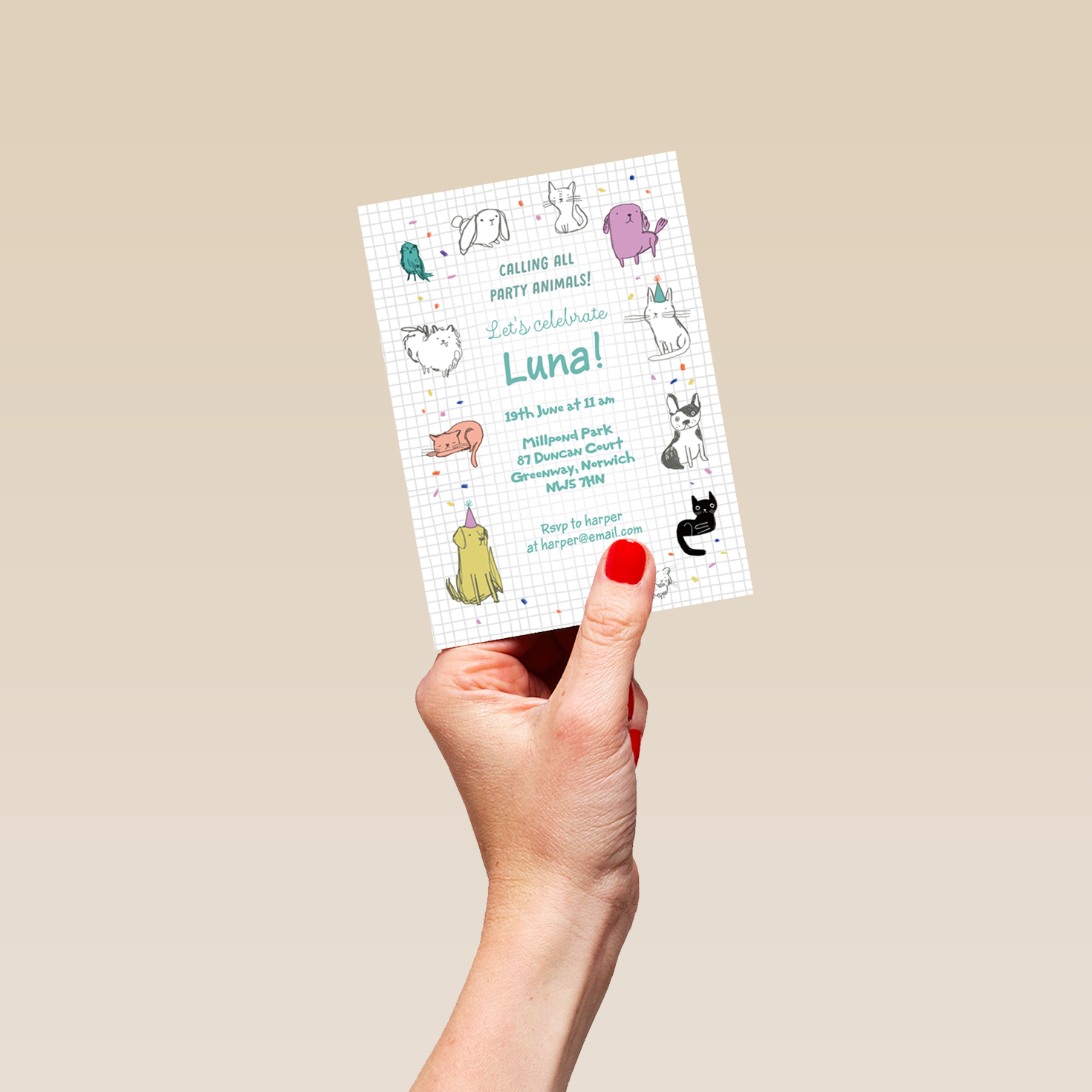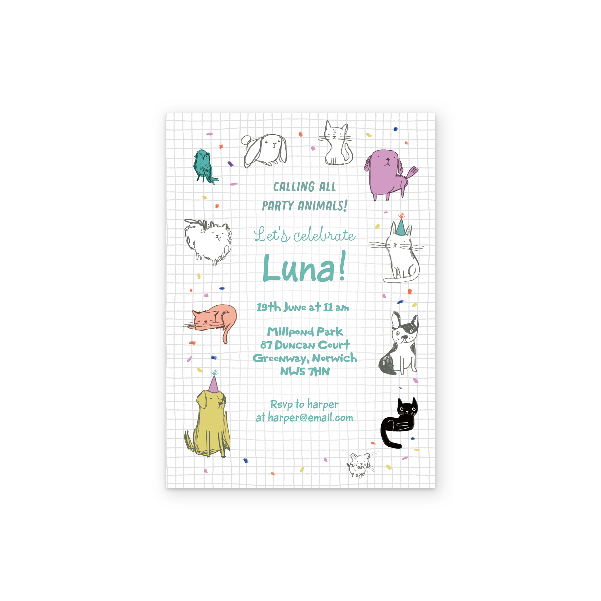 Printed on premium-quality board, this card features a quirky collection of illustrated cats and dogs set against a grey and white checked background and surrounding bright turquoise lettering, with the message 'Calling All Party Animals! Lets Celebrate [NAME]! [DATE] [ADDRESS] RSVP to [NAME] at [EMAIL ADDRESS]', space to personalise your message, and comes complete with a co-ordinating white envelope.