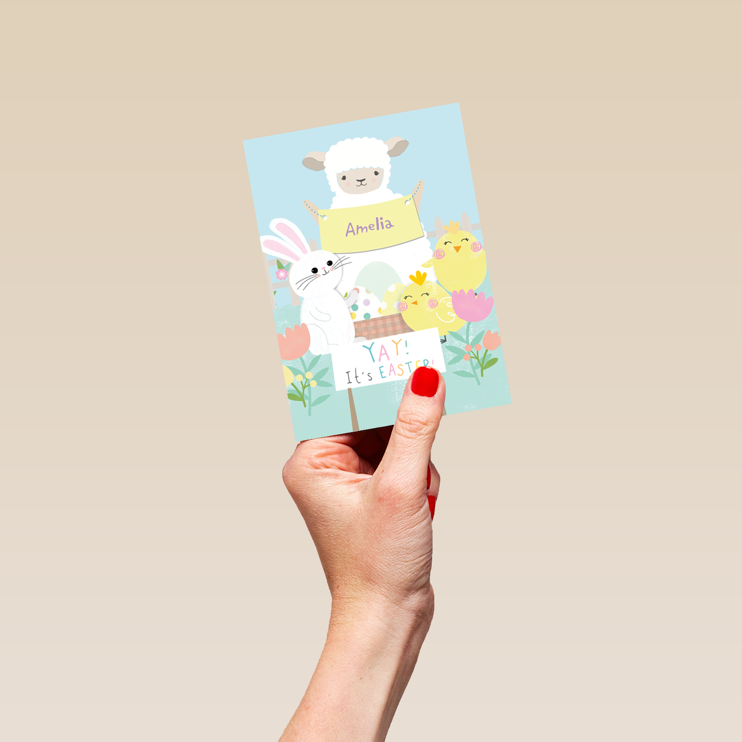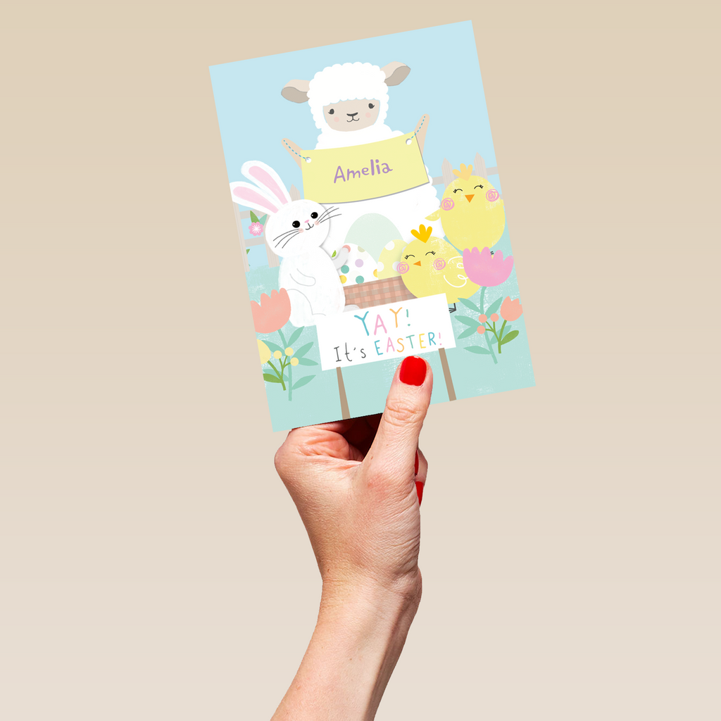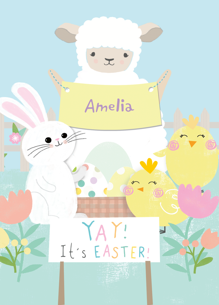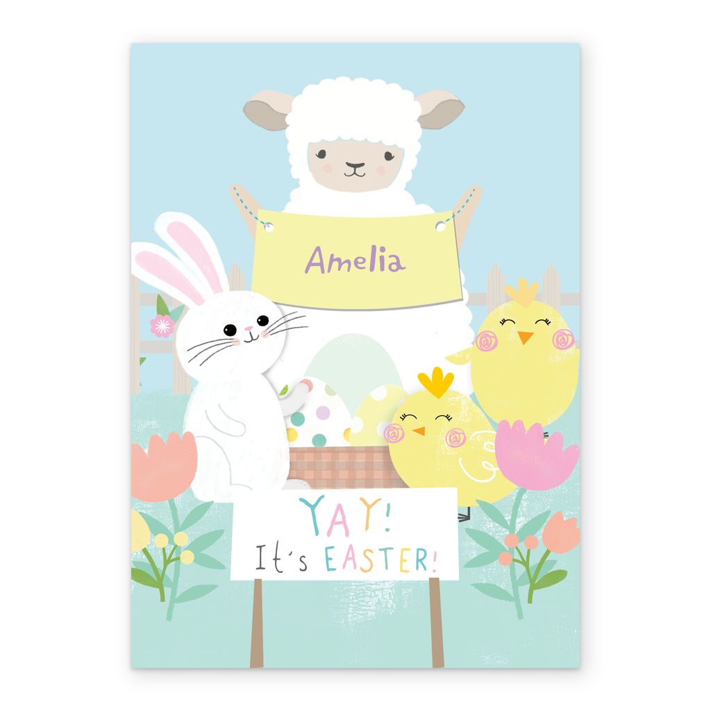 Printed on premium-quality board, this card features cute illustrated chicks, a bunny and a lamb holding a banner, standing around a basket of colourfully patterned Easter eggs, with the message 'Yay! It's Easter!', space to personalise a name, and comes complete with a co-ordinating white envelope.