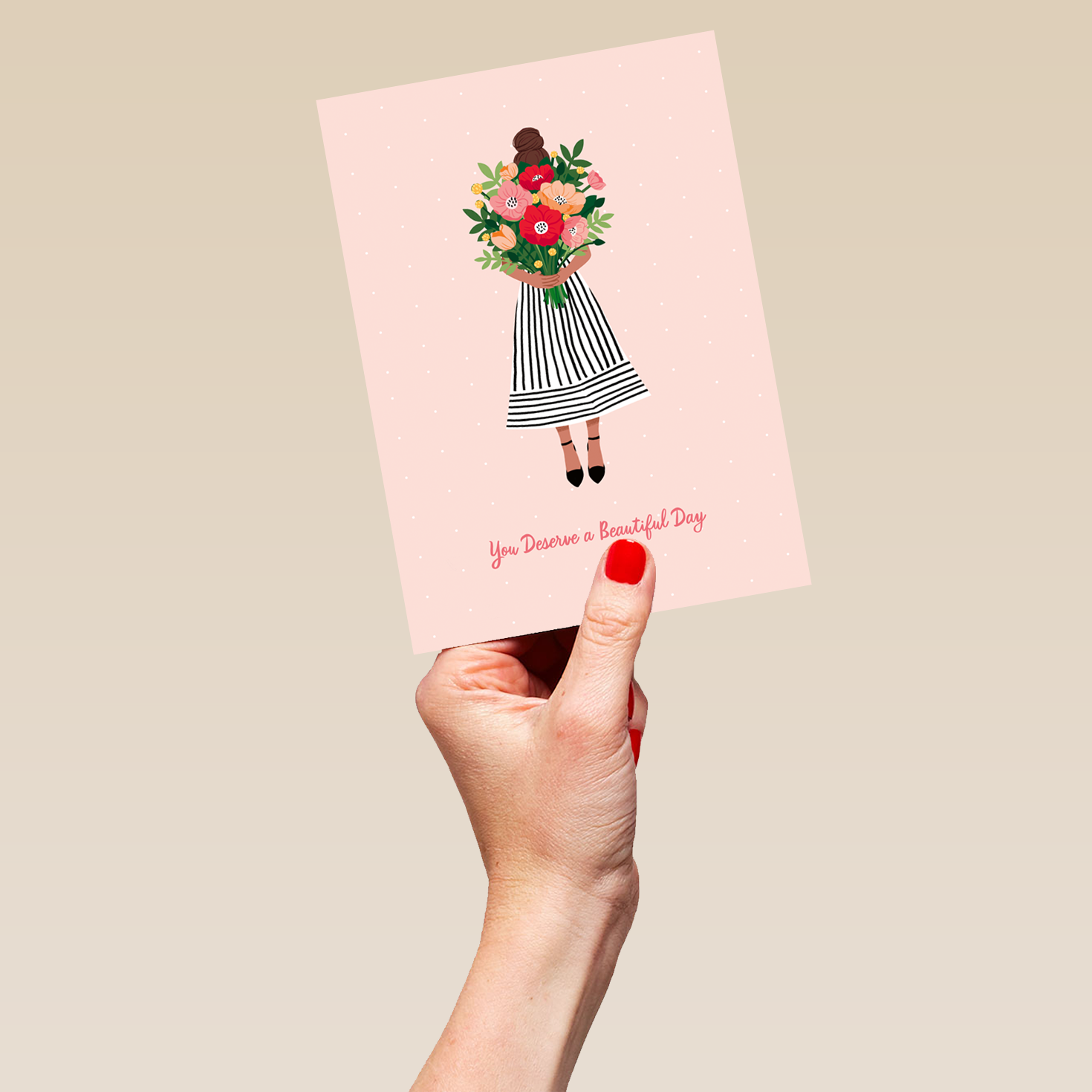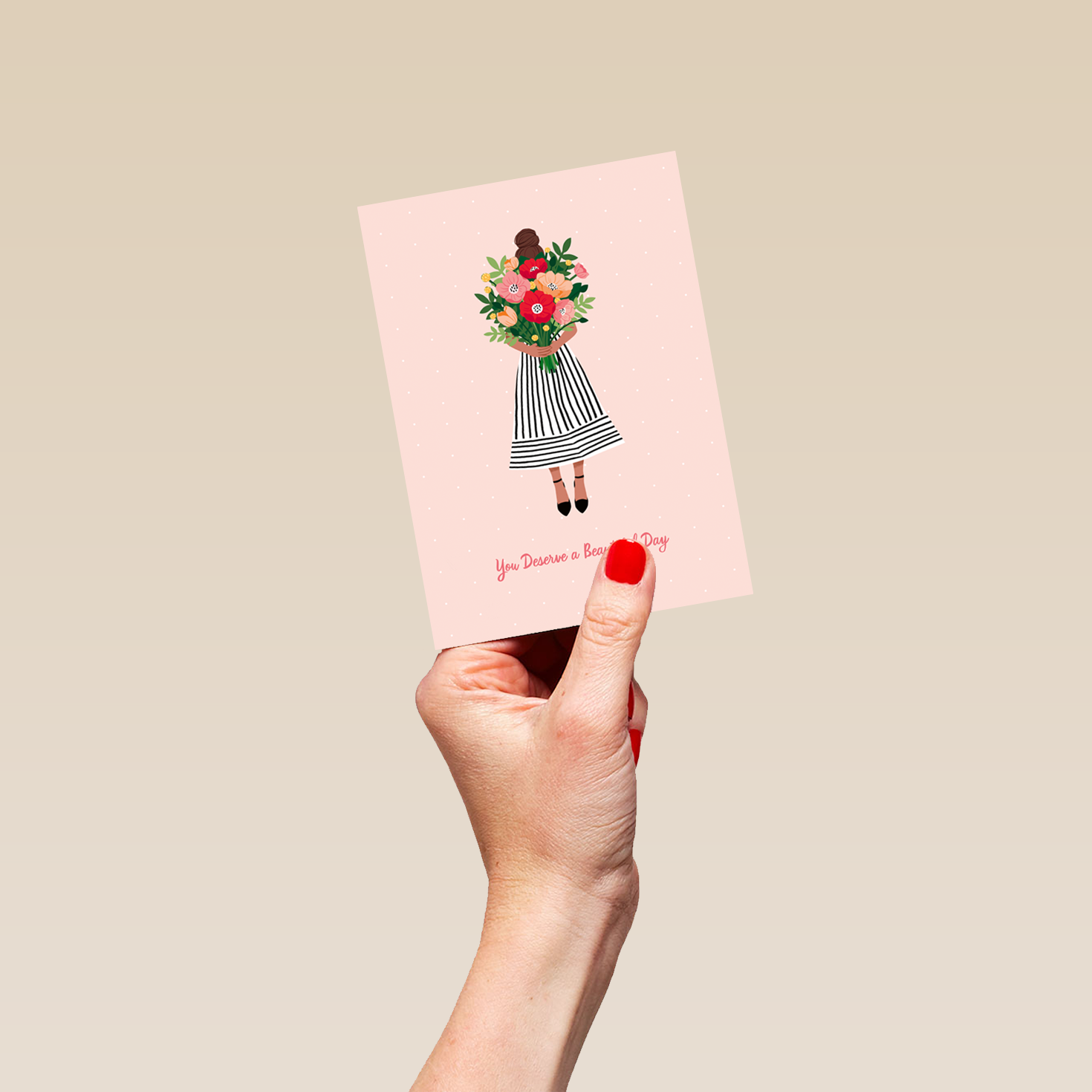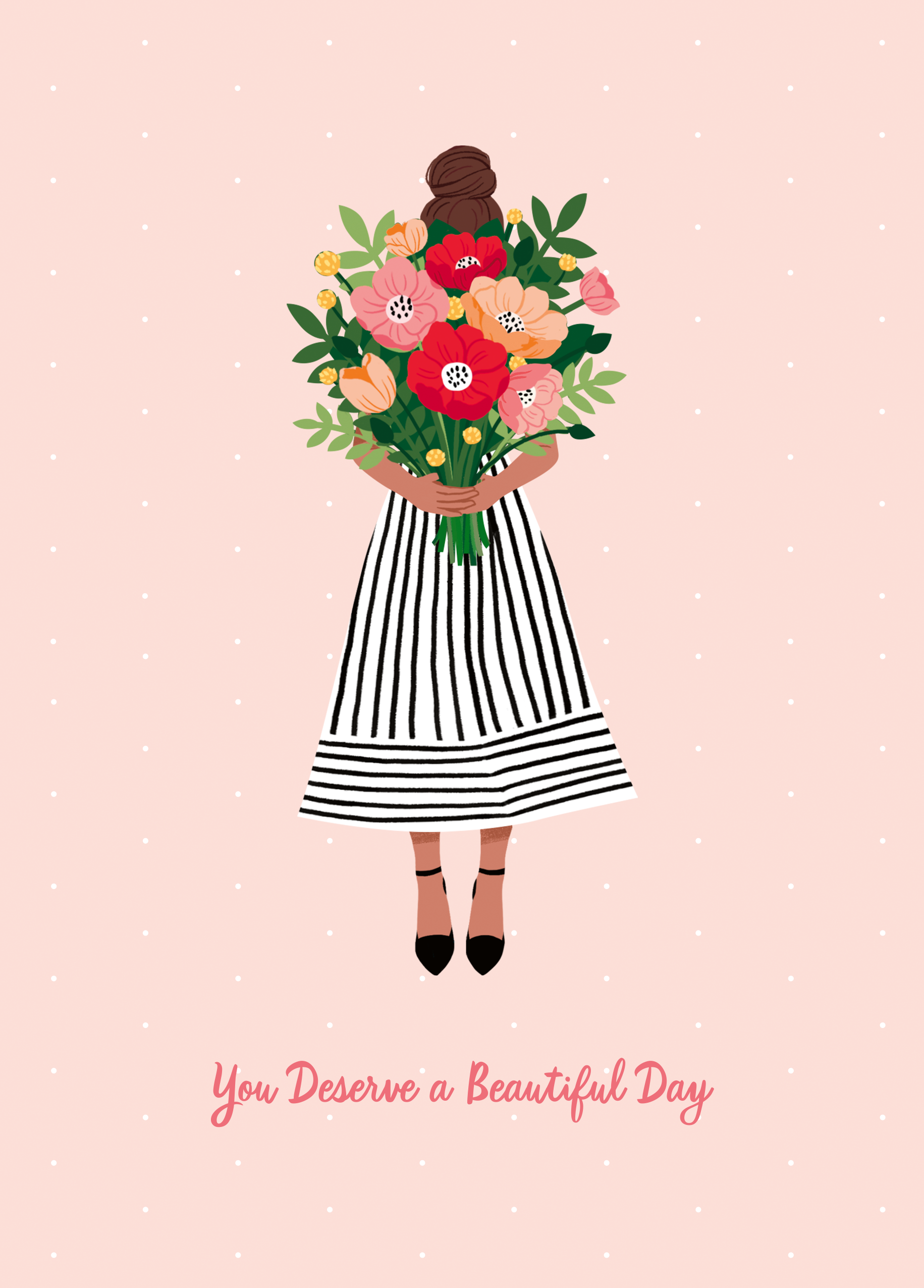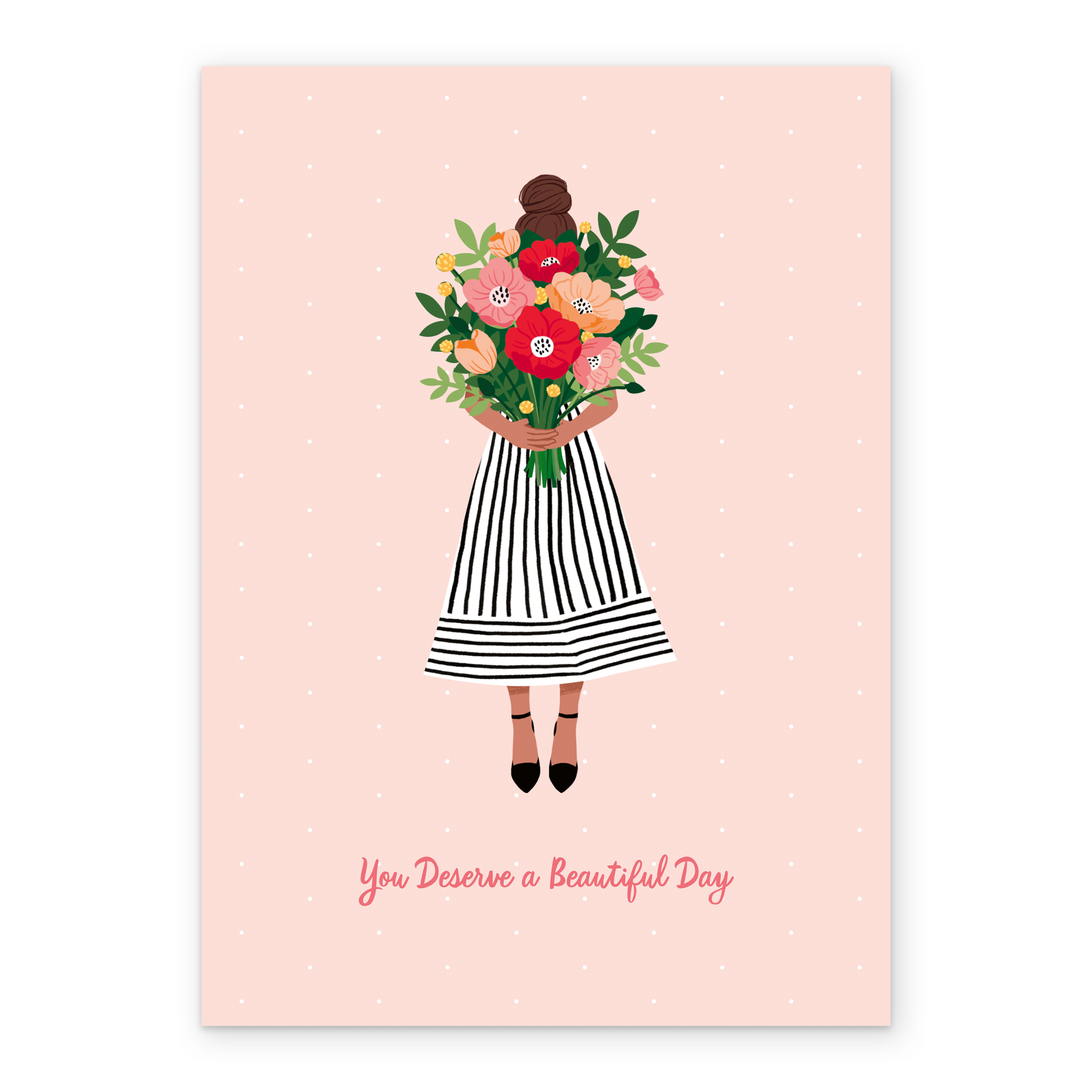 Printed on premium-quality board, this card features a soft pink background with an illustration of a girl in a striped dress carrying a huge bouquet of colourful flowers, above handwritten style red lettering, with the message 'You deserve a beautiful day', space to personalise your message, and comes complete with a co-ordinating white envelope.