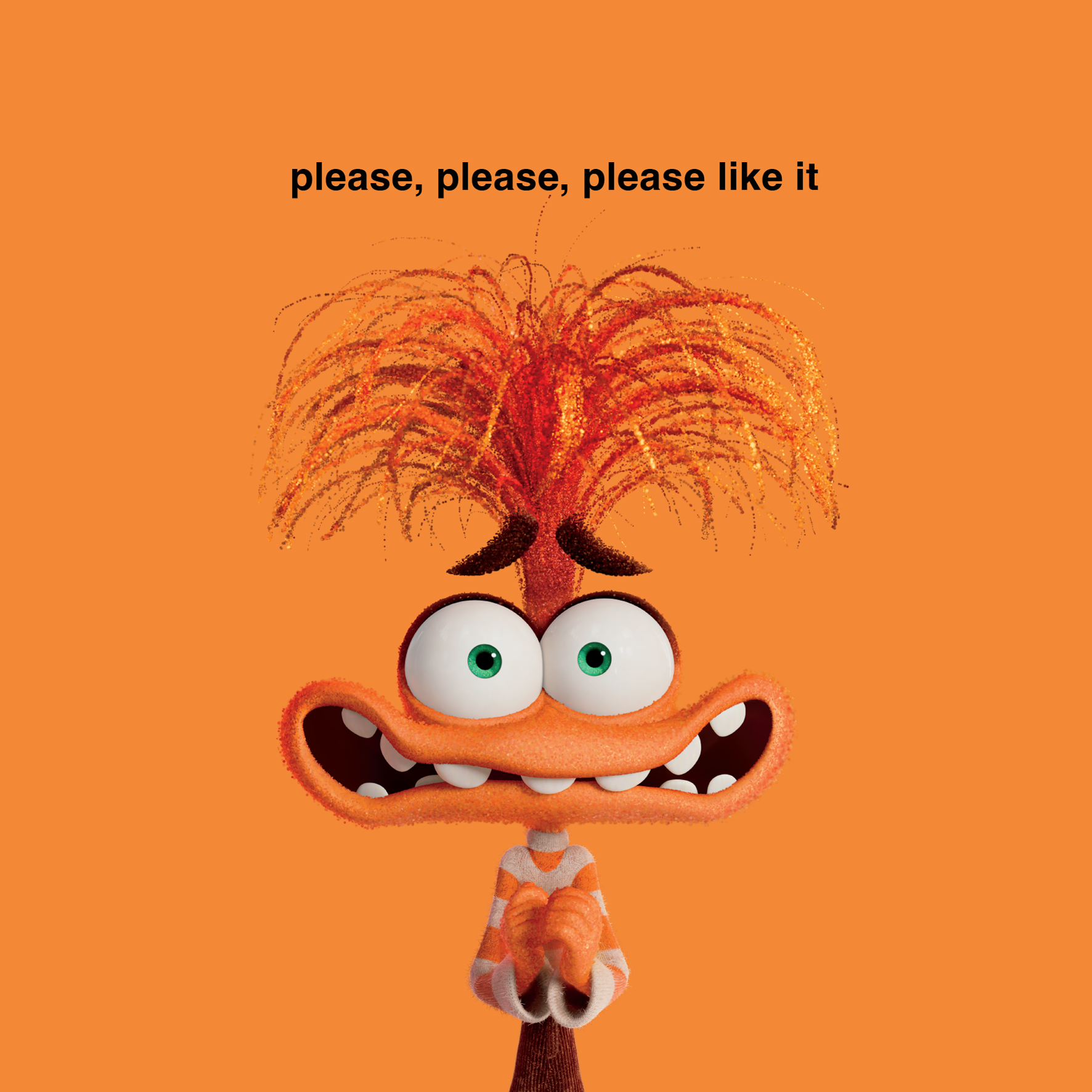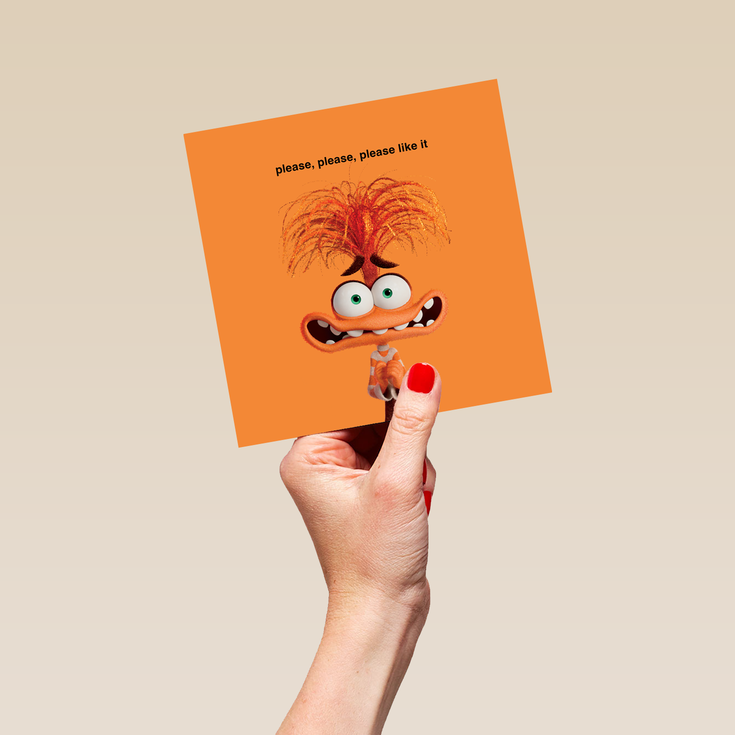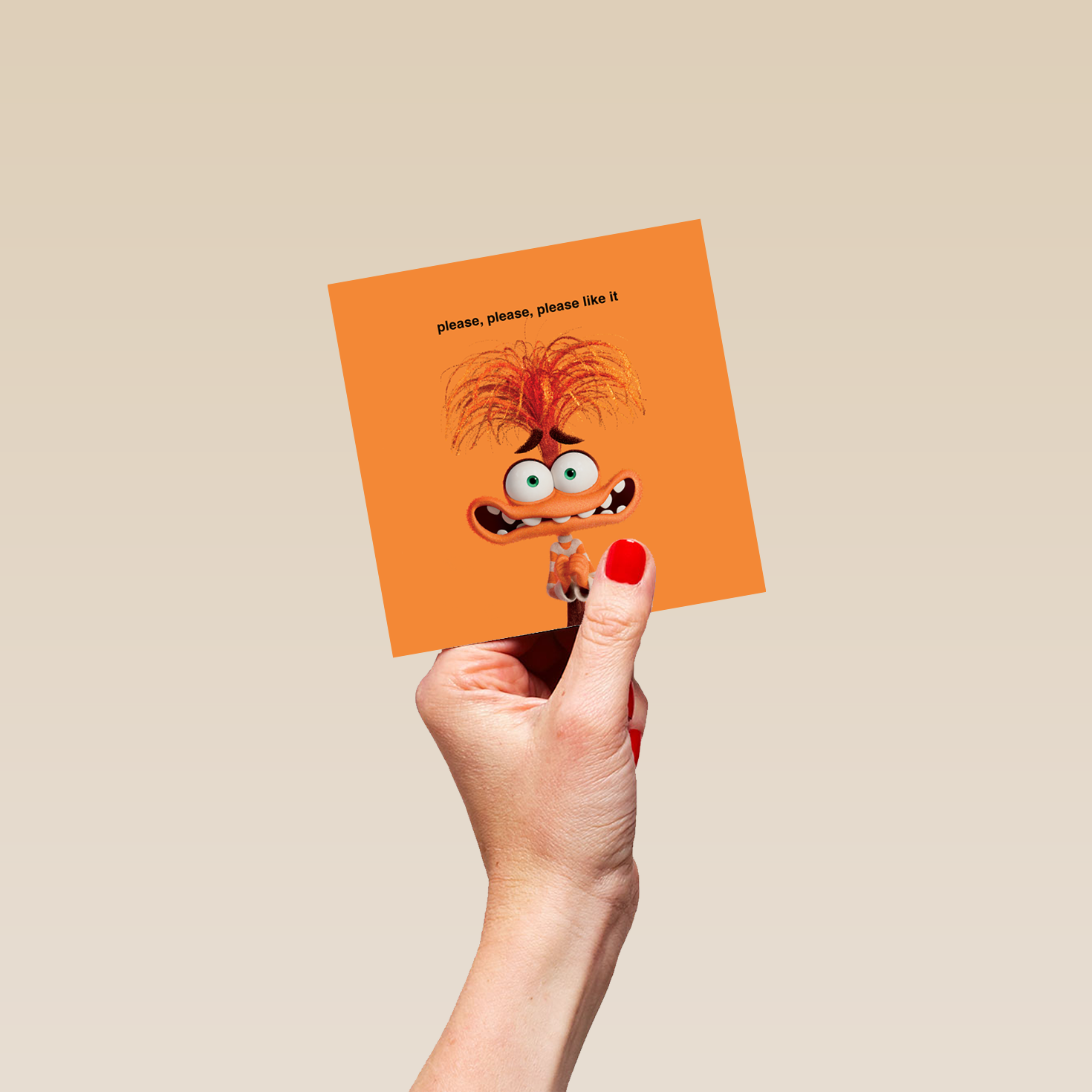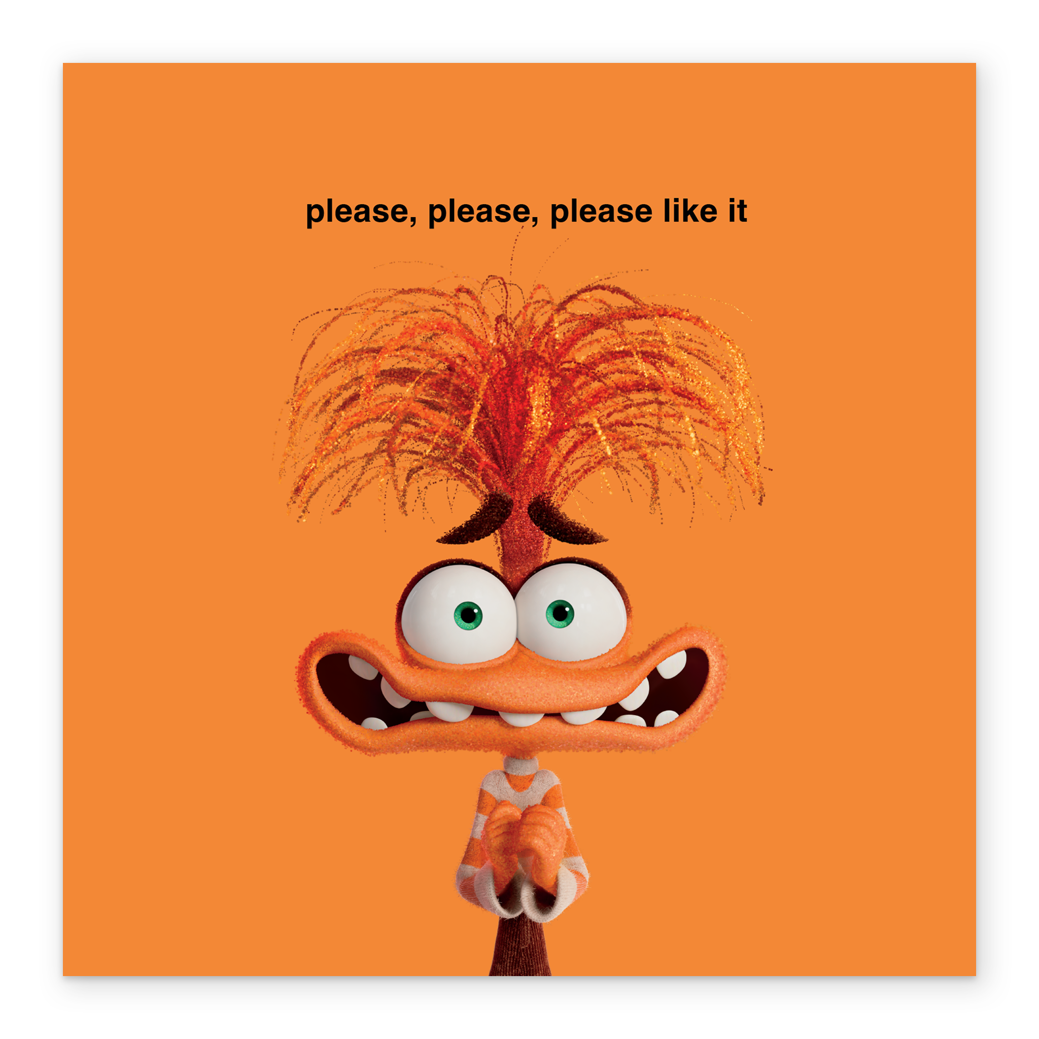 Printed on premium-quality board, this card features Anxiety from Inside Out 2, with the message 'Please, please, please like it', and comes complete with a co-ordinating white envelope.