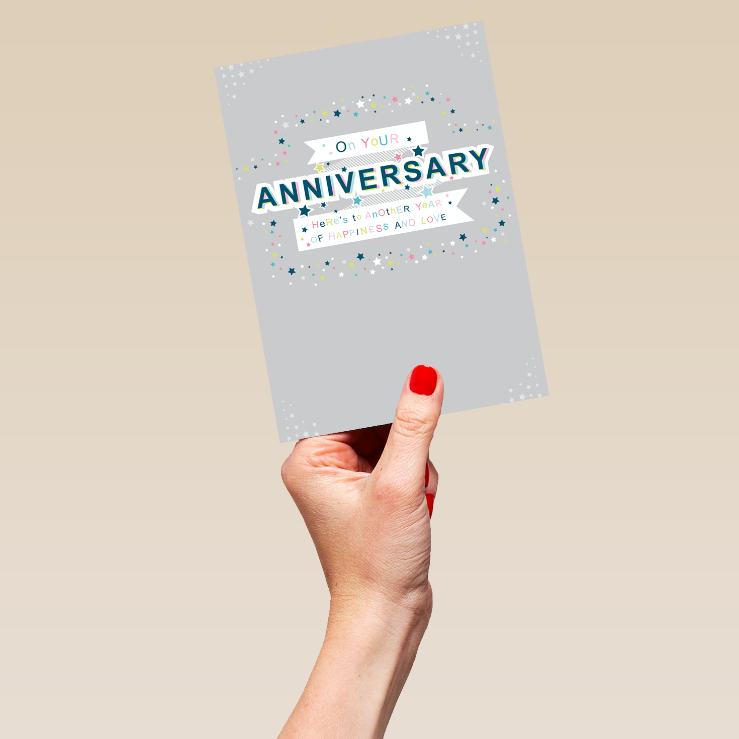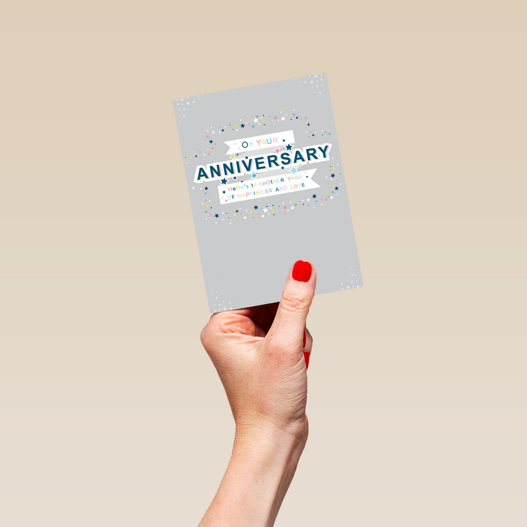 Show them you care with a personalised it's your anniversary card from Hallmark. Our anniversary cards are printed on premium quality, FSC®-certified card & delivered nationwide. This card is available as standard 12cm by 16.7cm and large 15.5cm by 21.6cm.