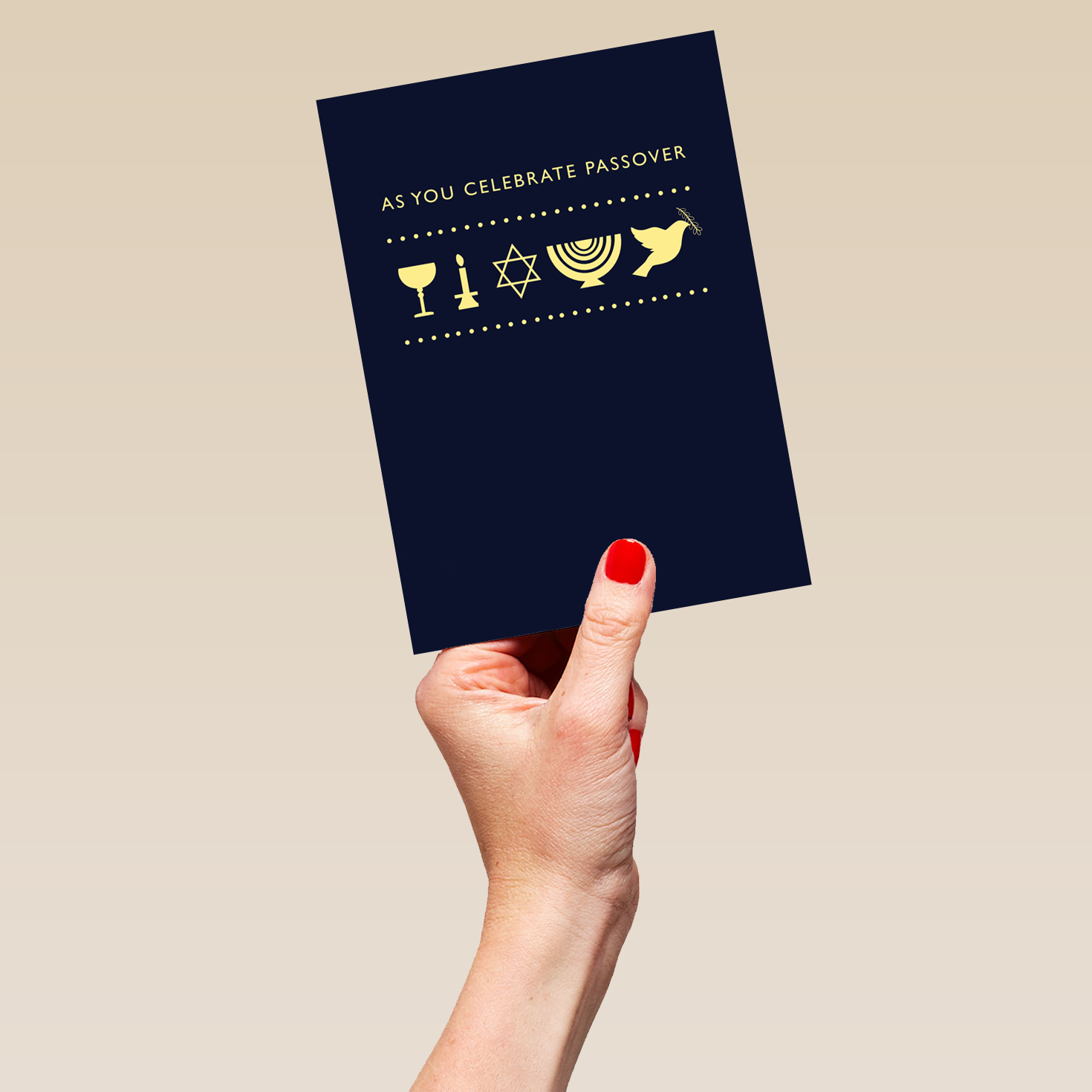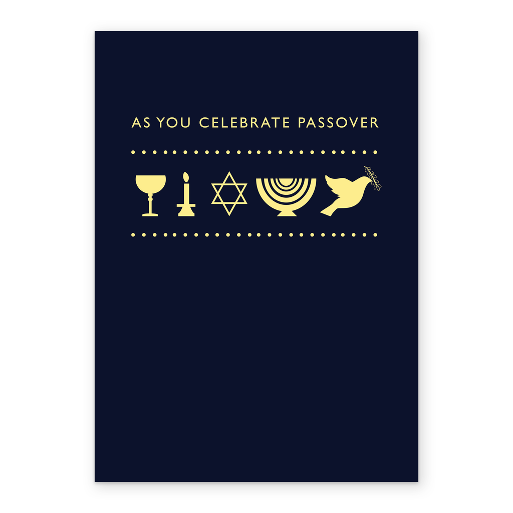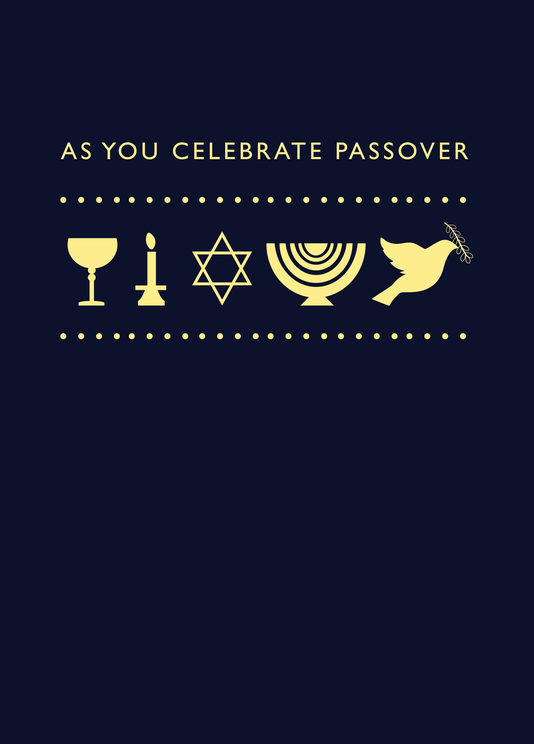 Printed on premium-quality board, this card features symbols of Judaism including the Star of David and the menorah, with the message 'As you celebrate Passover', space to personalise your message, and comes complete with a co-ordinating white envelope.