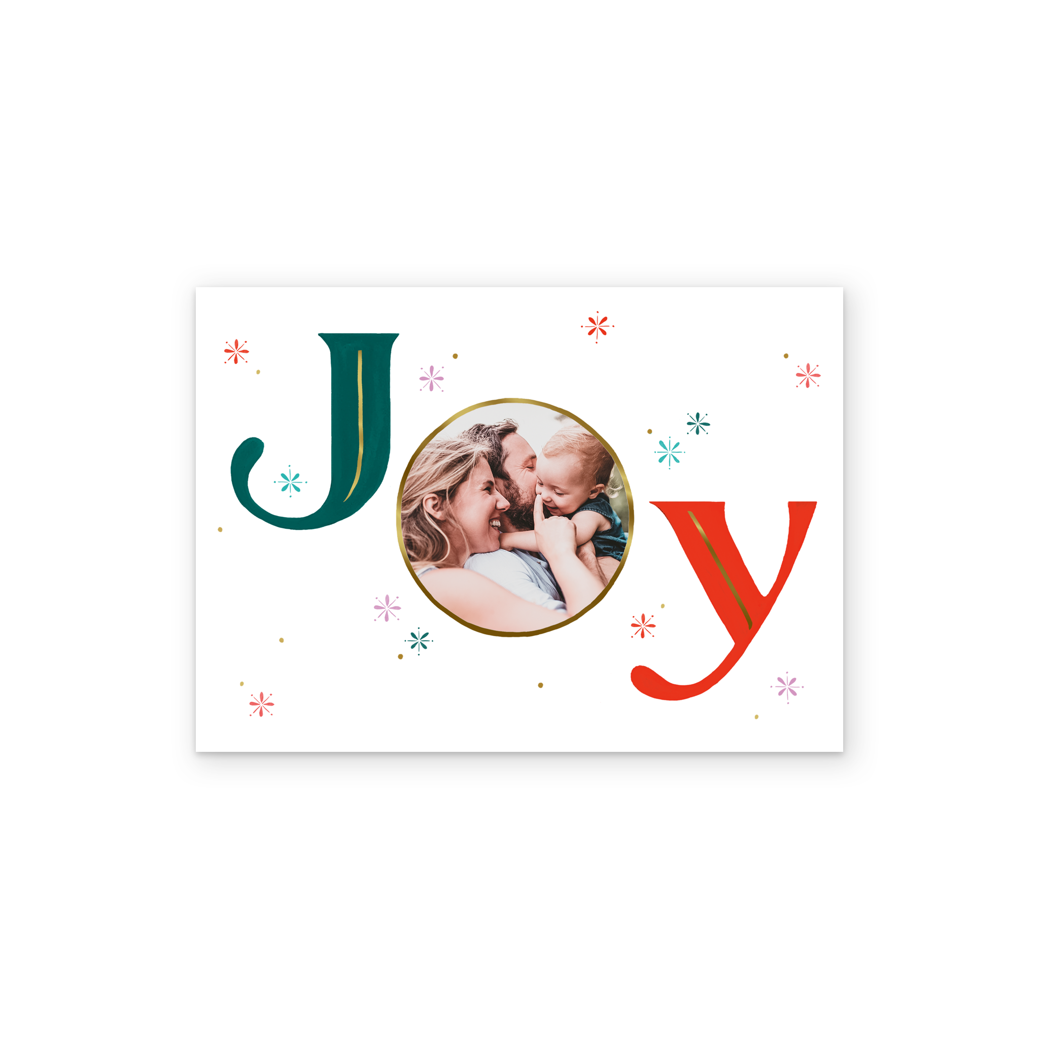Printed on premium-quality board, this card features festive lettering in red and green surrounded by colourful snowflakes against a white background, with the message 'Joy', space to upload a photo, and comes complete with a co-ordinating white envelope.