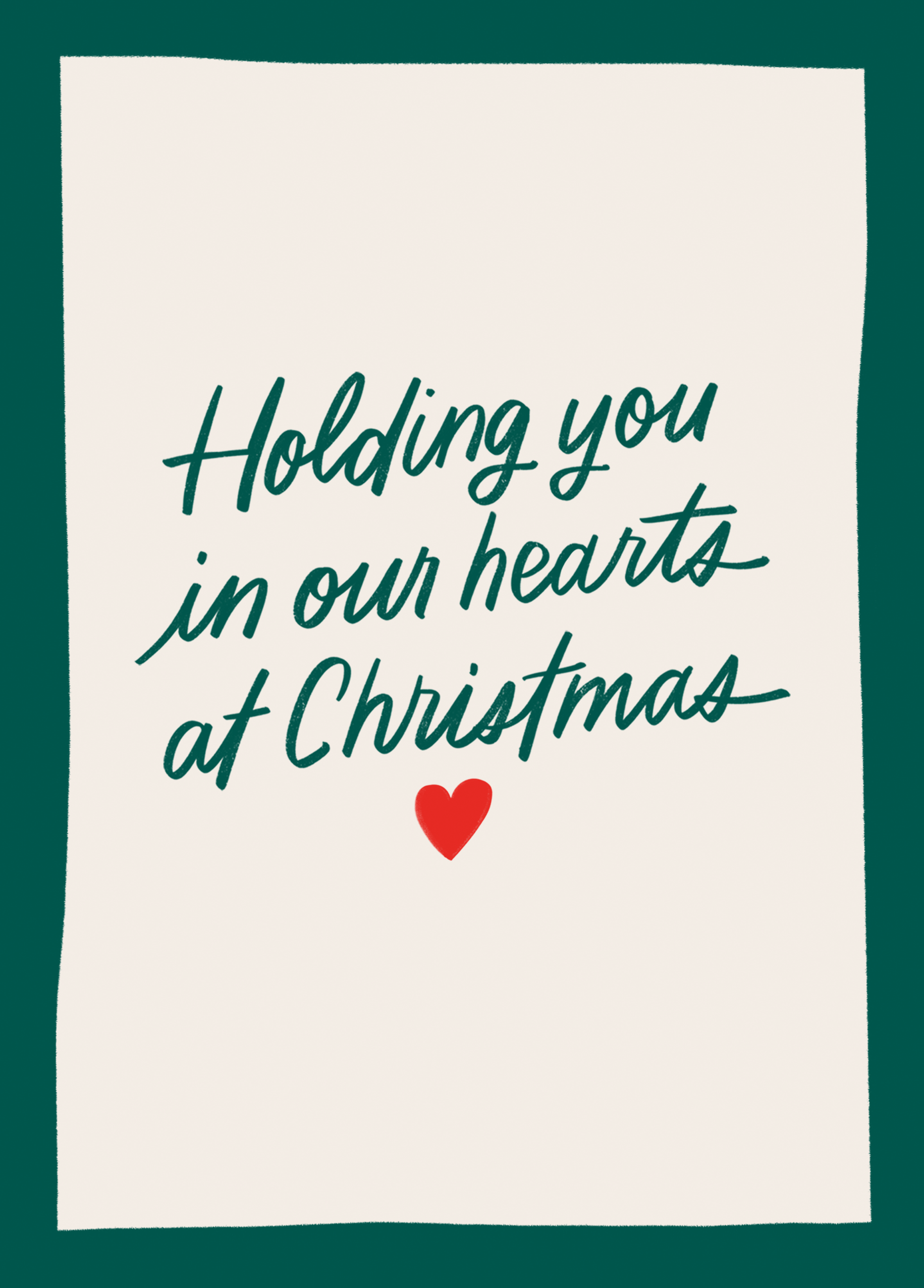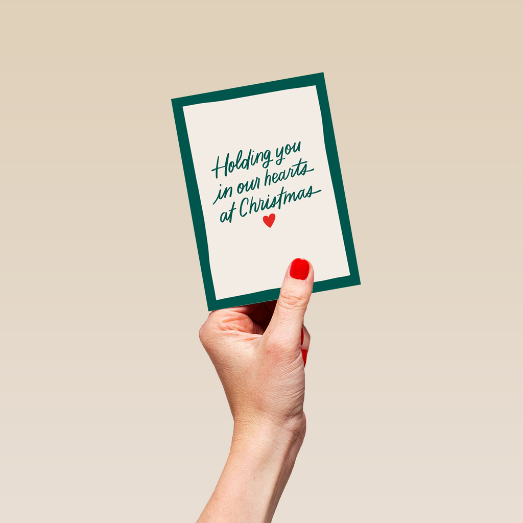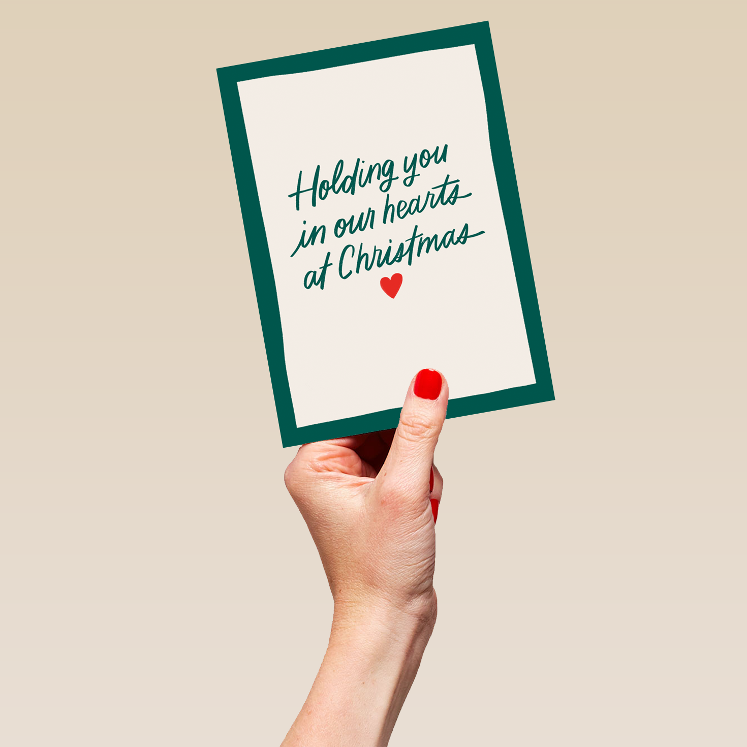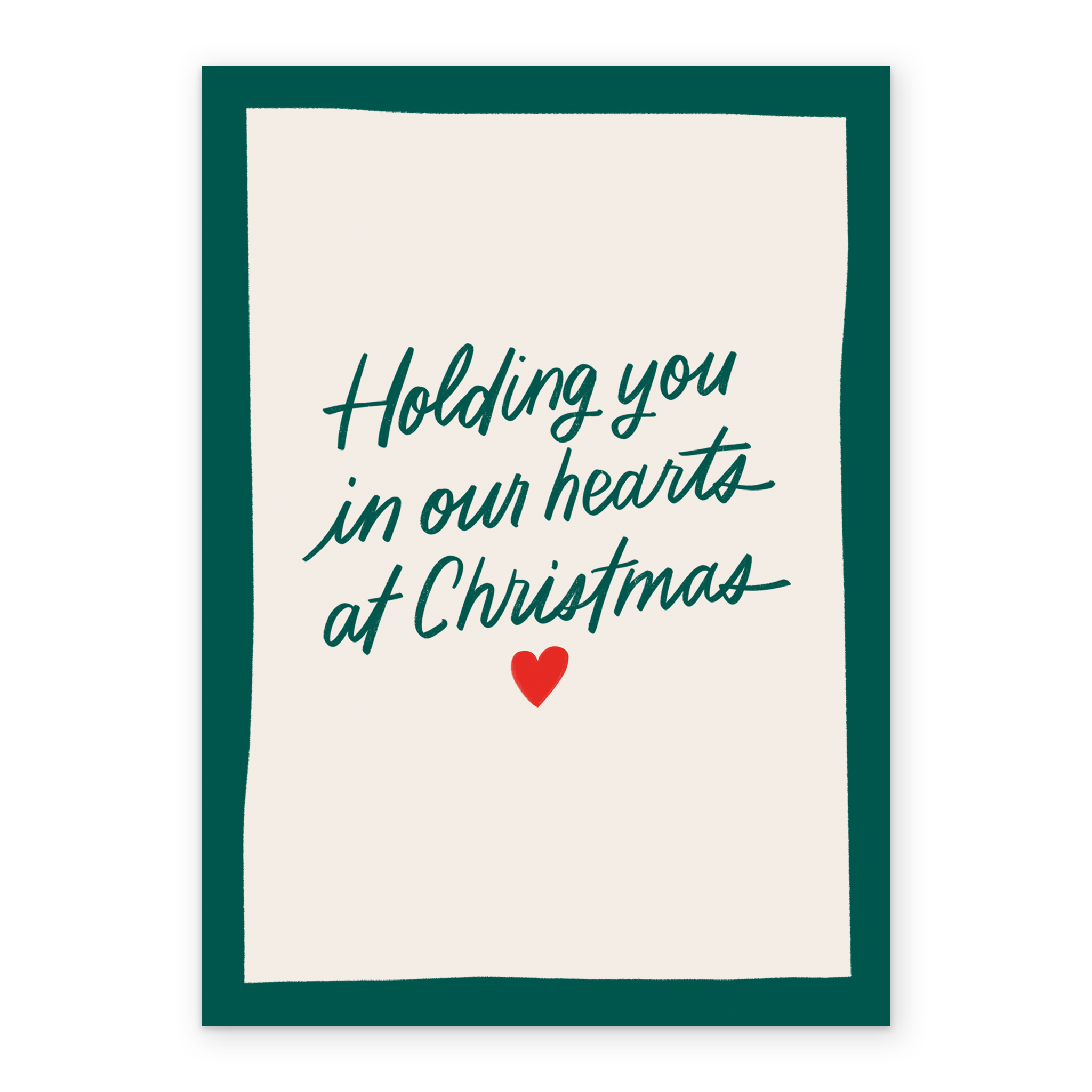 Printed on premium-quality board, this card features handwriting-styled lettering with a small red heart, with the message 'Holding you in our hearts at Christmas', and comes complete with a co-ordinating white envelope.