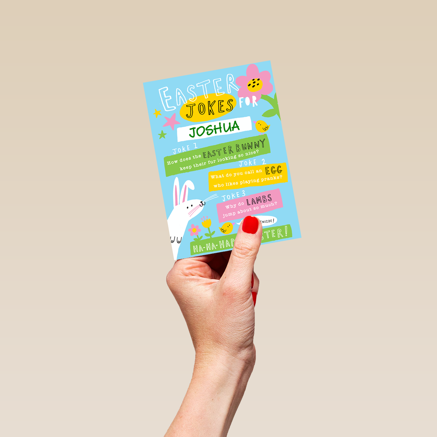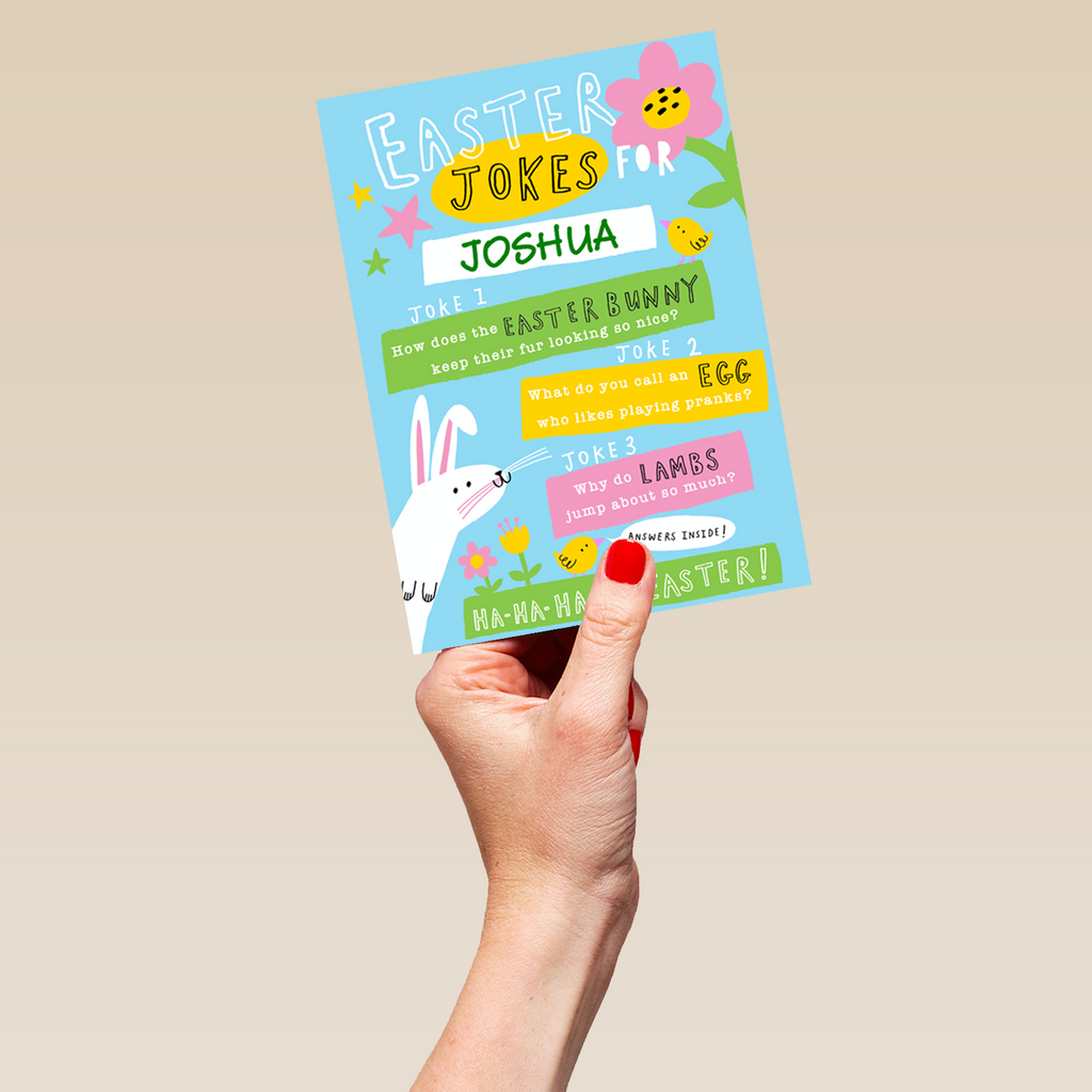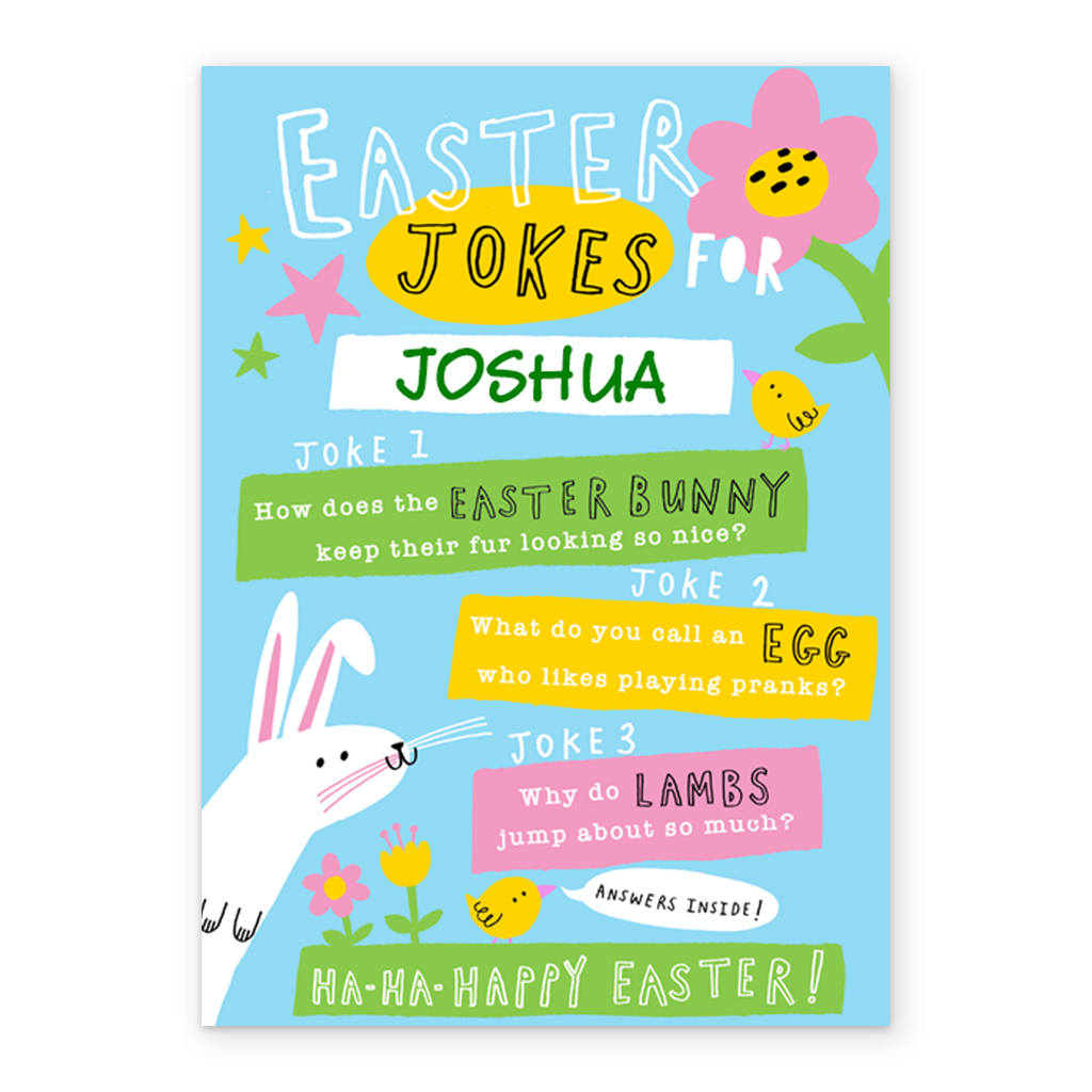 Printed on premium-quality board, this card features a contemporary illustrated Easter bunny and chicks with colourful flowers, stars and banners on a light blue background, with the message 'Easter jokes for ___. Joke 1 How does the Easter bunny keep their fur looking so nice? Joke 2 What do you call an egg who likes playing pranks? Joke 3 Why do Lambs jump about so much? Ha-ha-happy Easter!', space to personalise a name, and comes complete with a co-ordinating white envelope.
