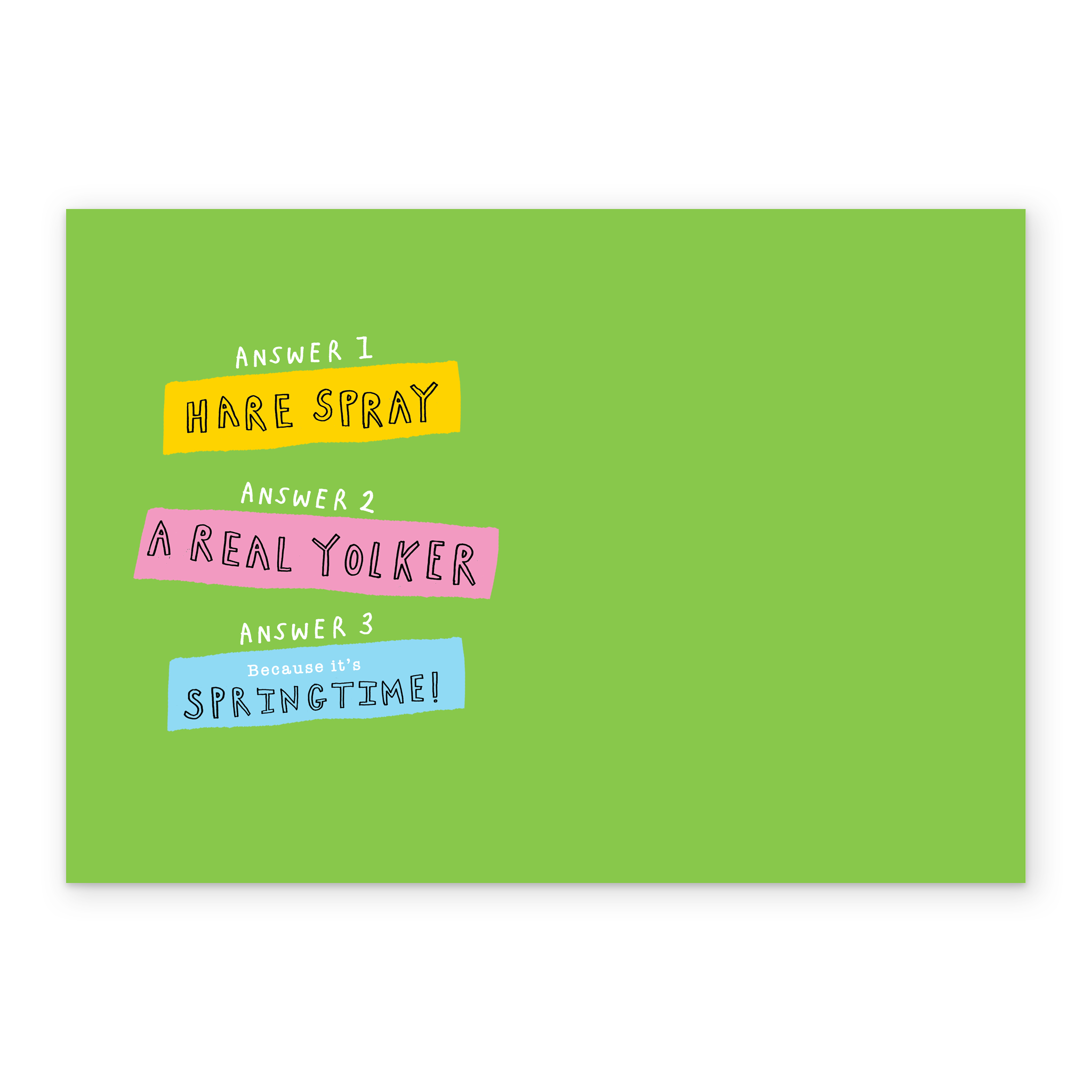 Message inside reads: Answer 1 Hare spray. Answer 2 A real yolker. Answer 3 Because it's springtime!