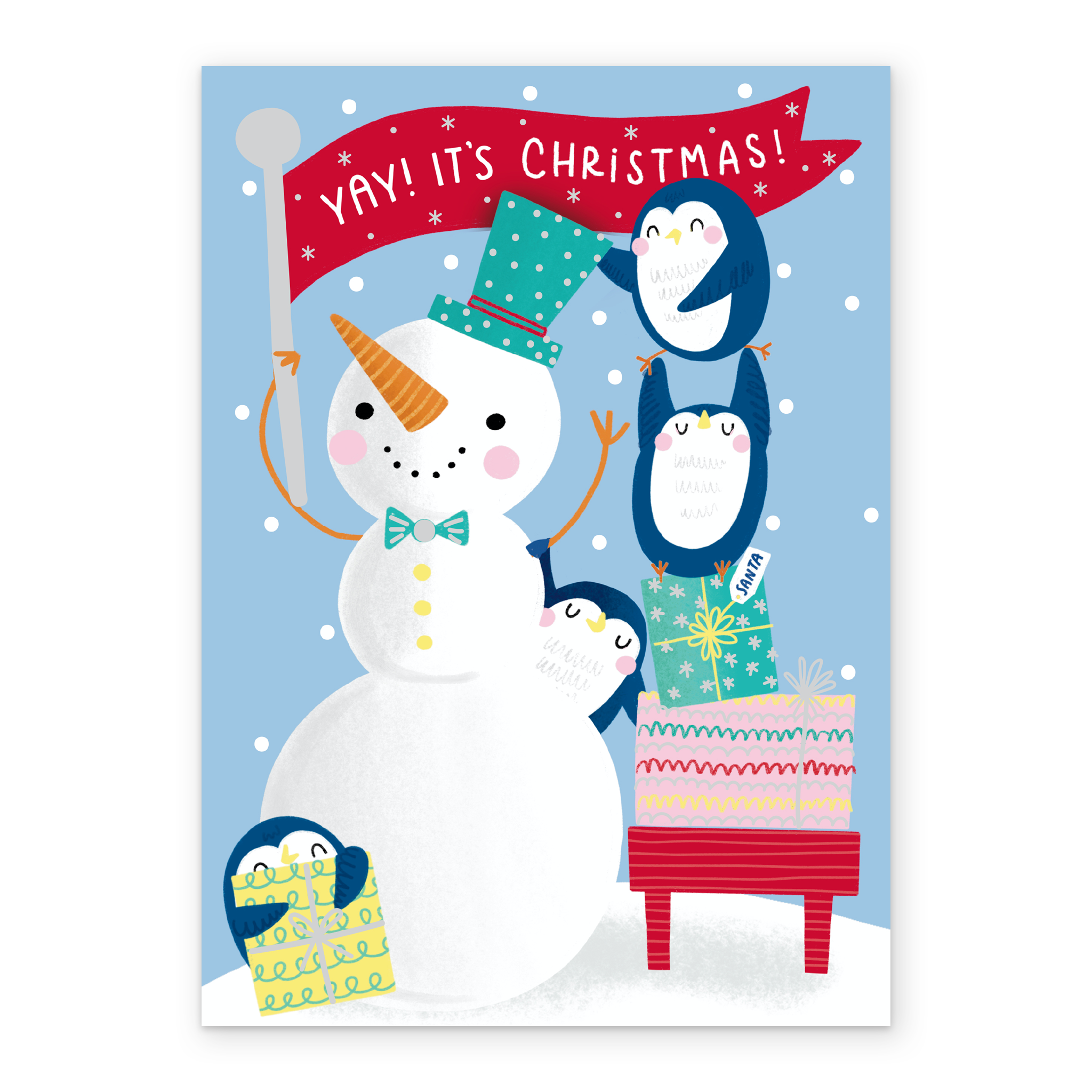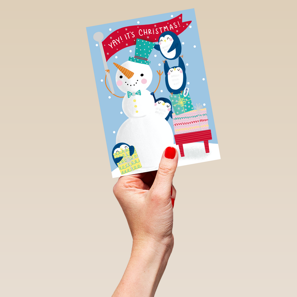 Personalised Kids Snowman & Penguins Flag Christmas Card