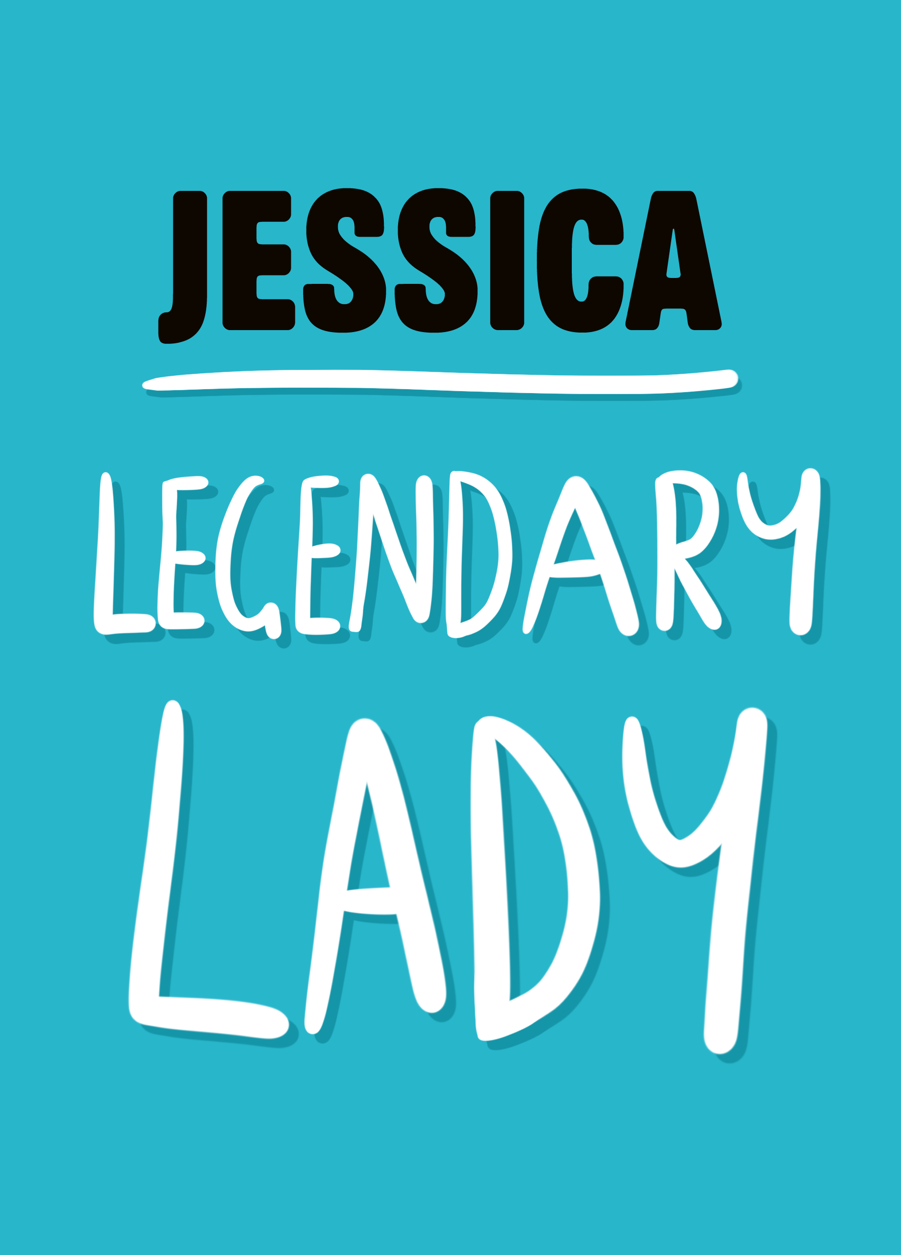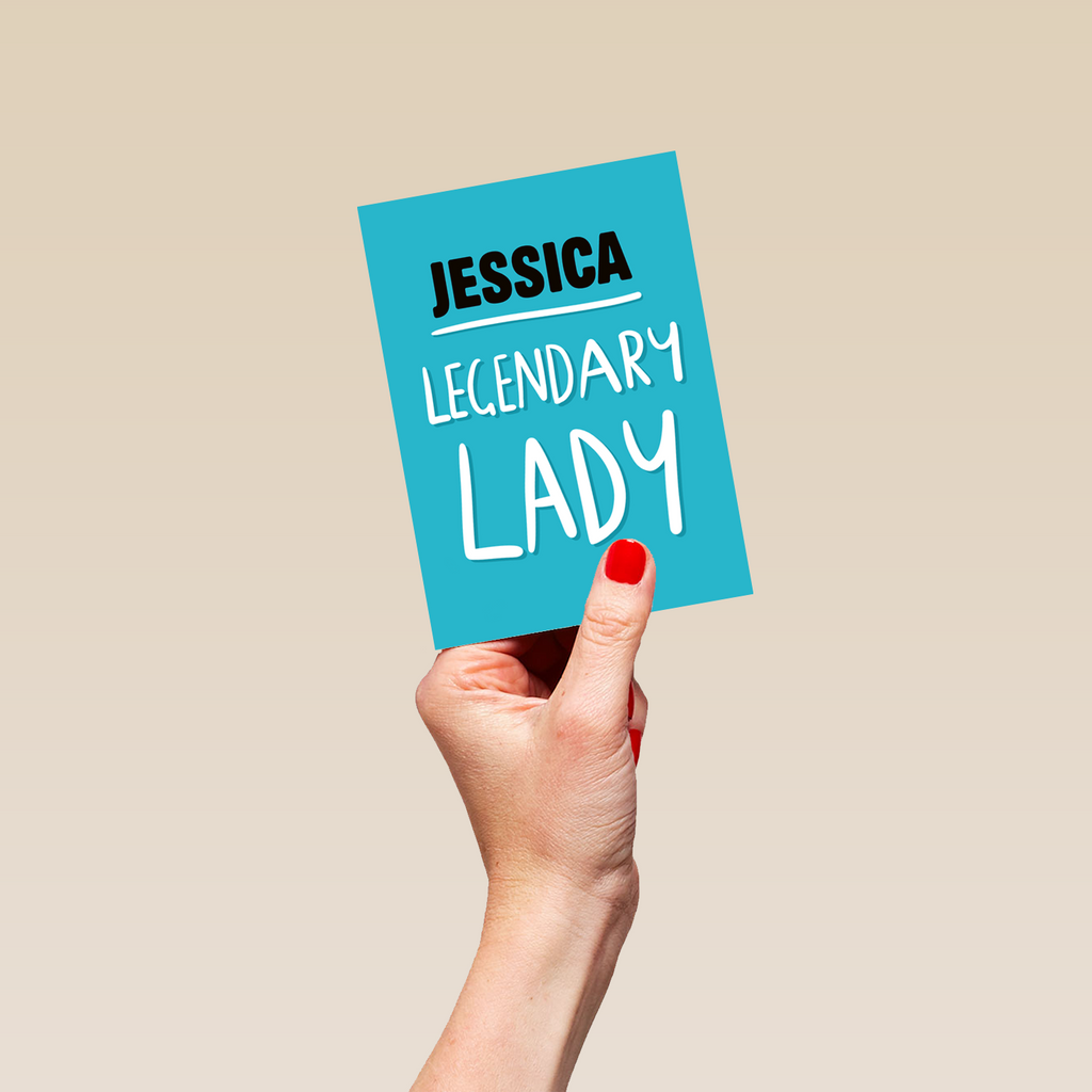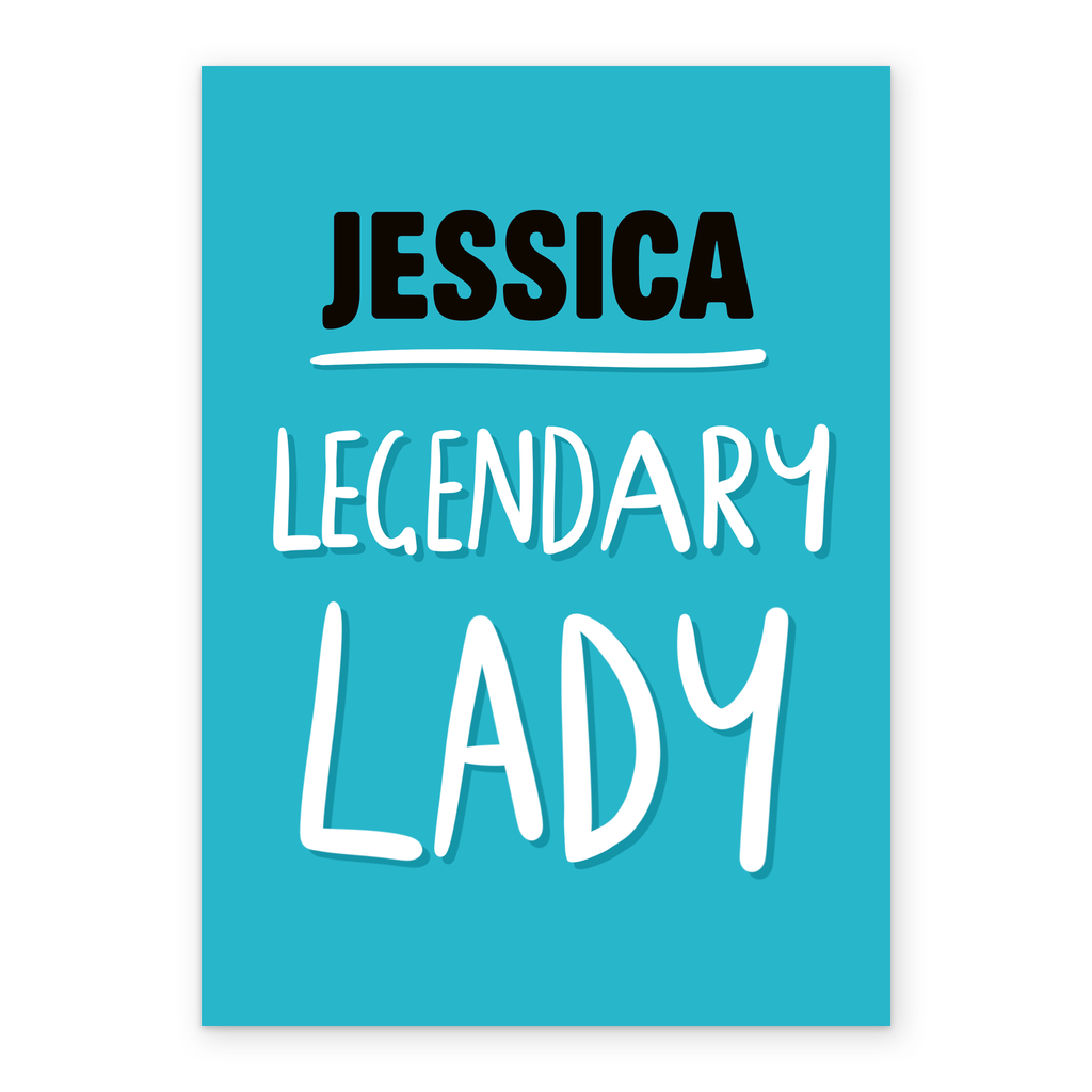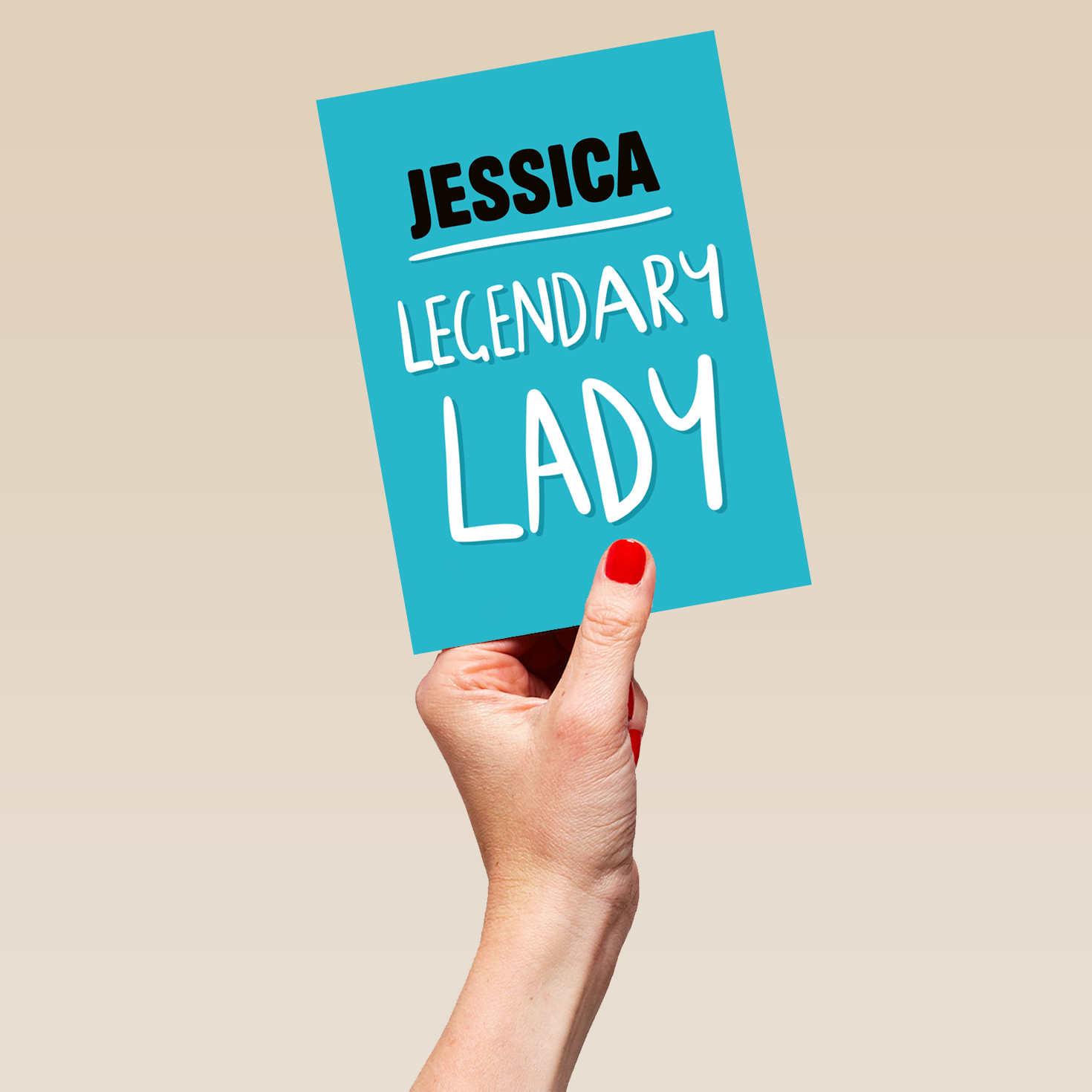 Printed on premium-quality board, this card features contemporary shadow effect white text on a turquoise background, with the message 'Legendary Lady', space to personalise a name, and comes complete with a co-ordinating white envelope.