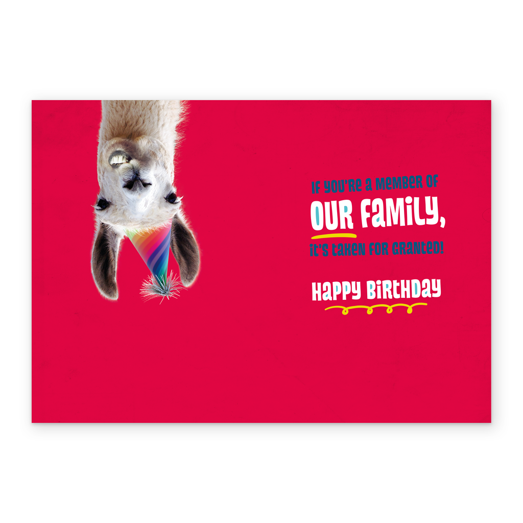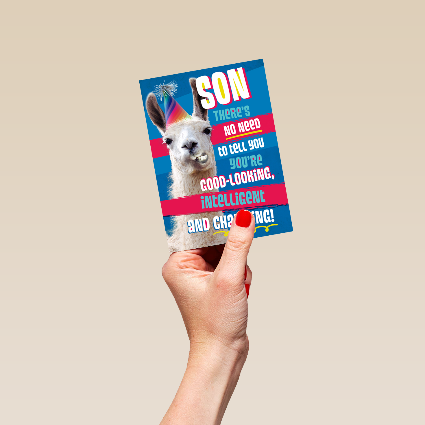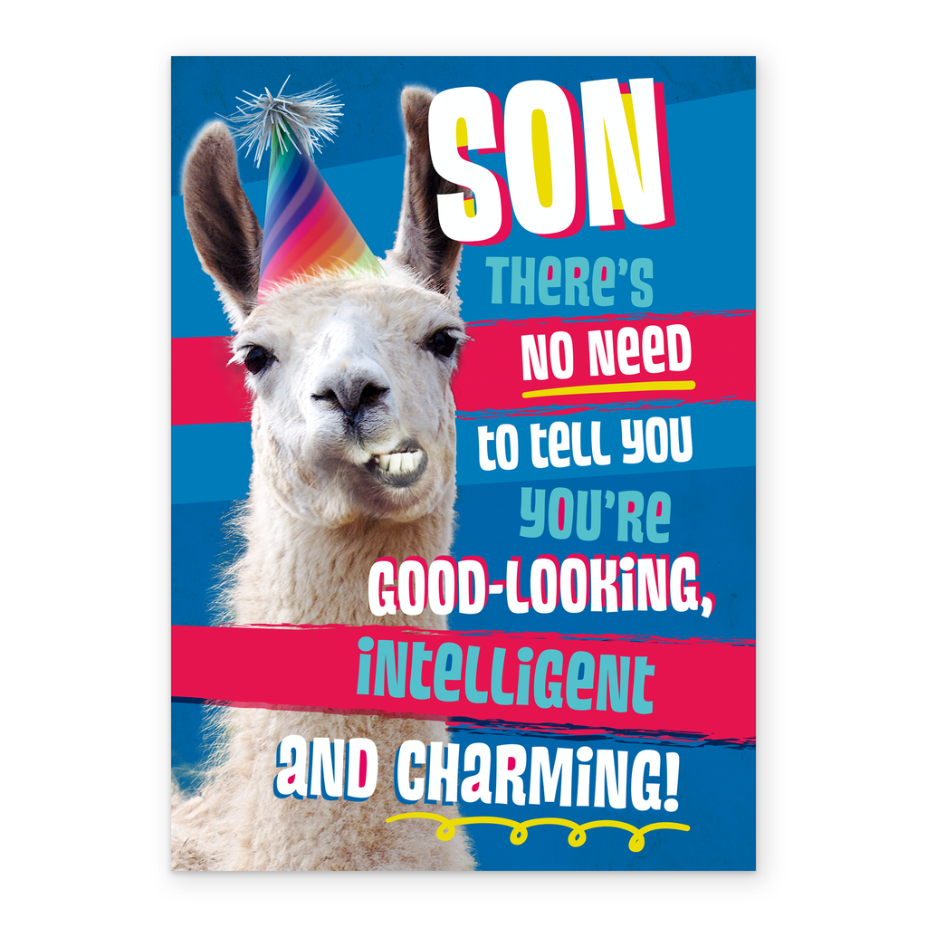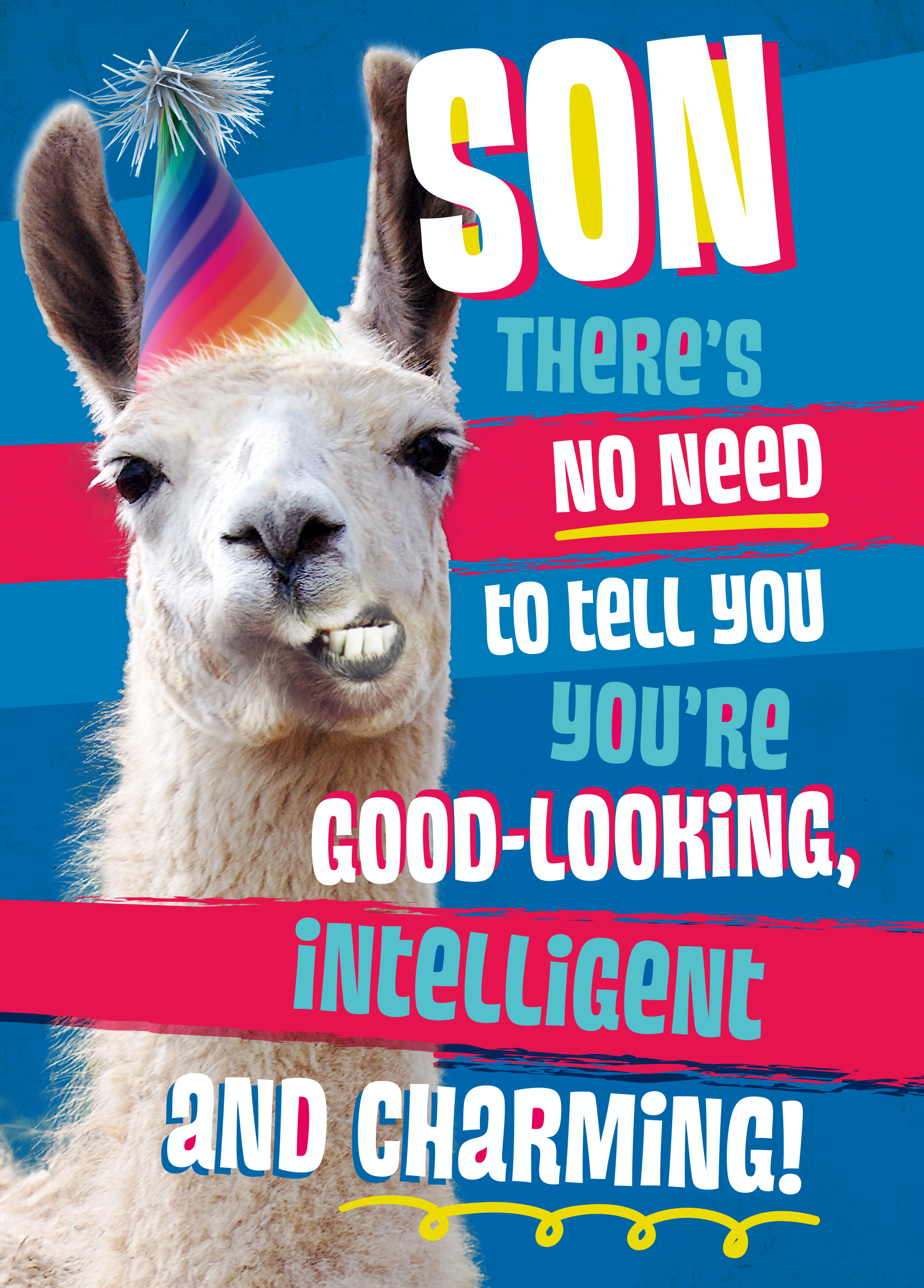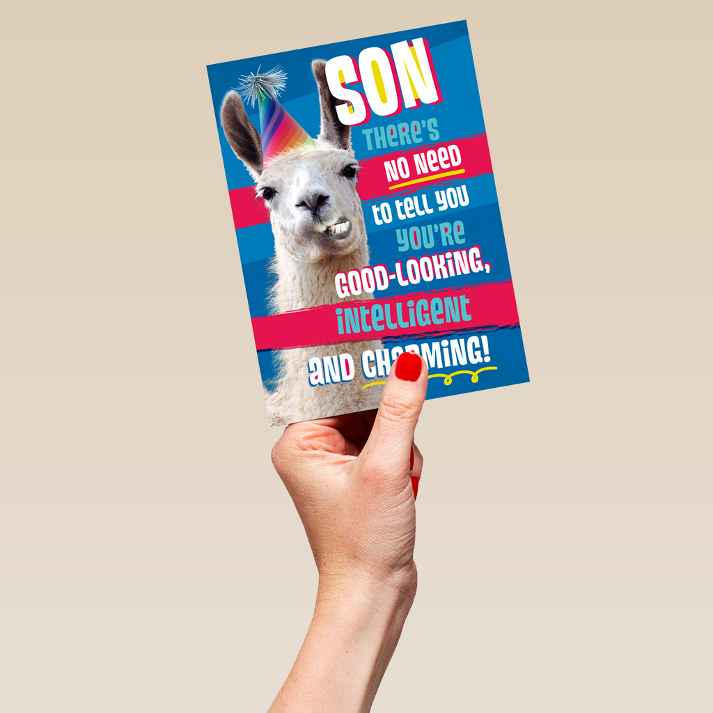 Show them you care with a personalised llama charming son birthday card from Hallmark. Our birthday cards are printed on premium quality, FSC®-certified card & delivered nationwide. This card is available as standard 12cm by 16.7cm and large 15.5cm by 21.6cm.