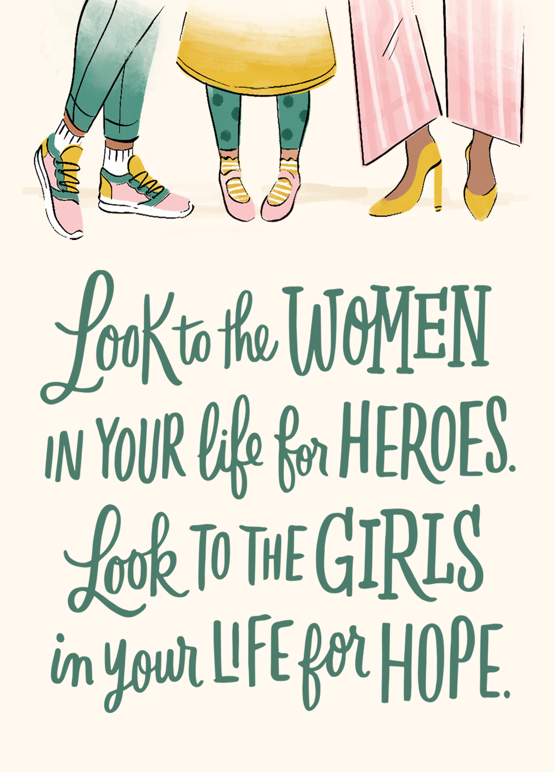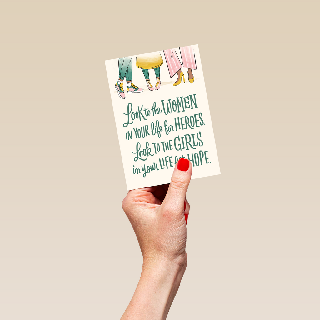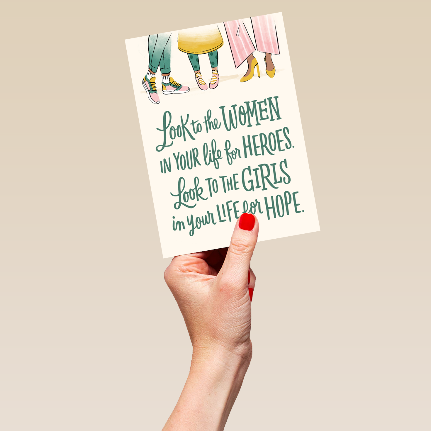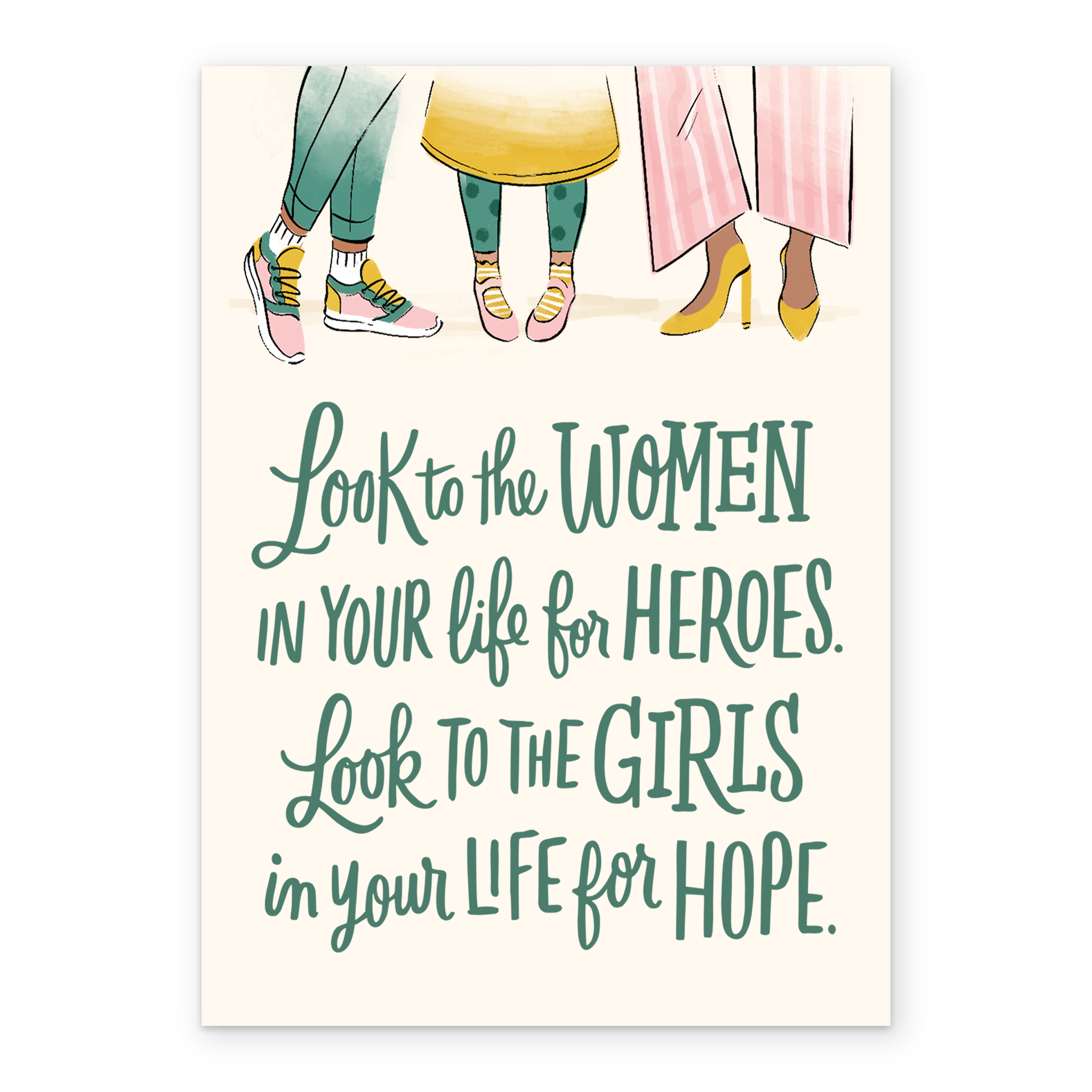 Printed on premium-quality board, this card features an illustration of 3 sets of feet with an empowering message, with the message 'Look to the women in your life for heroes. Look to the girls in your life for hope.', and comes complete with a co-ordinating white envelope.