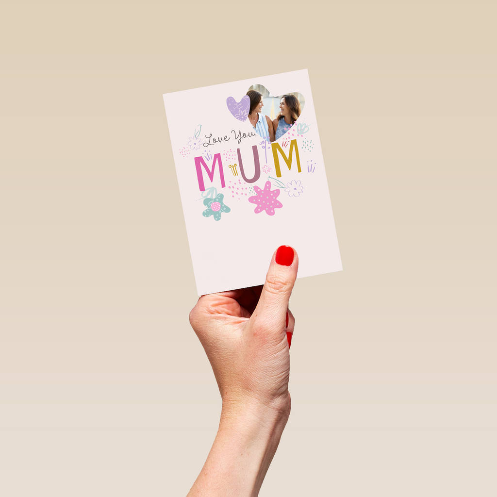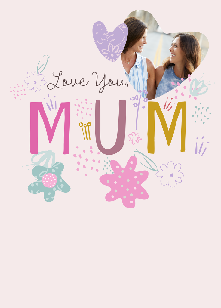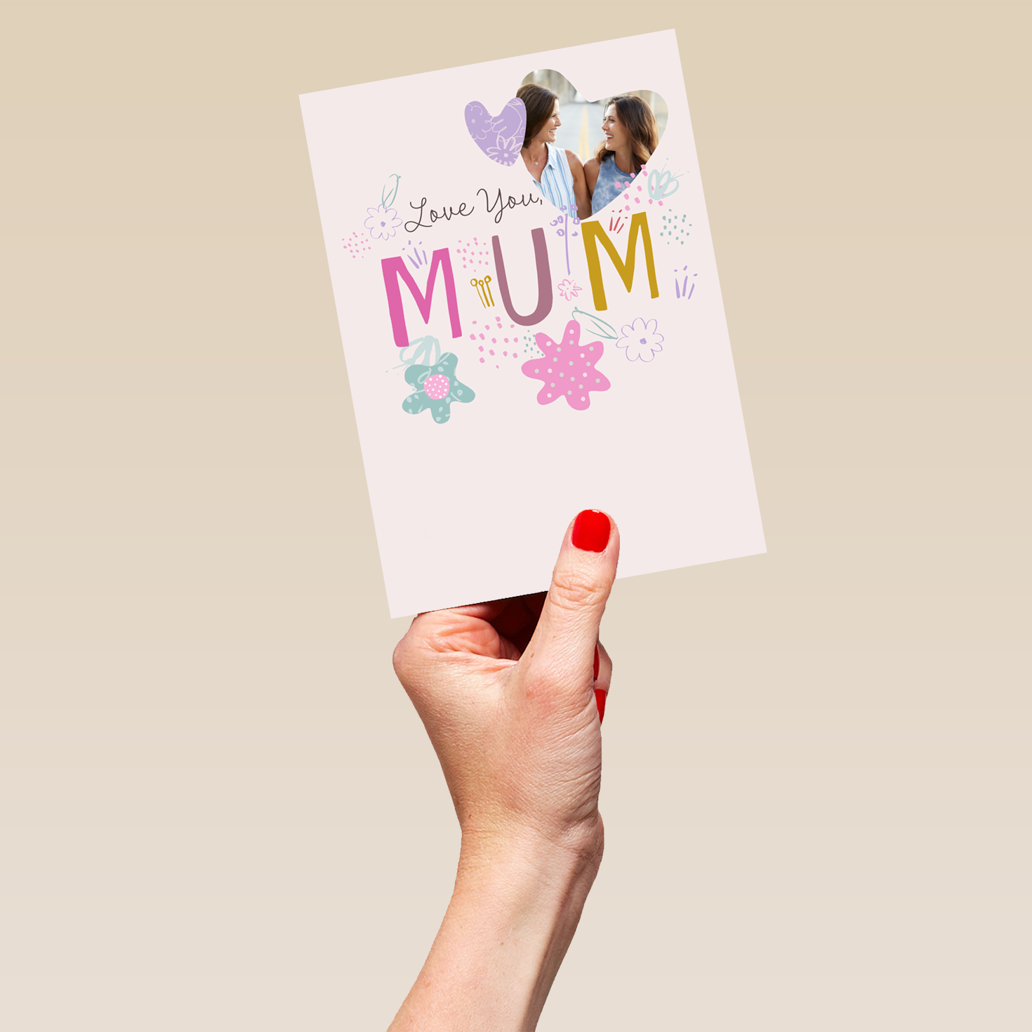 Printed on premium-quality board, this card features a colourful text, flowers and hearts design, with the message 'Love you, mum', space to upload a photo, and comes complete with a co-ordinating white envelope.