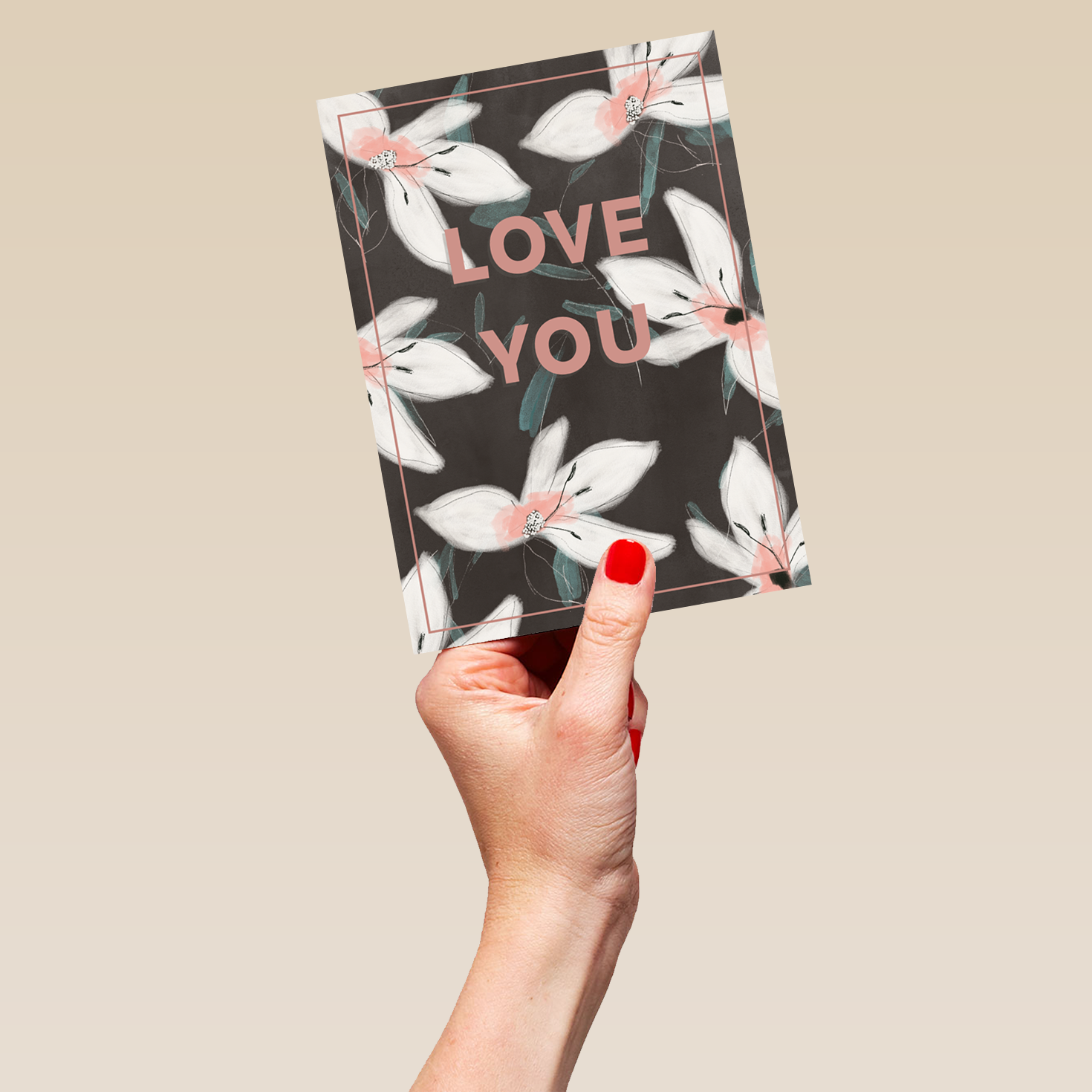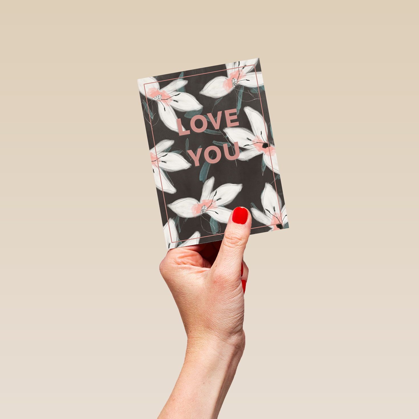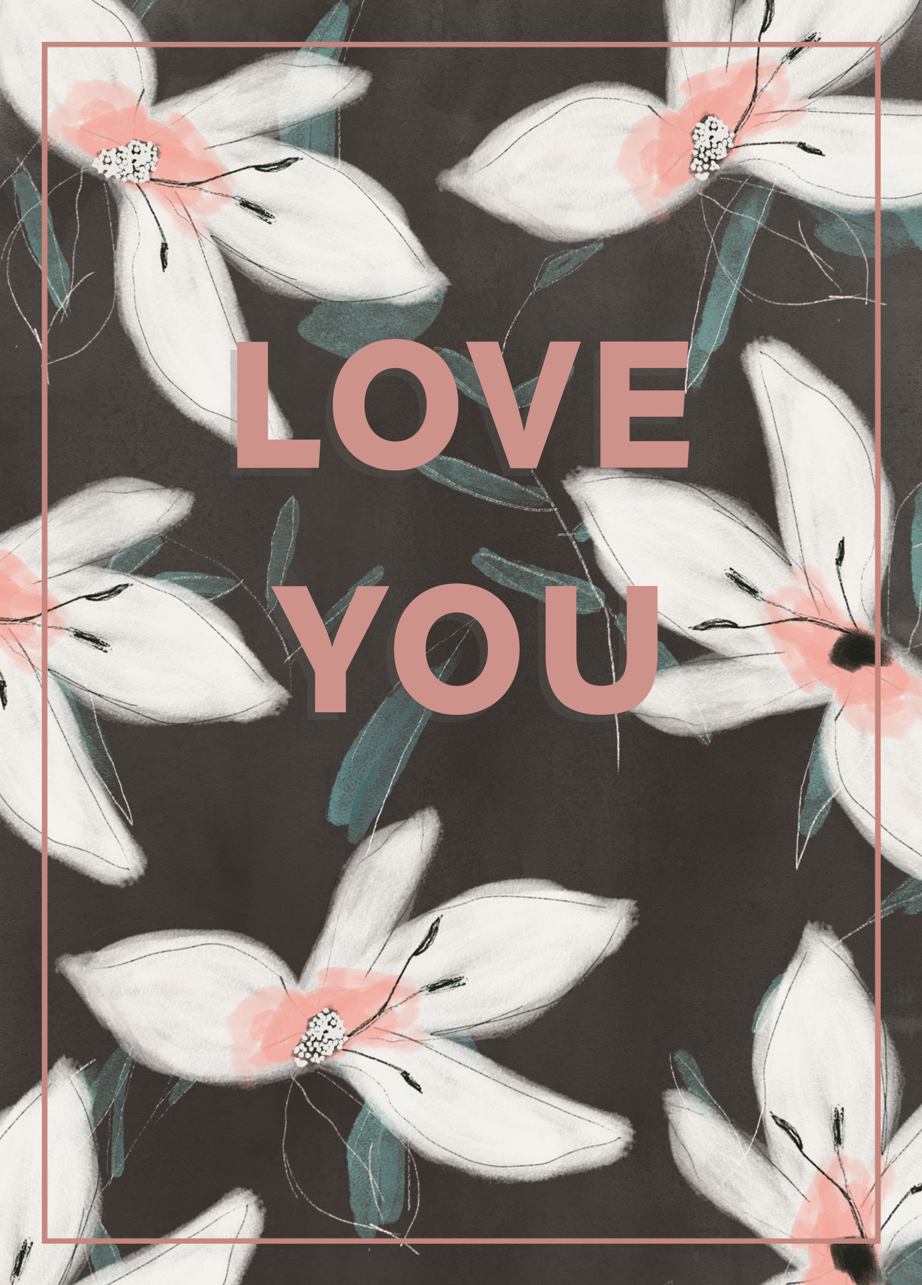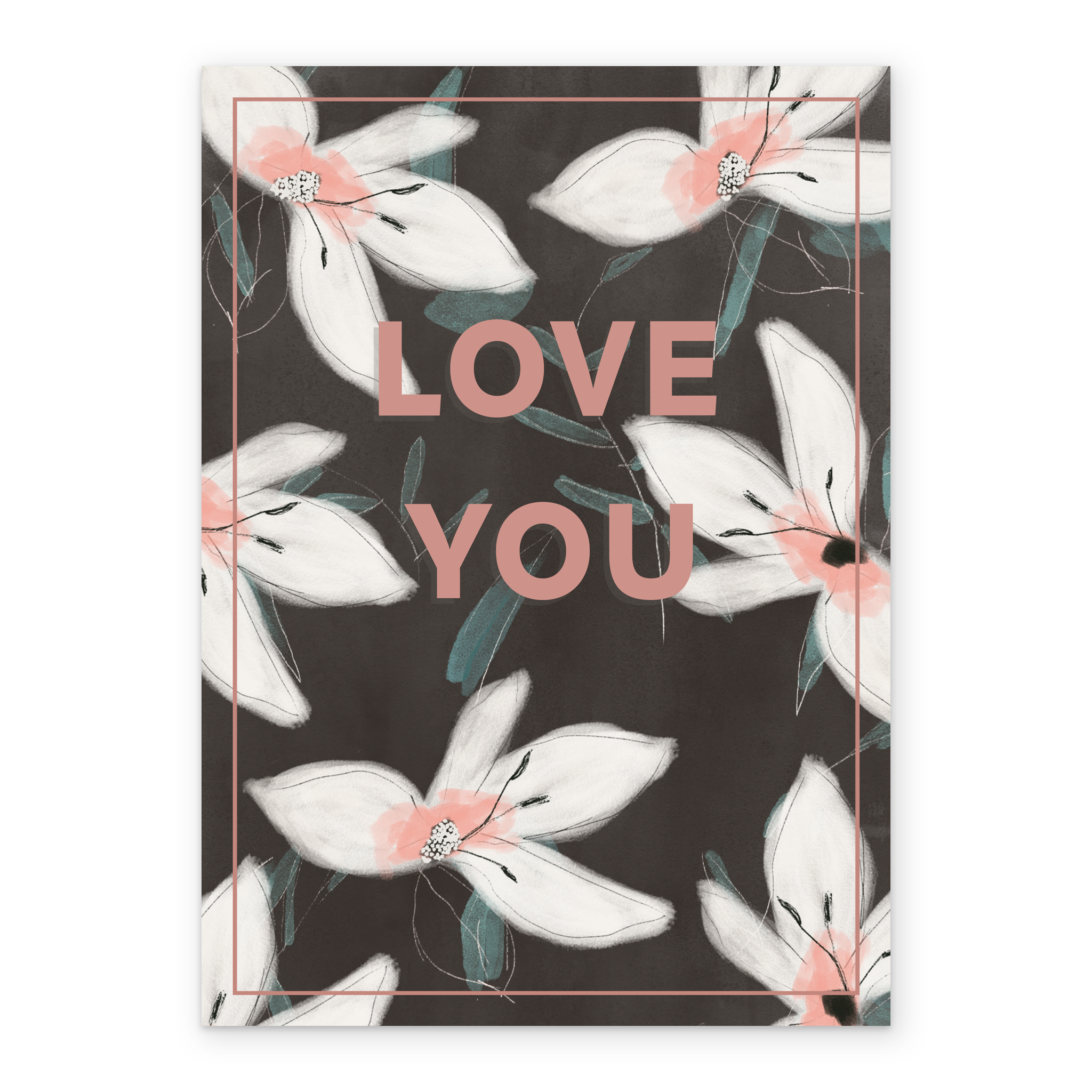 Printed on premium-quality board, this card features stylised white and pink flower illustrations set against a black background surrounding blocky pink lettering, with the message 'Love You', and comes complete with a co-ordinating white envelope.