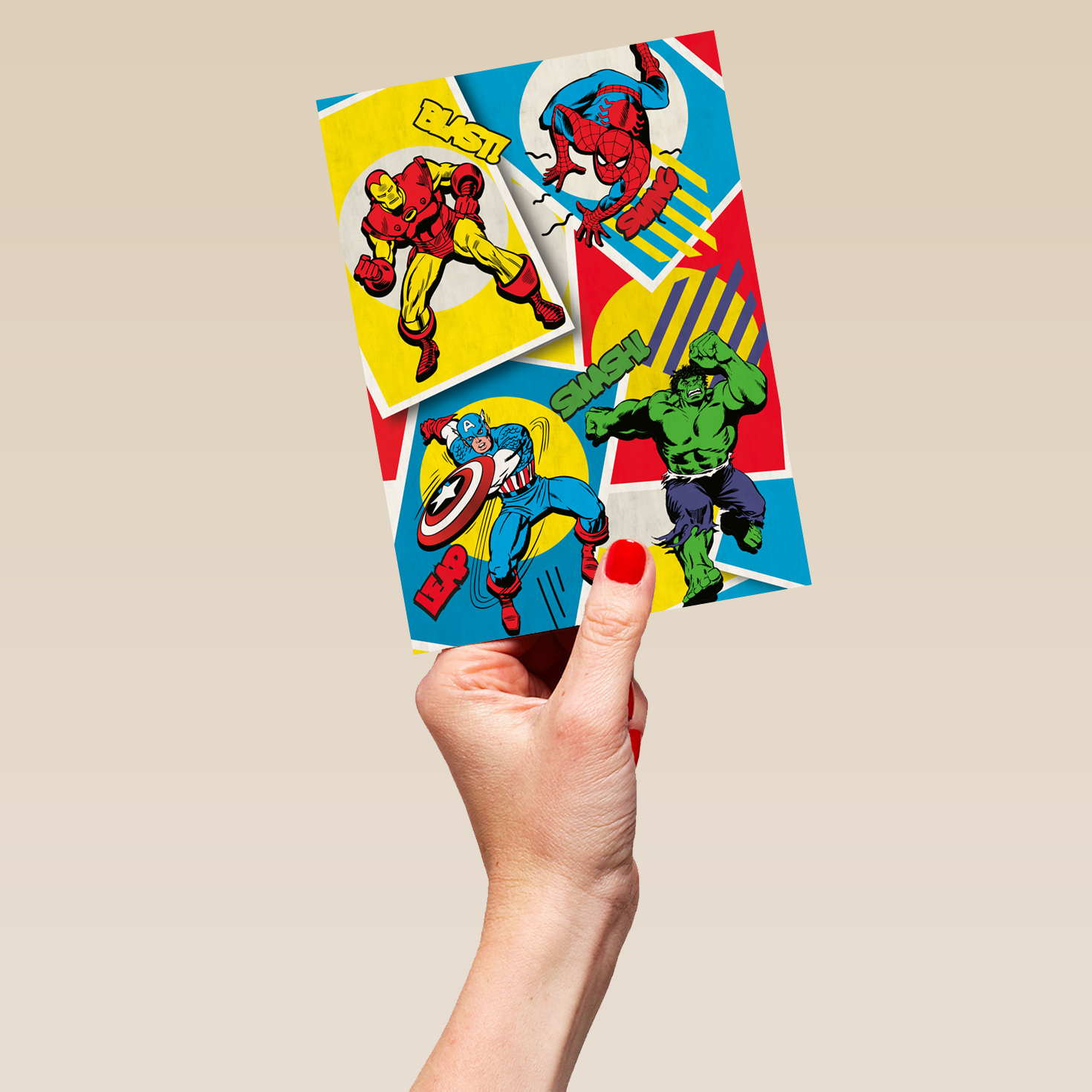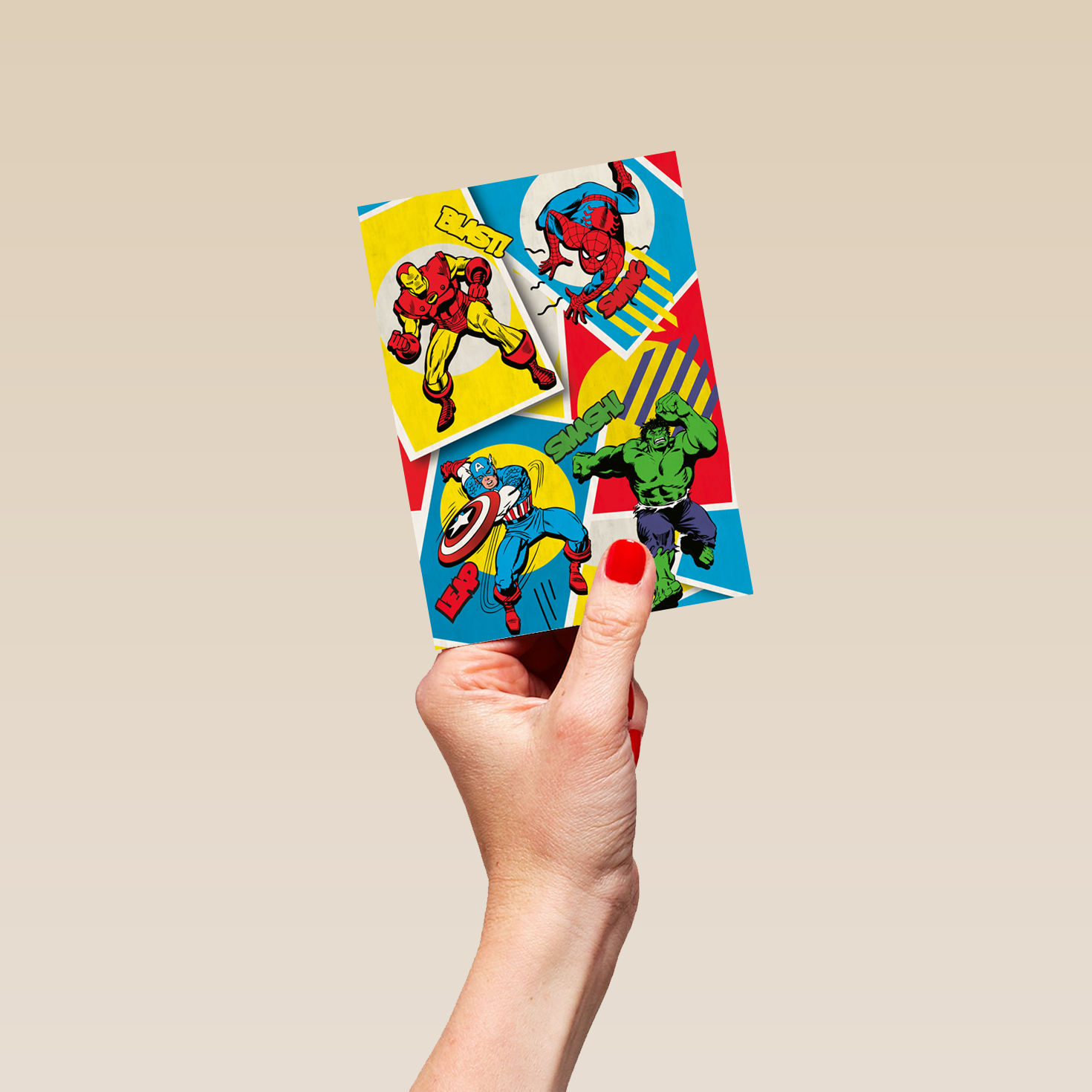 Show them you care with a personalised MARVEL Avengers comic book card from Hallmark. Our greetings cards are printed on premium quality, FSC®-certified card & delivered nationwide. This card is available as standard 12cm by 16.7cm and large 15.5cm by 21.6cm.
