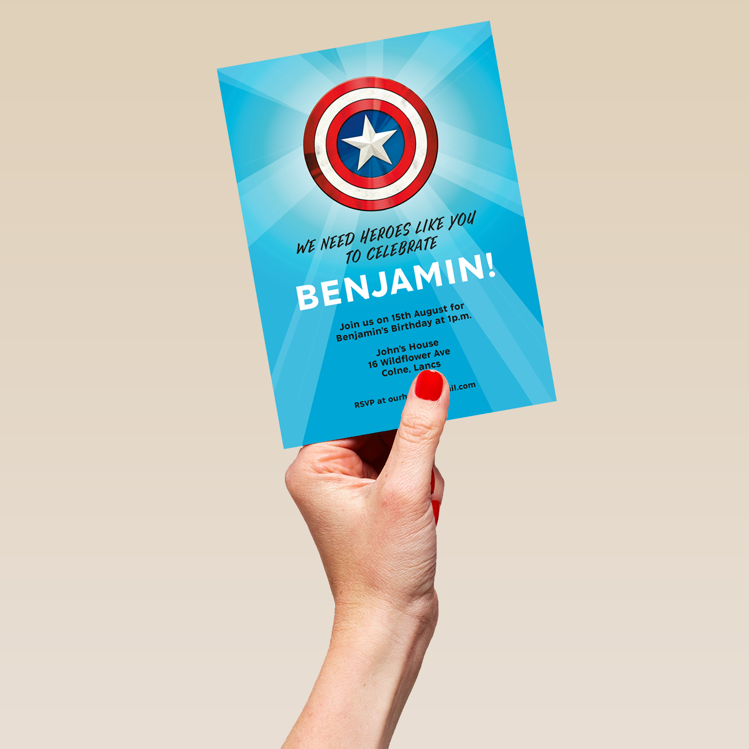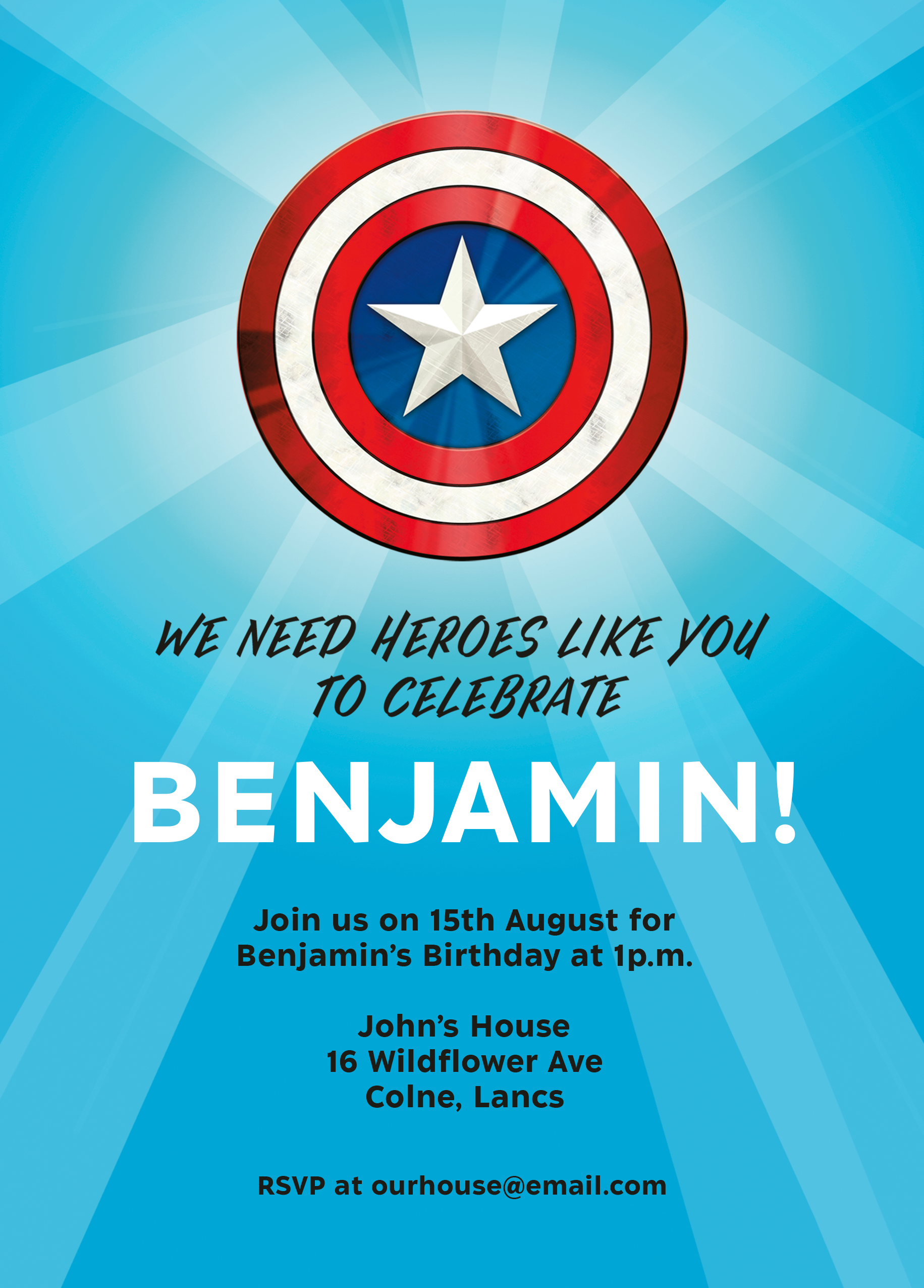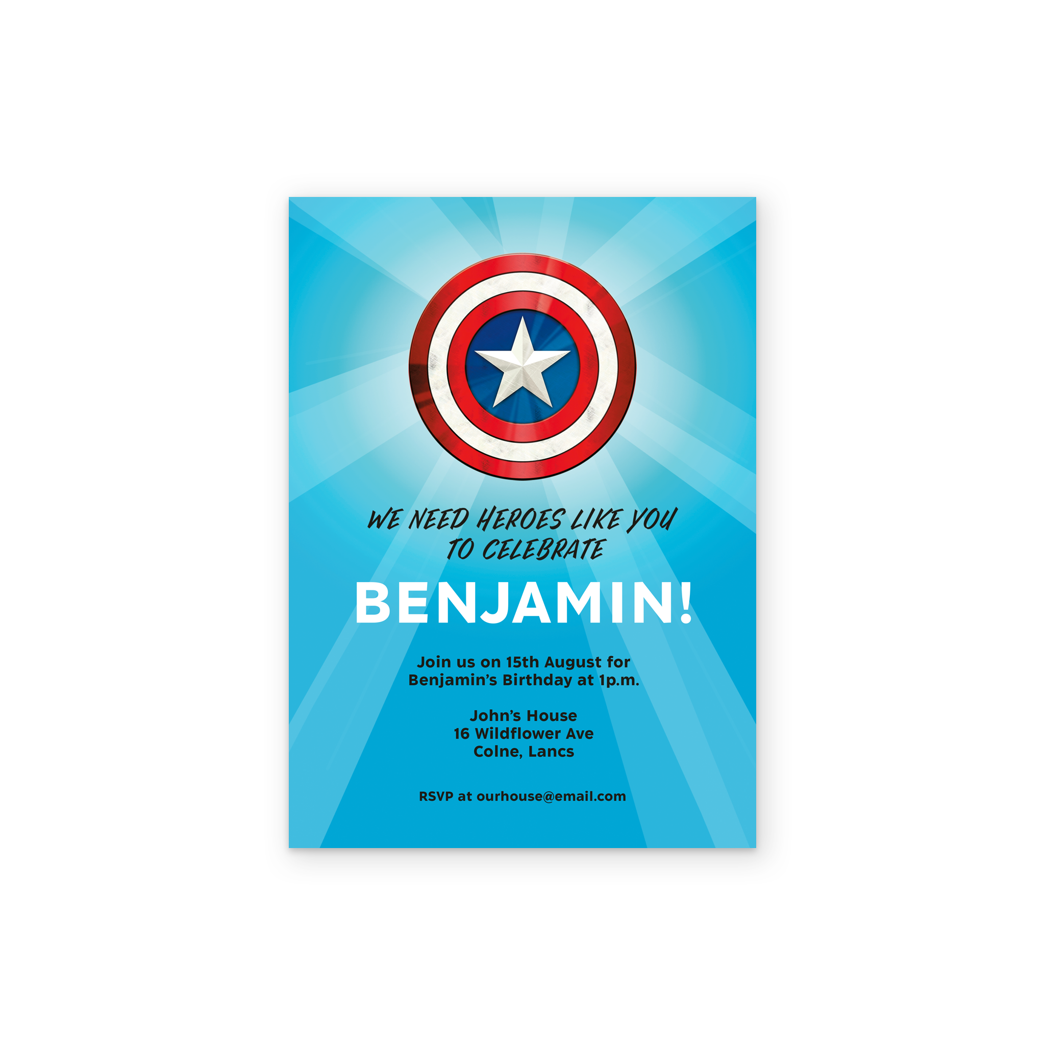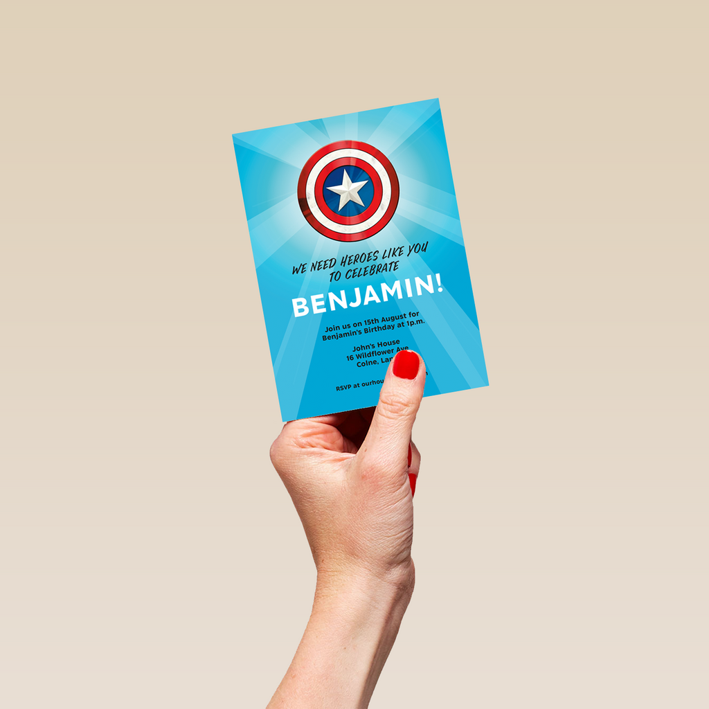 Assemble the gang for a special celebration, with this eye-catching personalised party invitation inspired by MARVEL's Captain America.