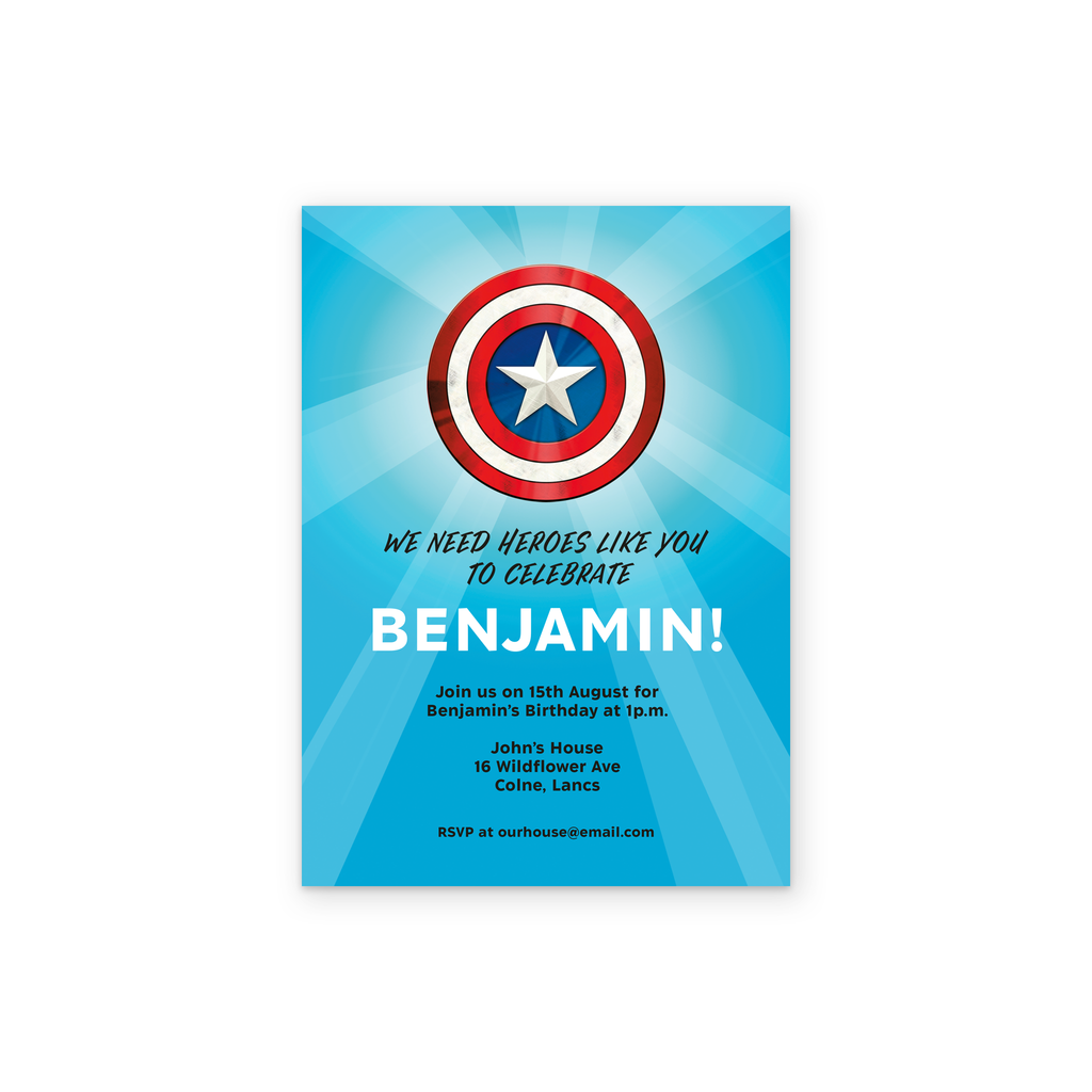 Printed on premium-quality board, this card features Captain America's iconic shield set against a blue background with a starburst effect behind the shield and black and white lettering below, with the message 'We need heroes like you to celebrate [NAME]! [PARTY DETAILS]', space to personalise your message, and comes complete with a co-ordinating white envelope.