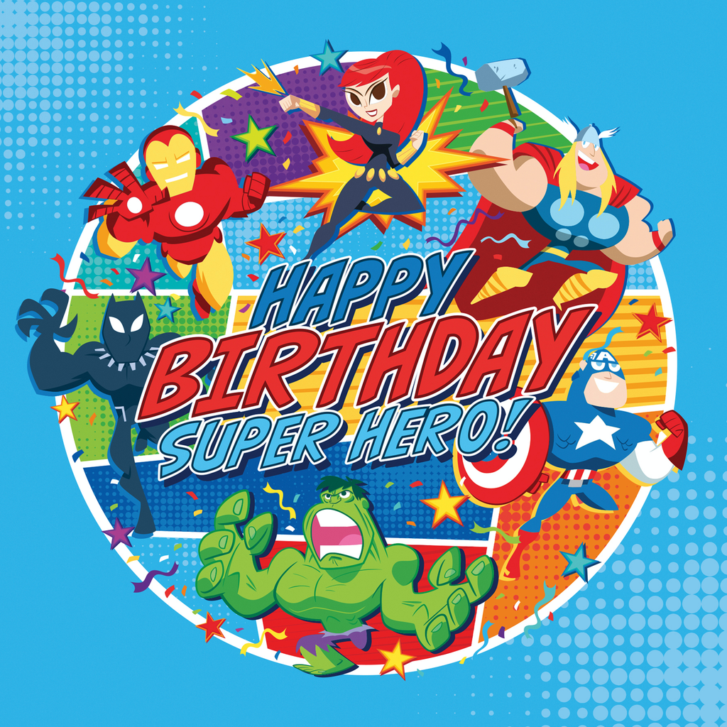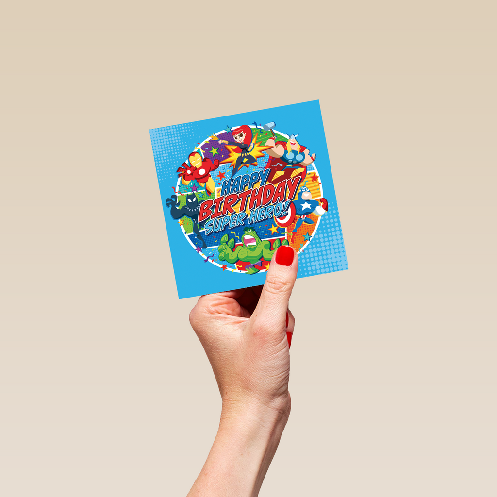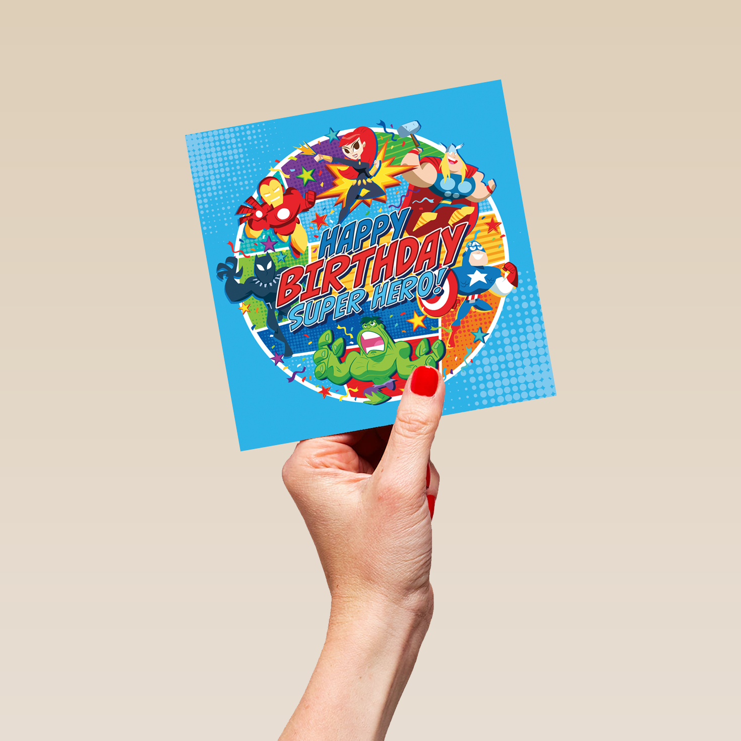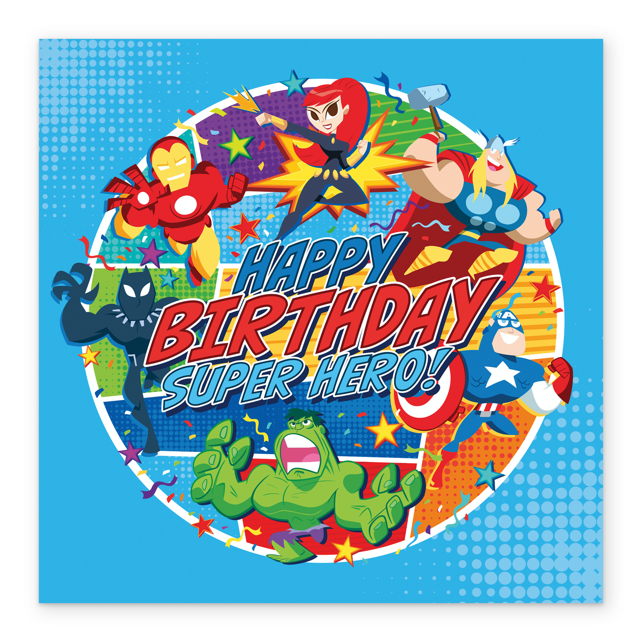 Show them you care with a personalised Disney Marvel colourful superheroes birthday card from Hallmark. Our greetings cards are printed on premium quality, FSC®-certified card & delivered nationwide. This card is available as standard 12cm by 12cm and large 15cm by 15cm.