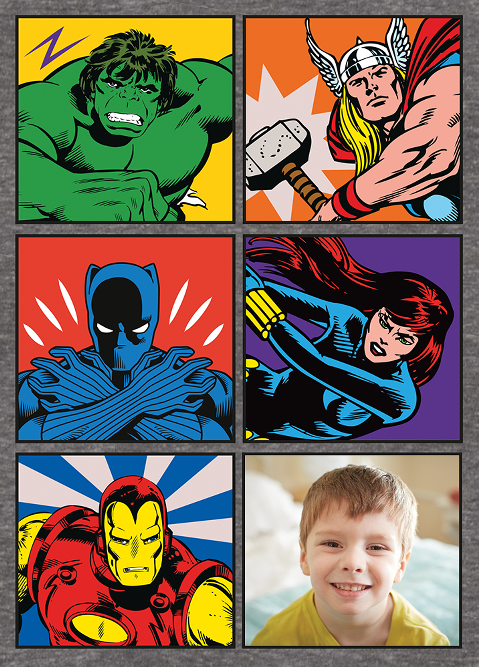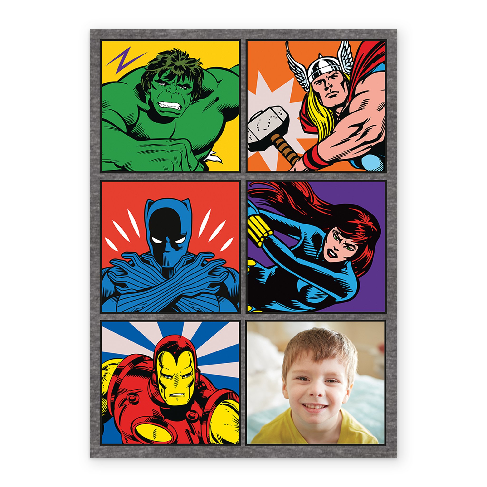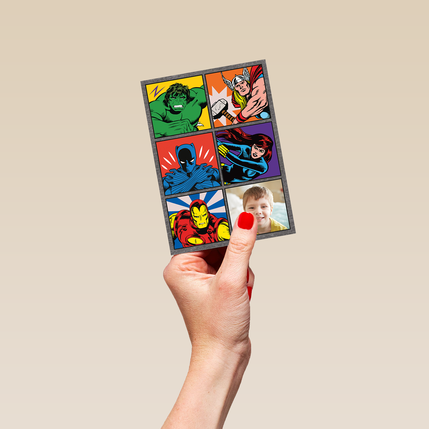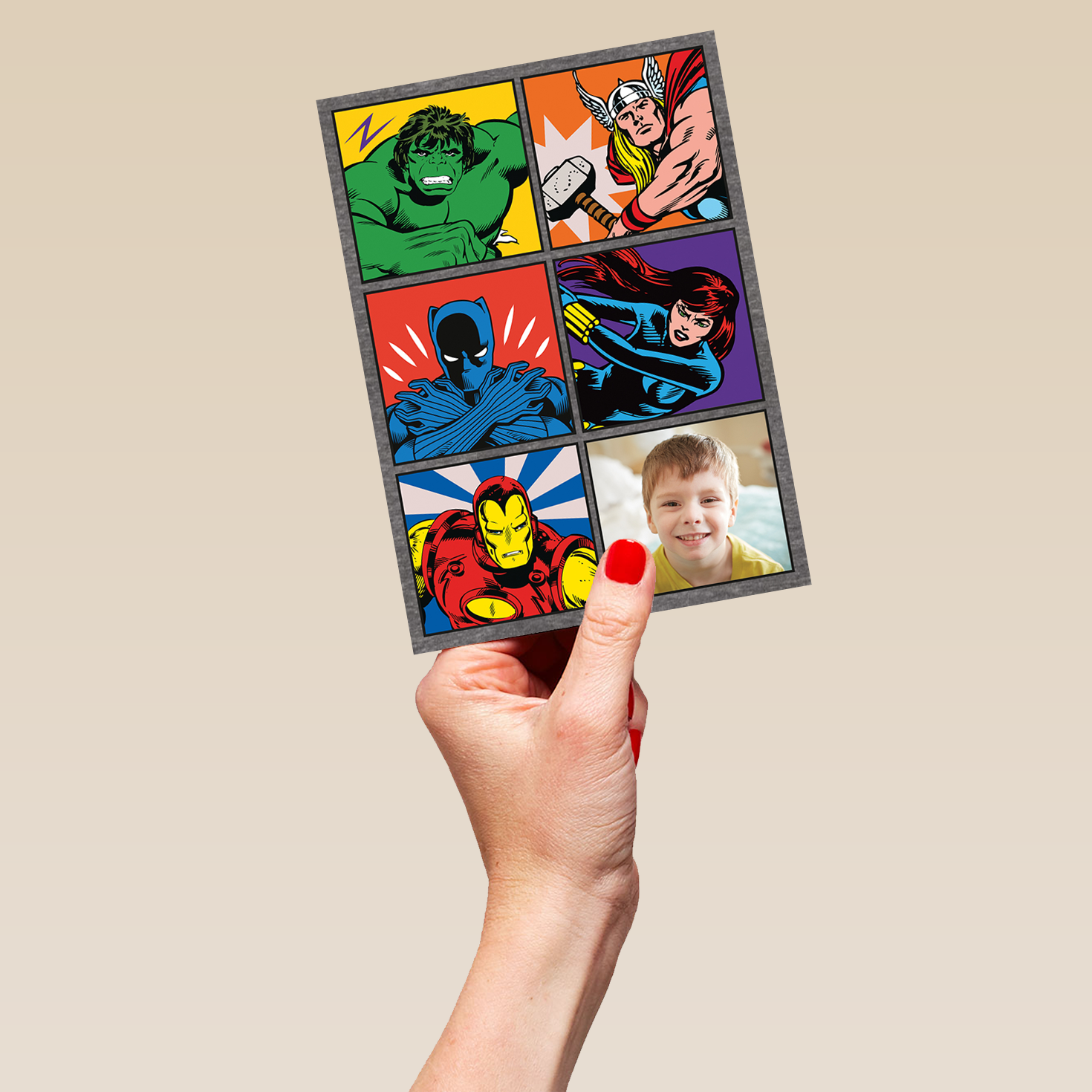 Show them you care with a personalised Marvel comics photo upload superheroes birthday card from Hallmark. Our greetings cards are printed on premium quality, FSC®-certified card & delivered nationwide. This card is available as standard 12cm by 16.7cm and large 15.5cm by 21.6cm.