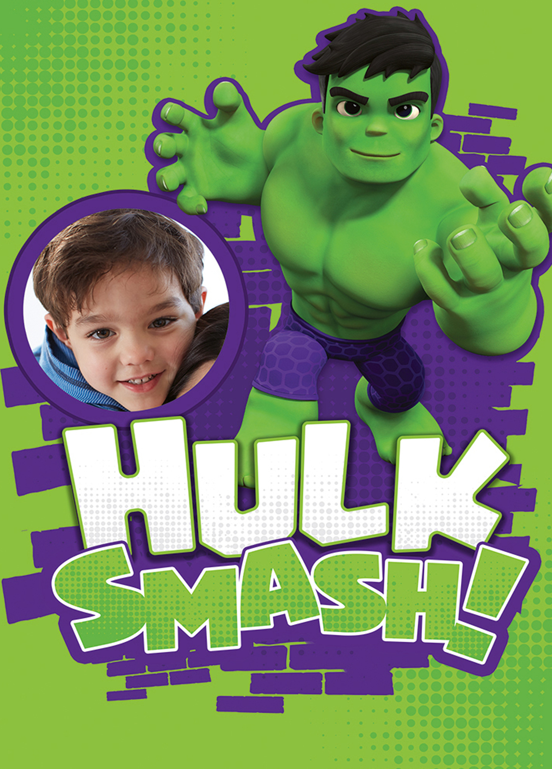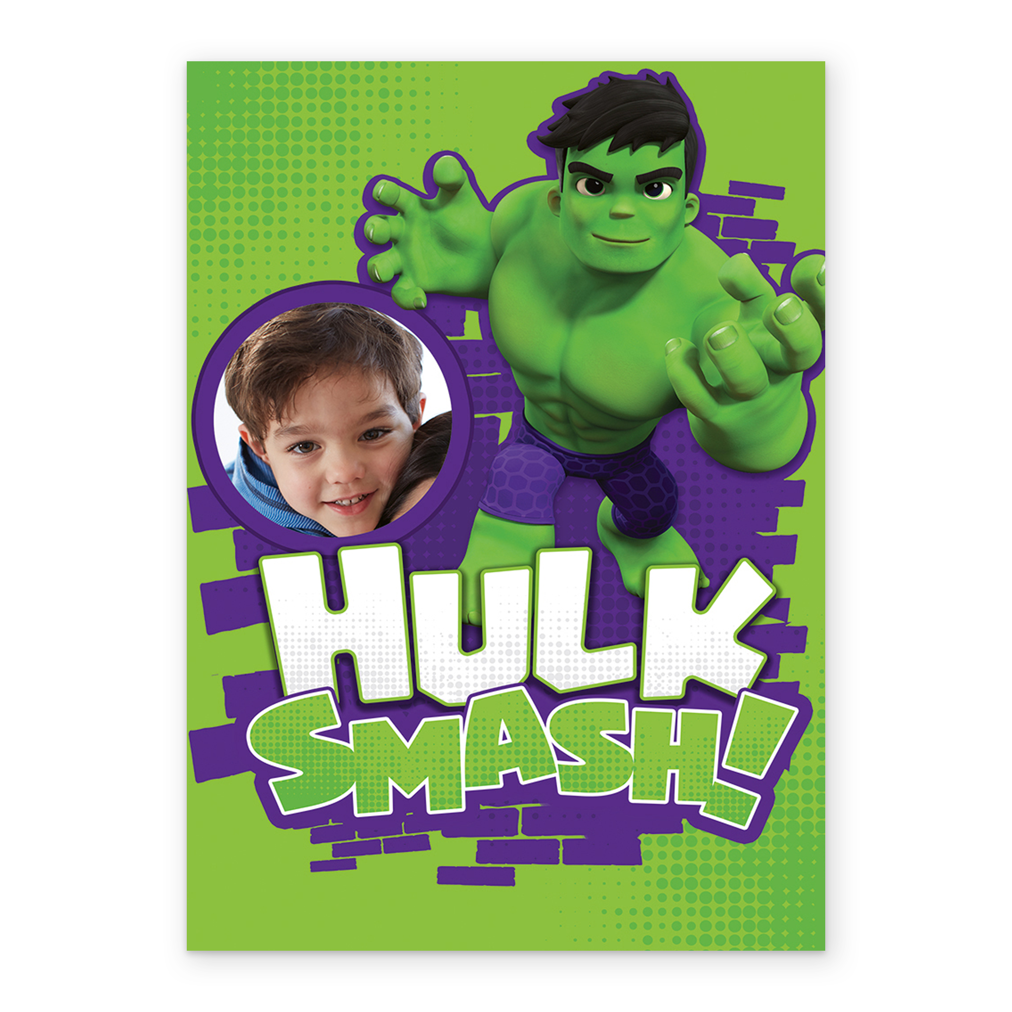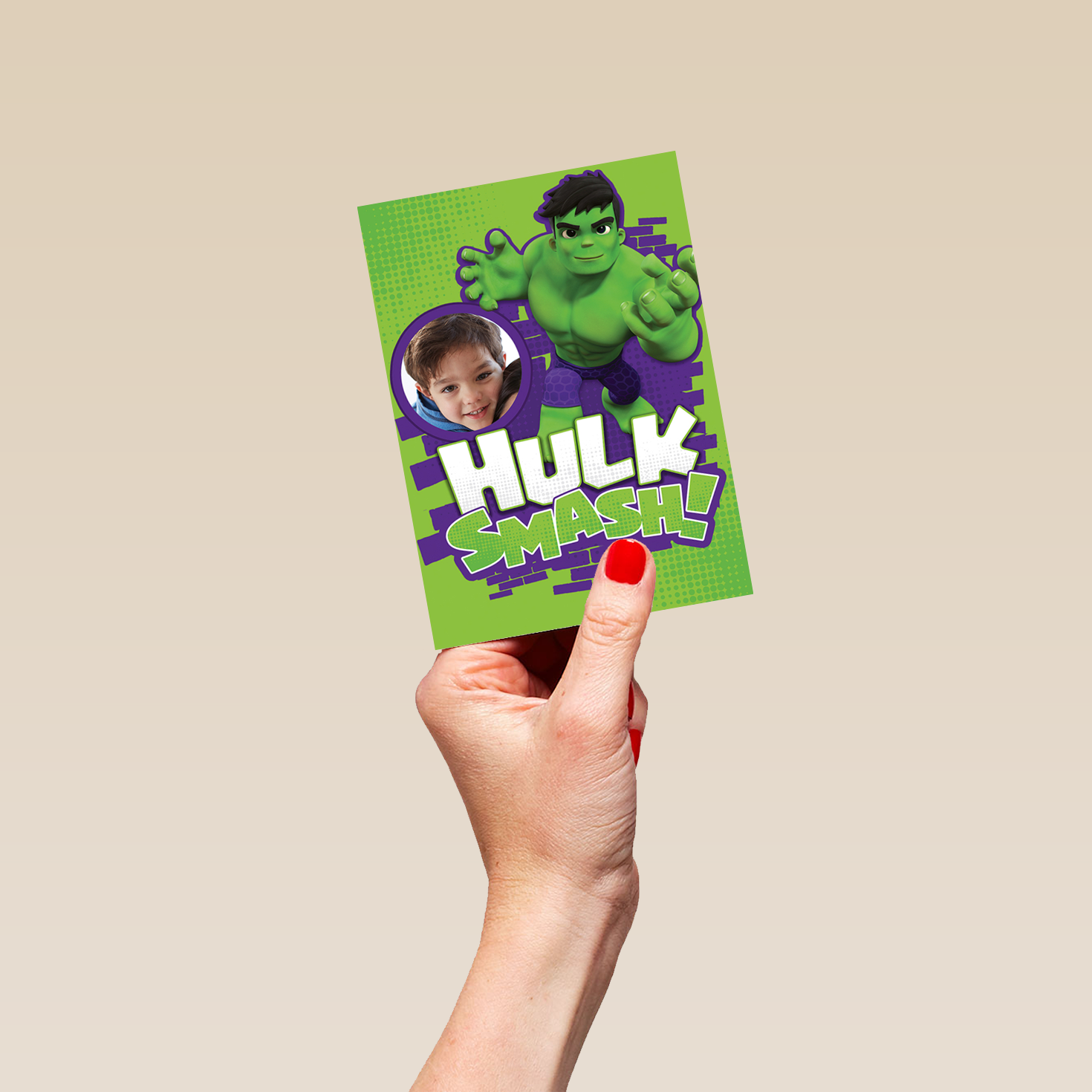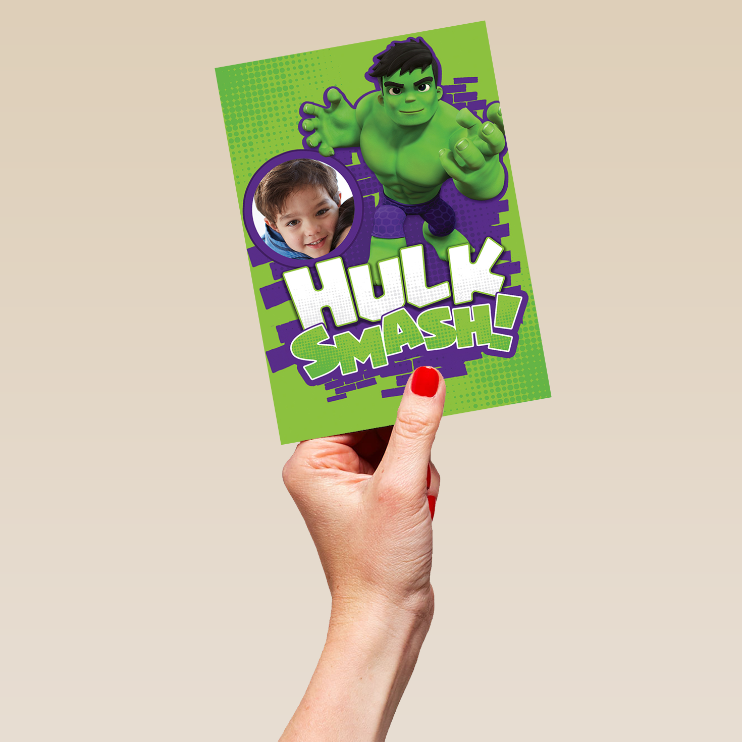 Show them you care with a personalised Disney Marvel Hulk photo upload birthday card from Hallmark. Our greetings cards are printed on premium quality, FSC®-certified card & delivered nationwide. This card is available as standard 12cm by 16.7cm and large 15.5cm by 21.6cm.