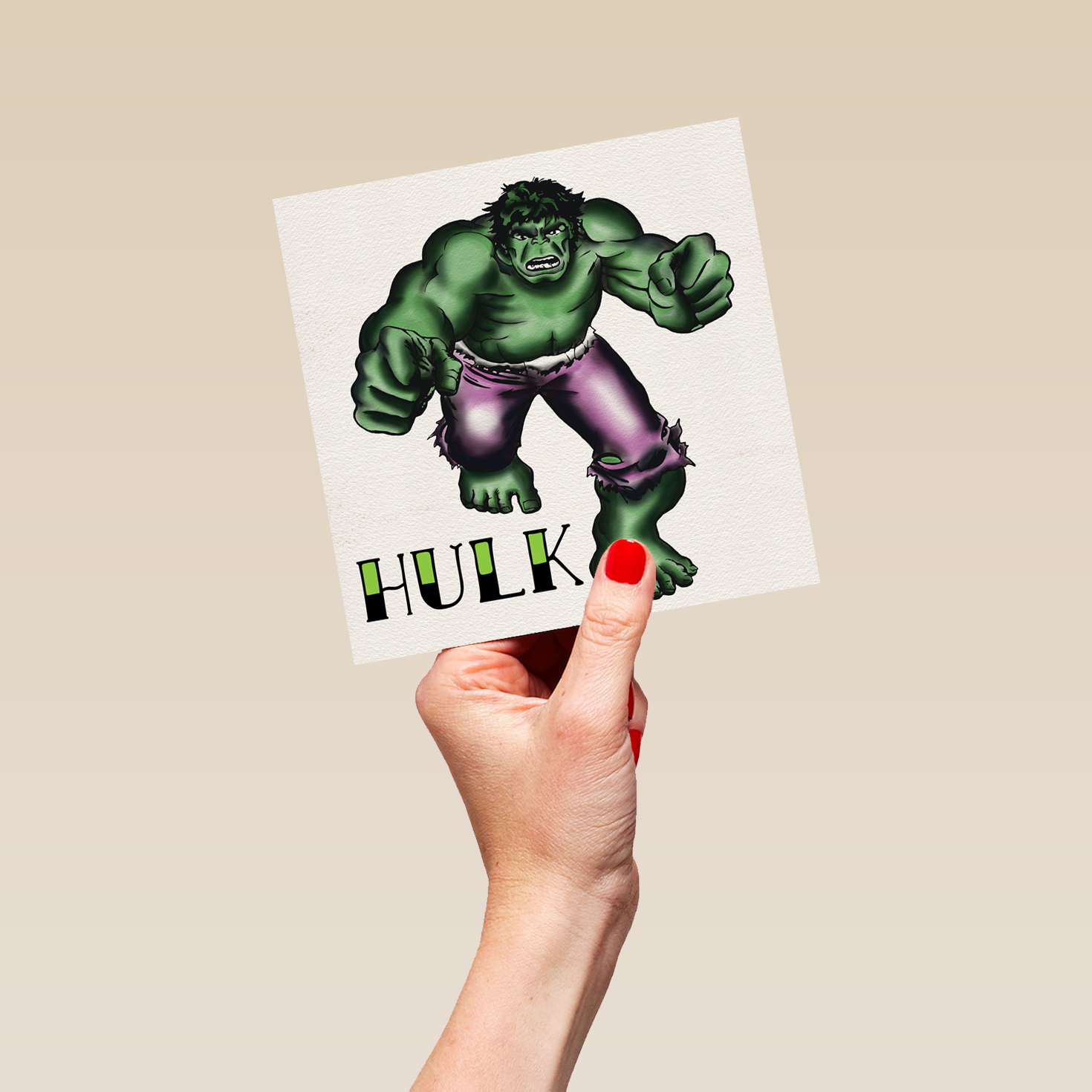 Show them you care with a personalised Disney Marvel Incredible Hulk hero birthday card from Hallmark. Our greetings cards are printed on premium quality, FSC®-certified card & delivered nationwide. This card is available as standard 12cm by 12cm and large 15cm by 15cm.