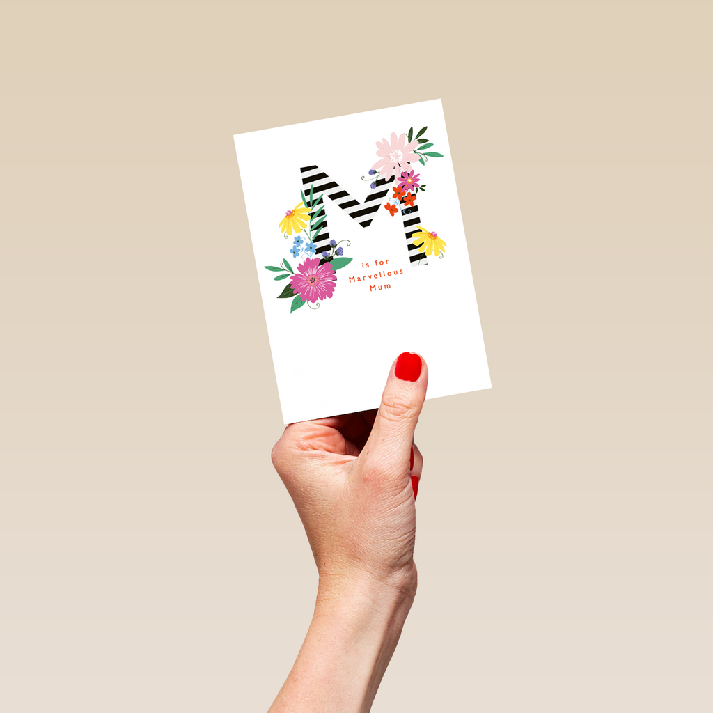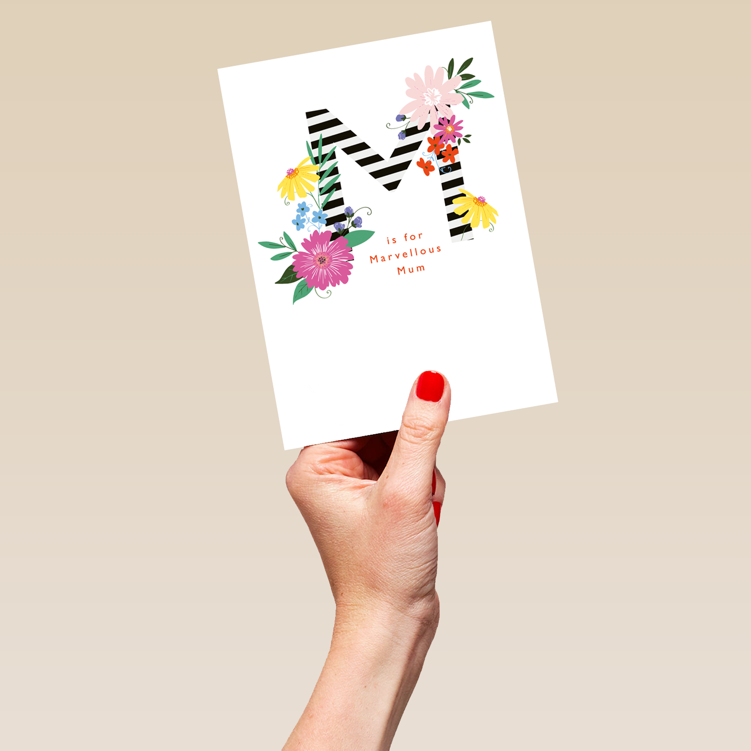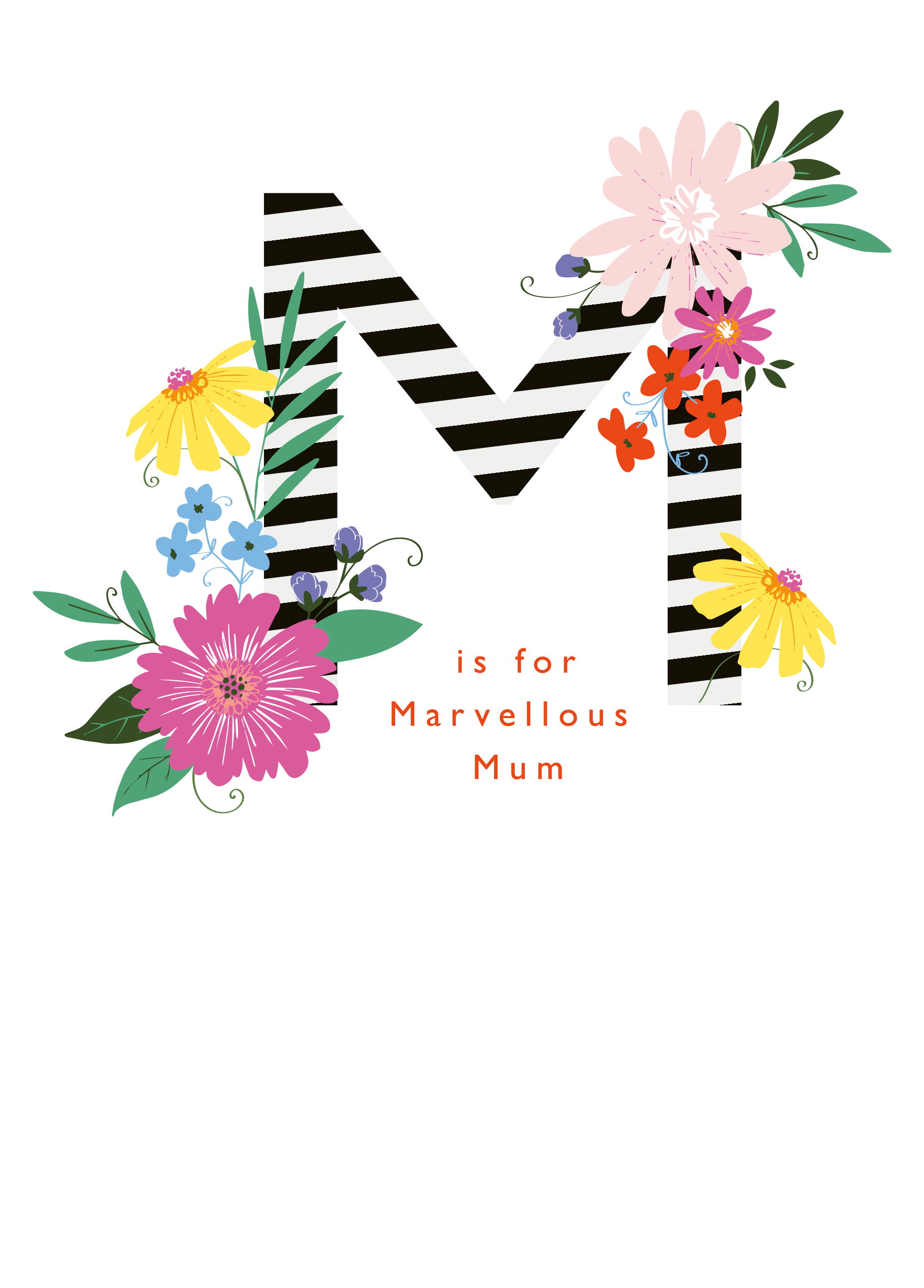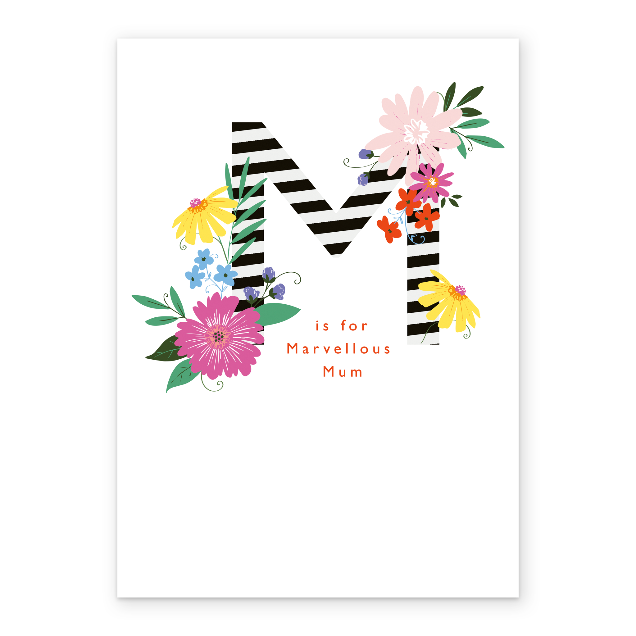 Printed on premium-quality board, this card features the letter M, with black and white diagonal stripes and adorned with colourful flowers, on a white background, with the message 'M is for marvellous mum', and comes complete with a co-ordinating white envelope.