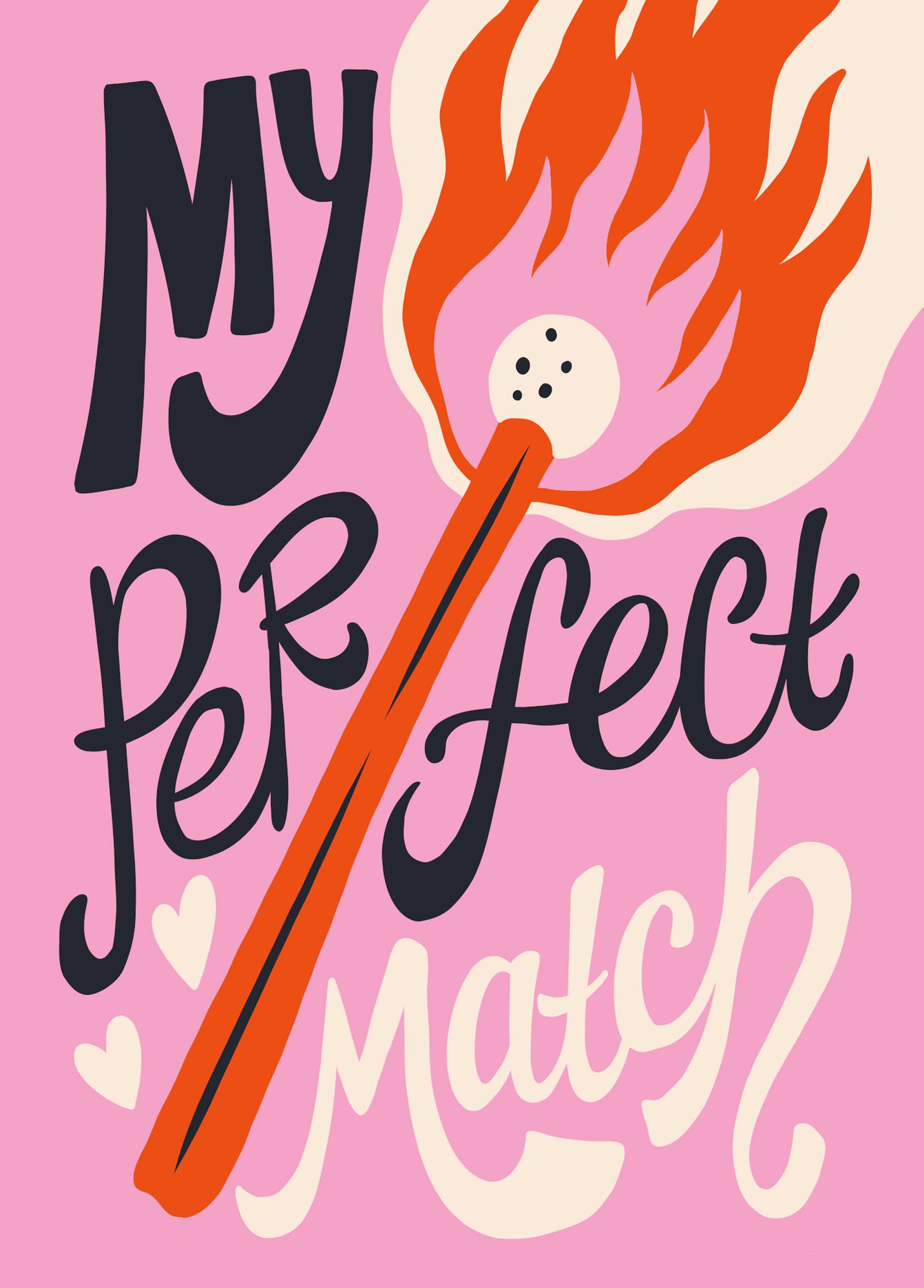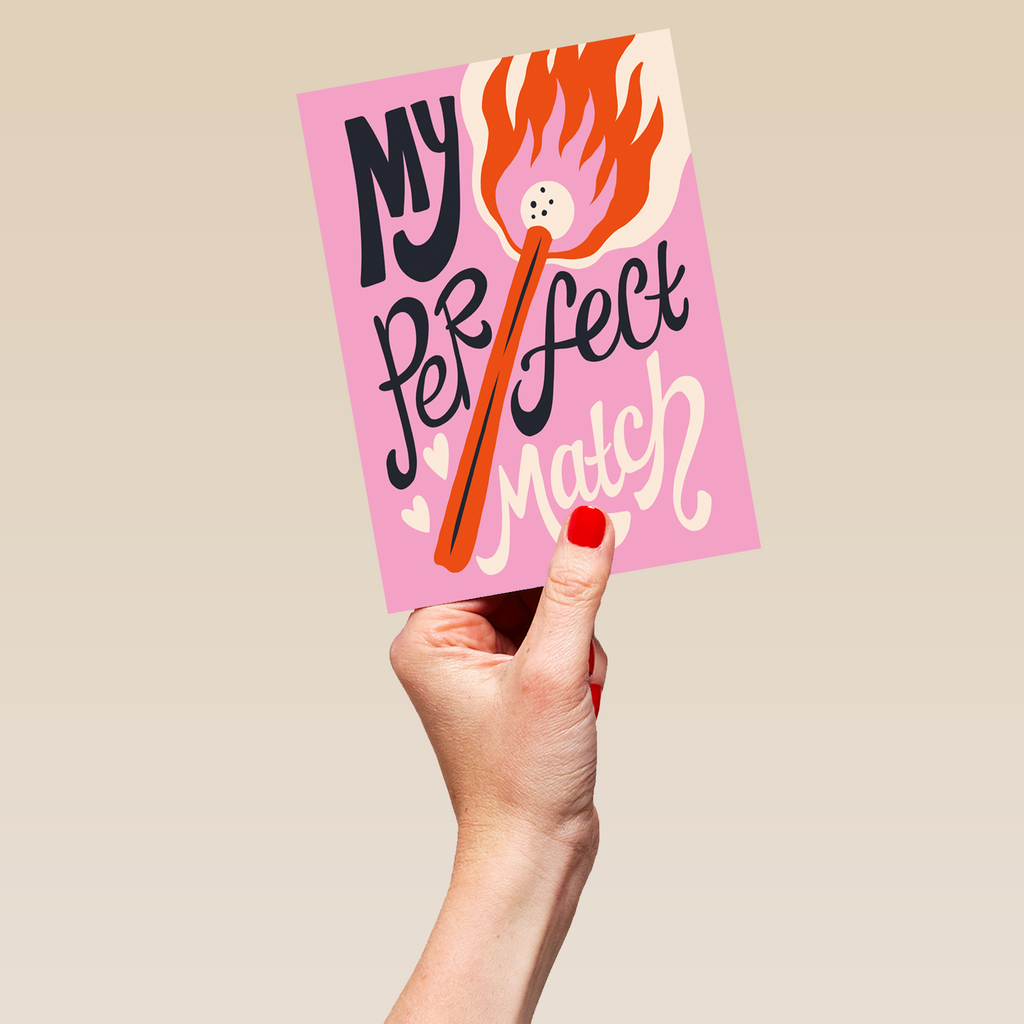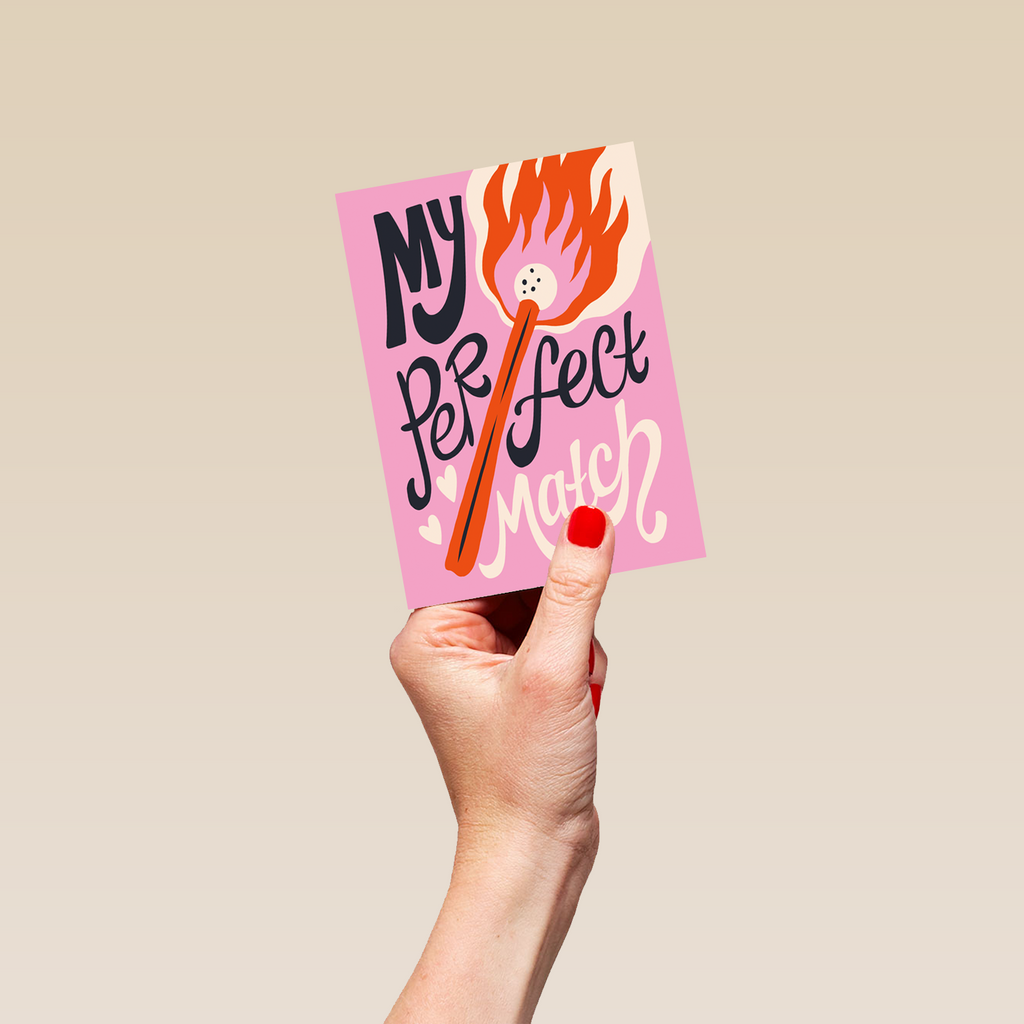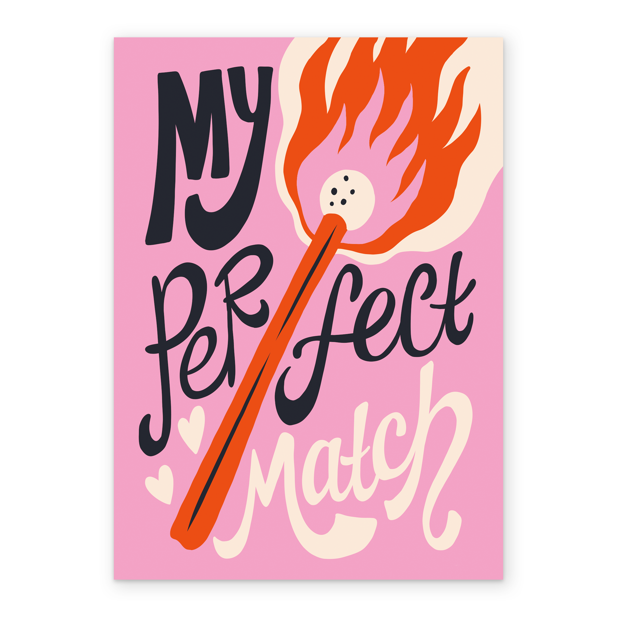 Printed on premium-quality board, this card features a match on fire with hearts, with the message 'My perfect match', and comes complete with a co-ordinating white envelope.