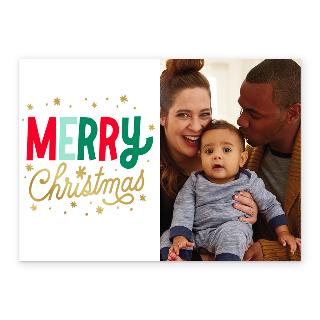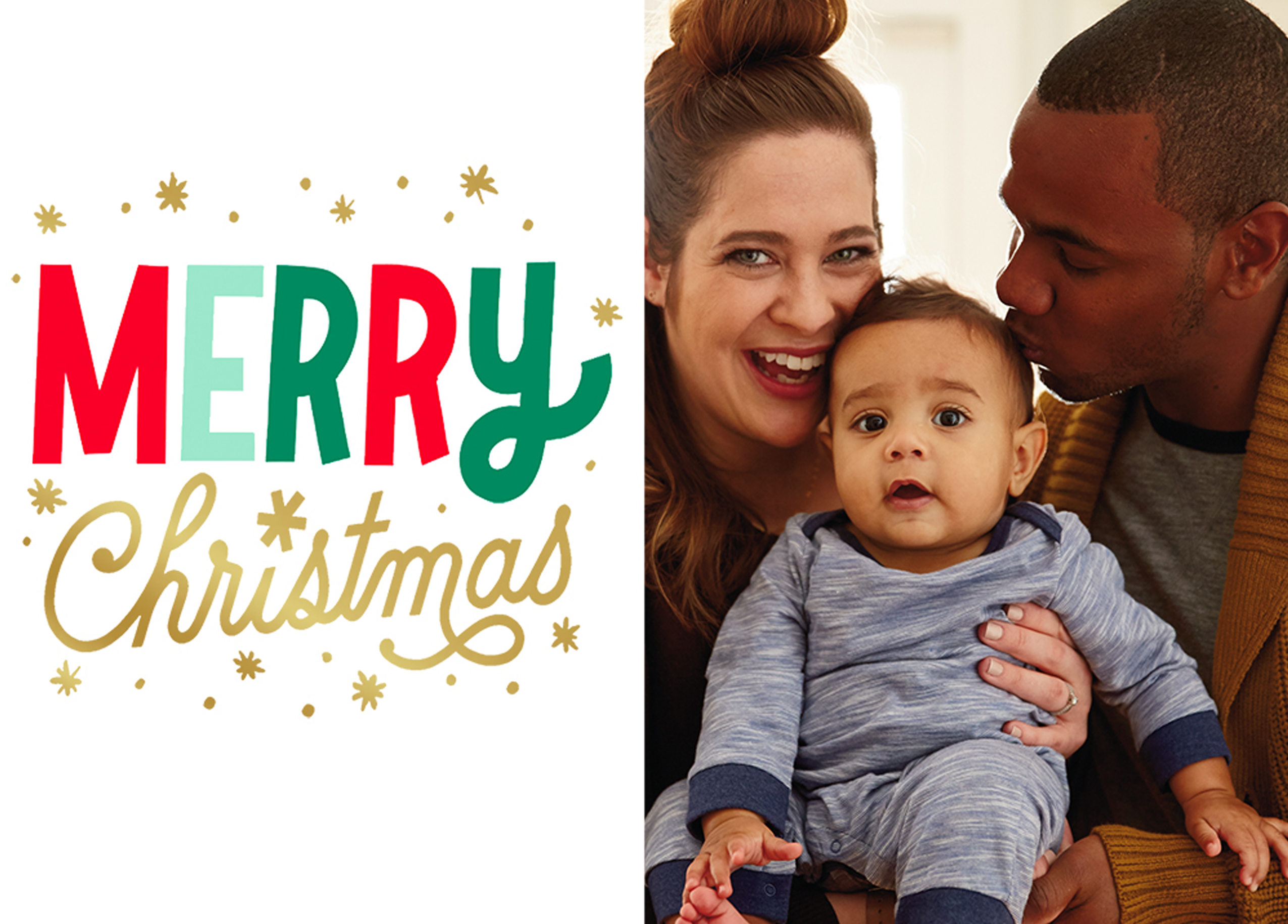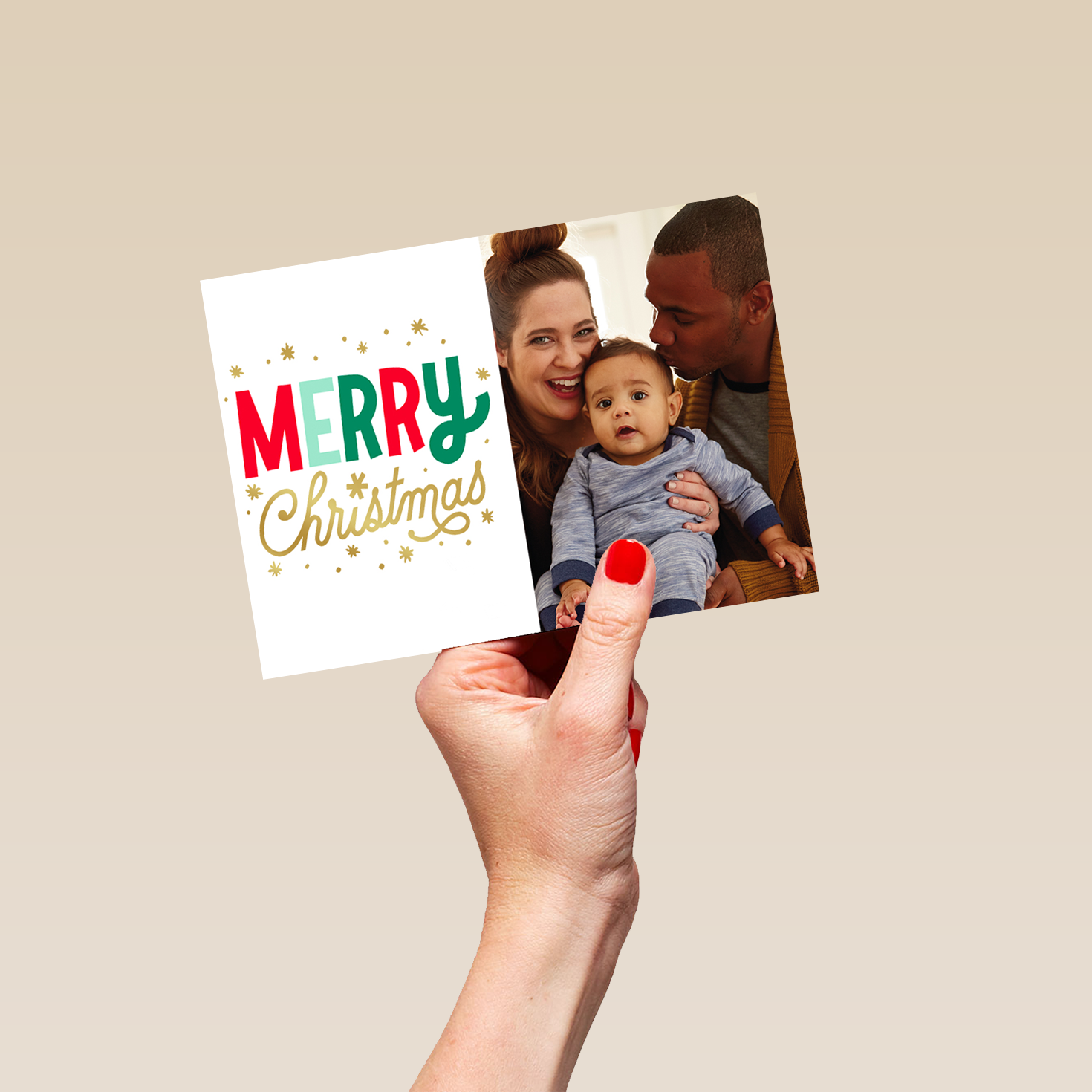 Show them you care with a personalised merry Christmas photo Christmas card from Hallmark. Our greetings cards are printed on premium quality, FSC®-certified card & delivered nationwide. This card is available as standard 16.7cm by 12cm and large 21.6cm by 15.5cm.