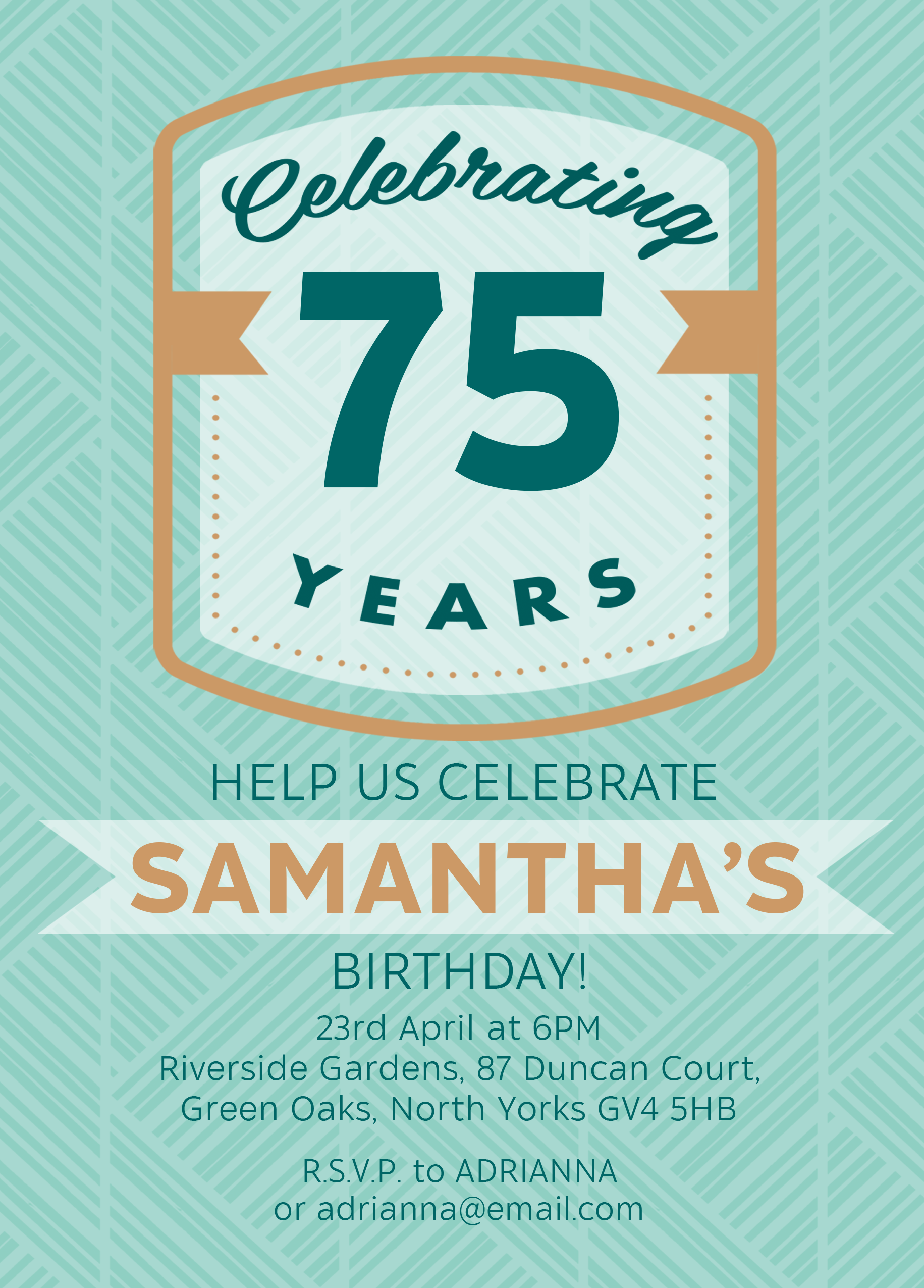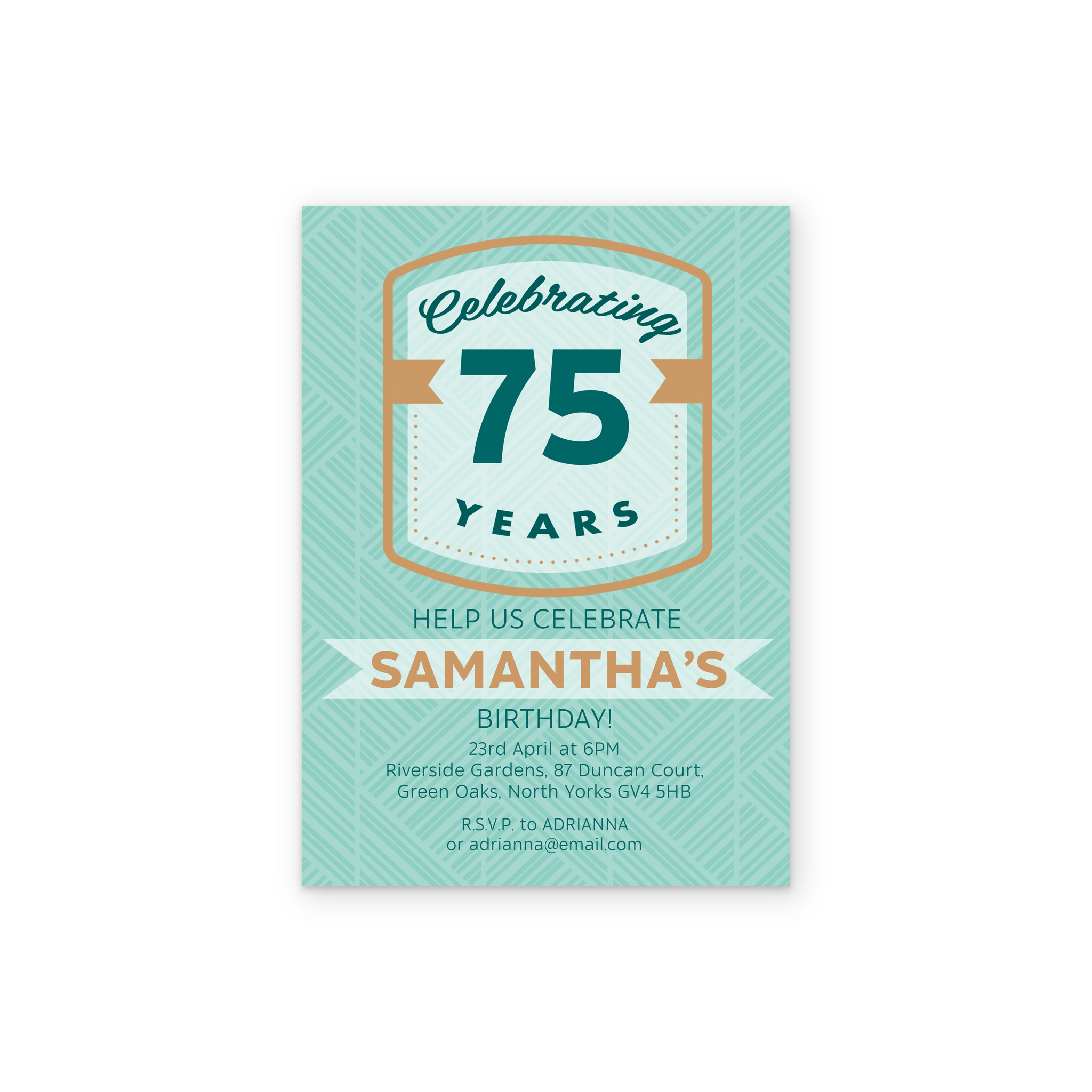 Printed on premium-quality board, this card features an orange bordered plaque design set against a patterned turquoise background alongside a combination of orange and darker turquoise lettering, with the message 'Celebrating [AGE] Years. Help Us Celebrate [NAME]s birthday! [DATE] [ADDRESS] RSVP to [NAME] or [EMAIL ADDRESS]', space to personalise your message, and comes complete with a co-ordinating white envelope.