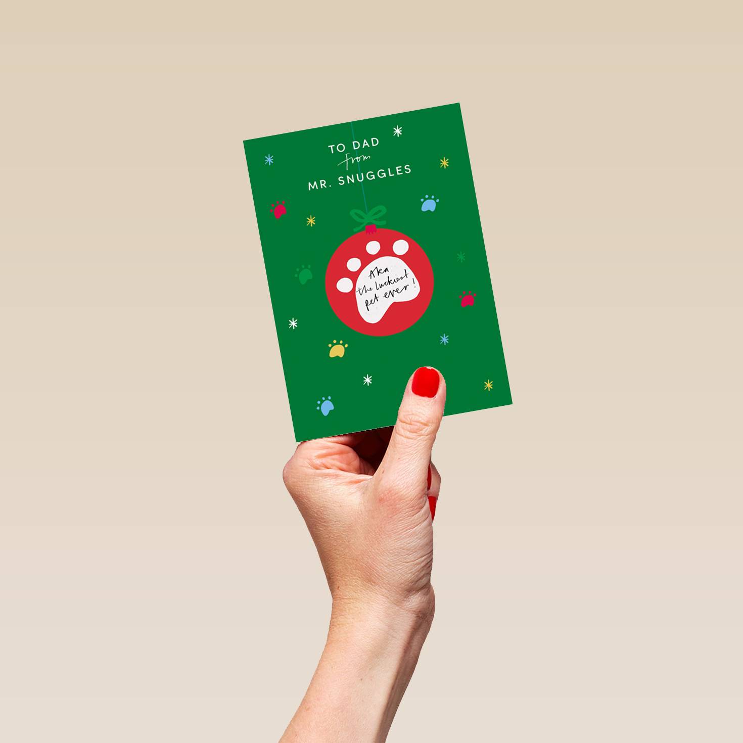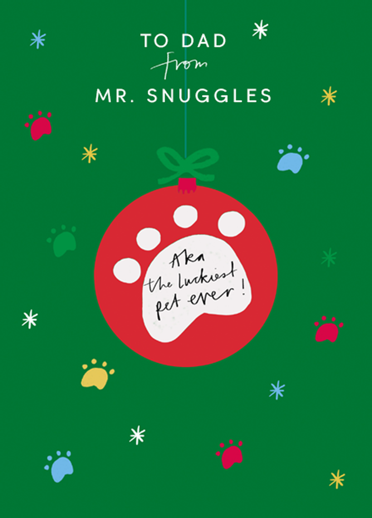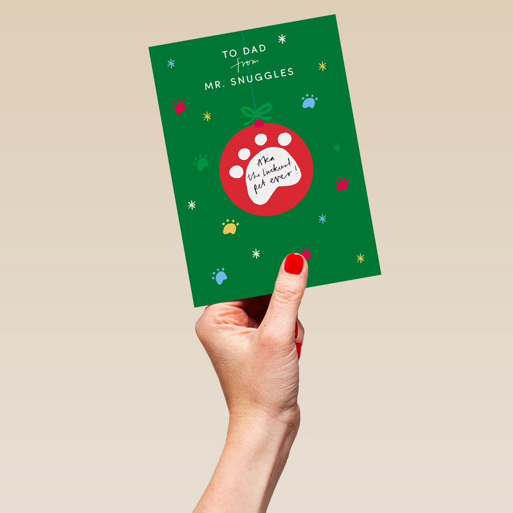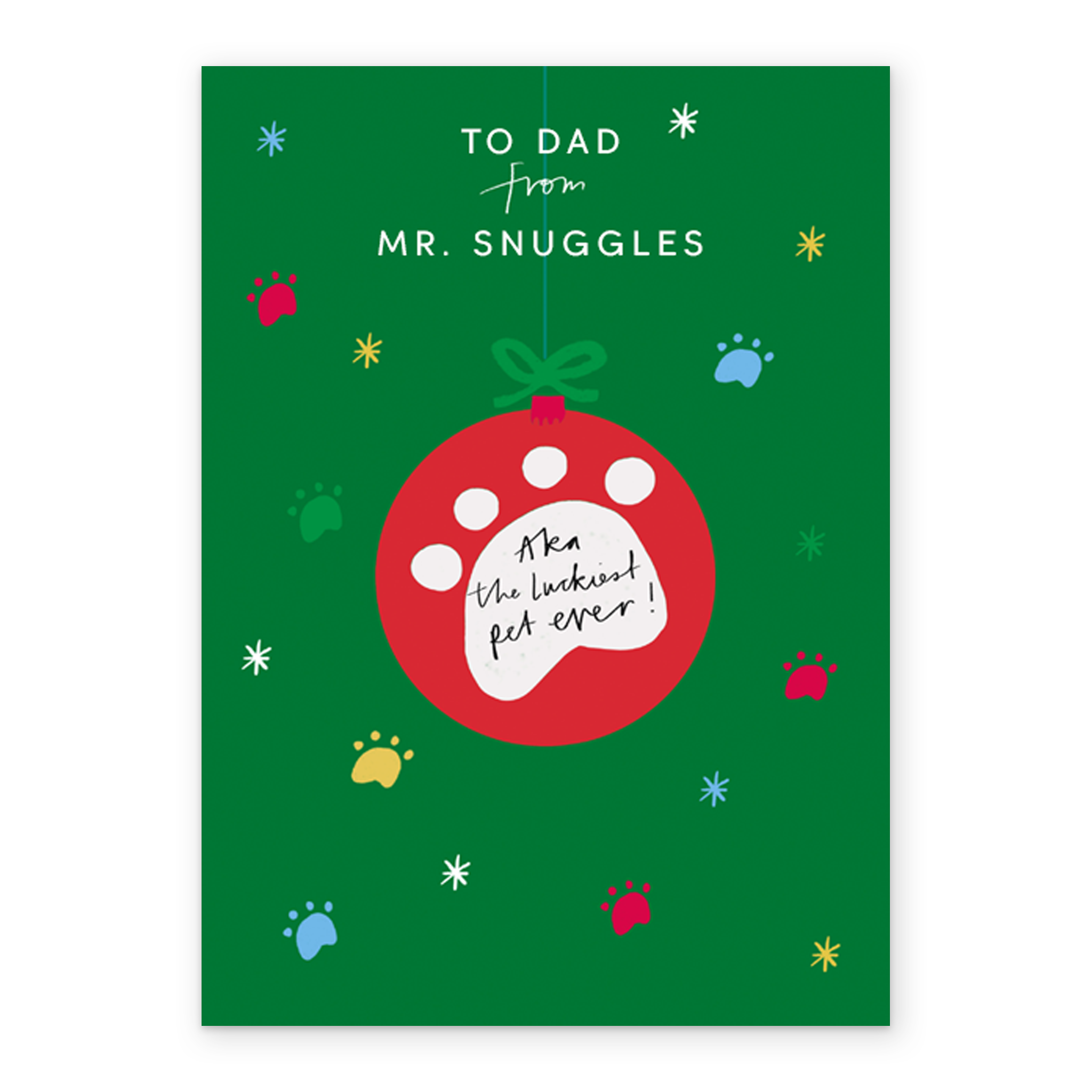 Show them you care with a personalised modern Christmas dad from fur baby editable pet card from Hallmark. Our greetings cards are printed on premium quality, FSC®-certified card & delivered nationwide. This card is available as standard 12cm by 16.7cm and large 15.5cm by 21.6cm.