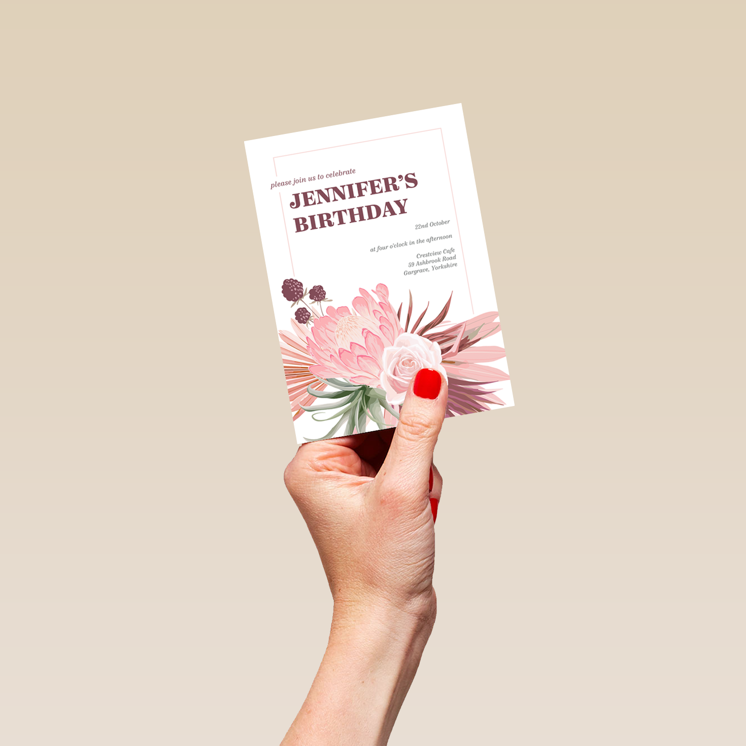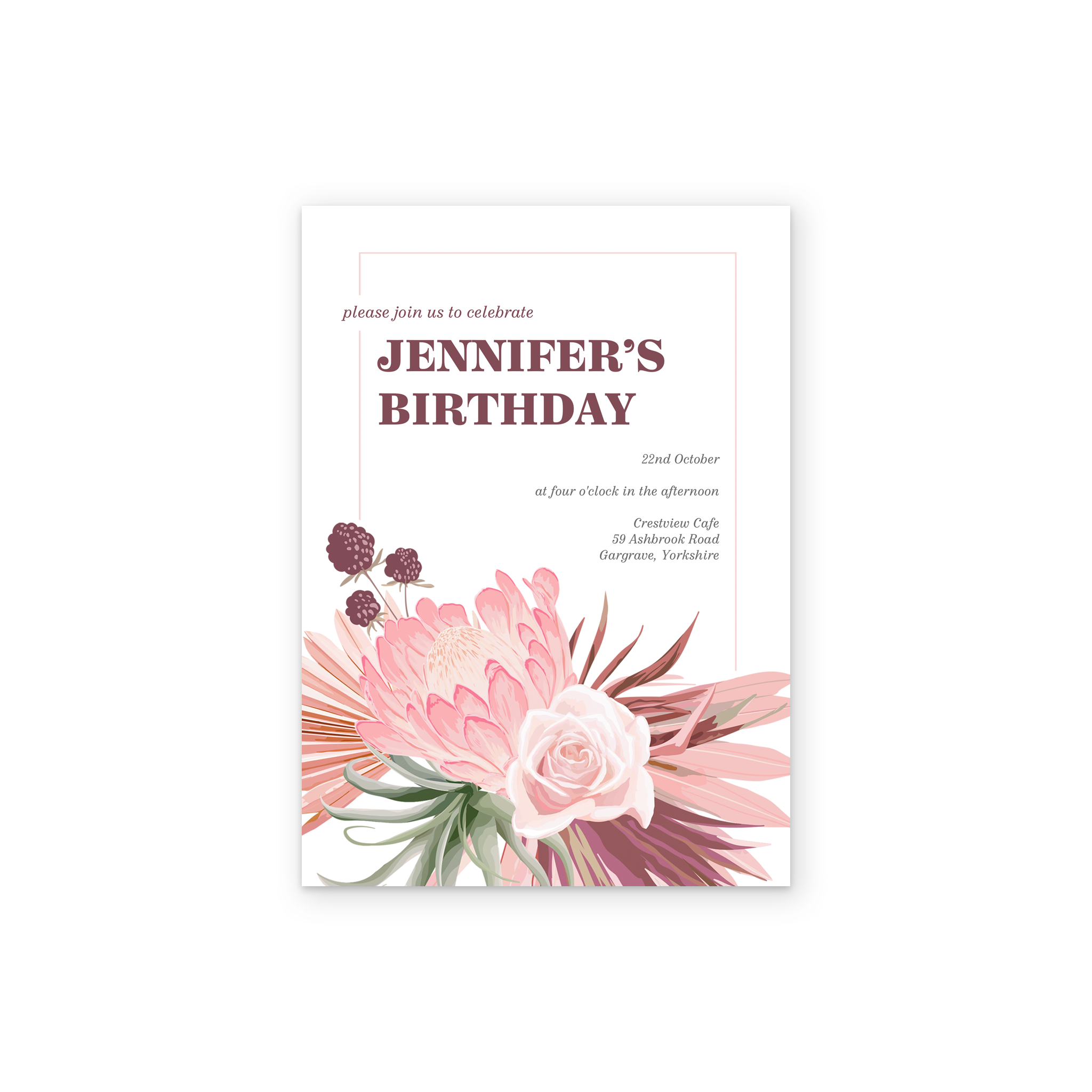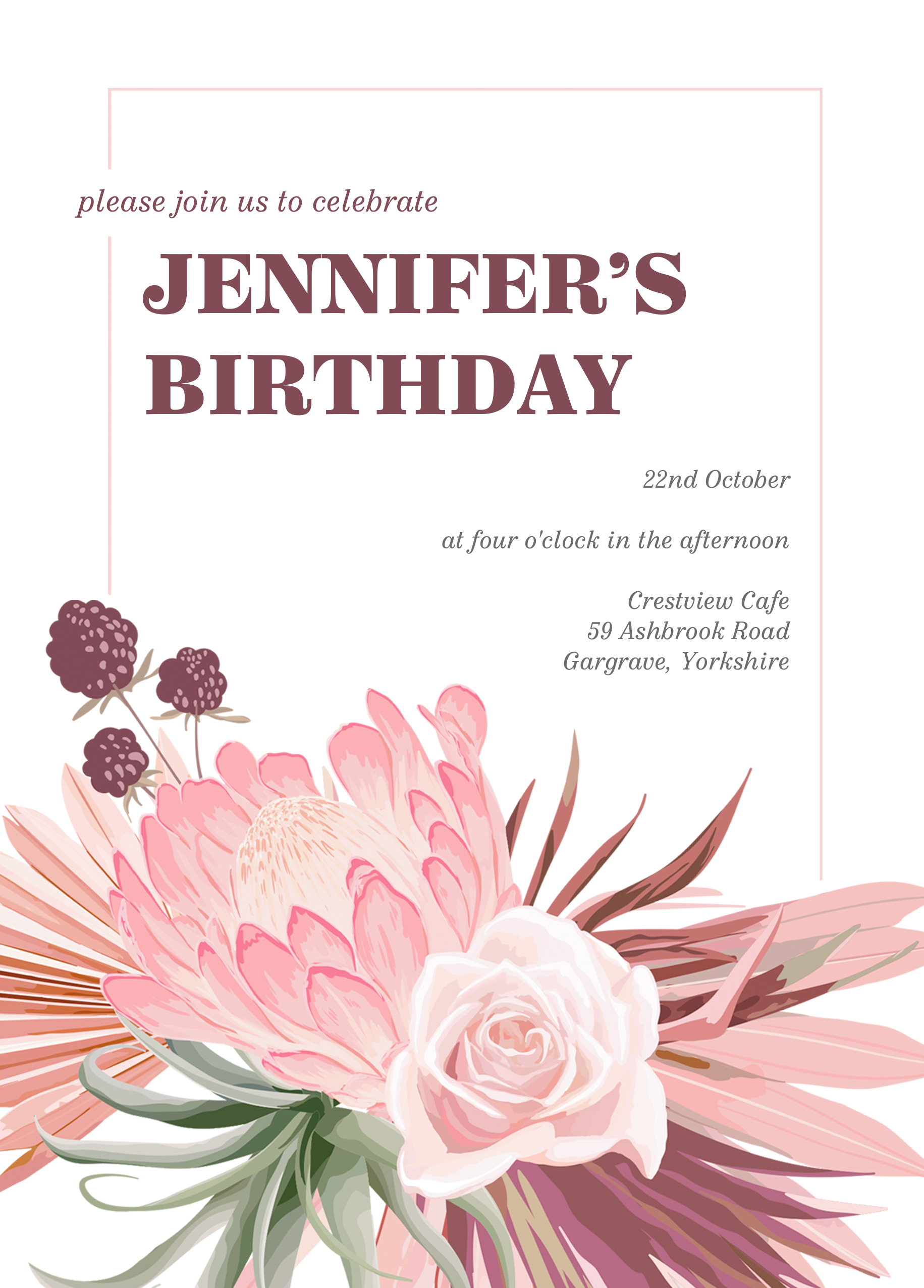 Printed on premium-quality board, this card features a stylised pink floral illustration set against a white background with a delicate pink border and burgundy and black lettering, with the message 'Please join us to celebrate [NAME]'s Birthday [DATE] [ADDRESS]', space to personalise your message, and comes complete with a co-ordinating white envelope.