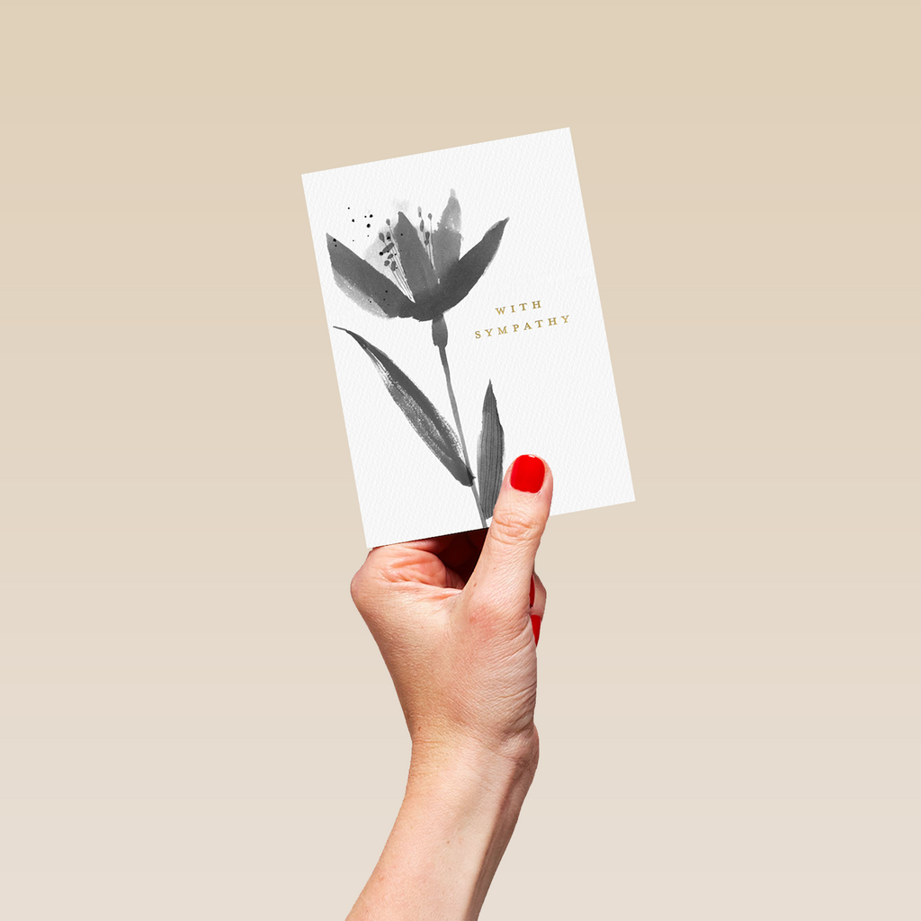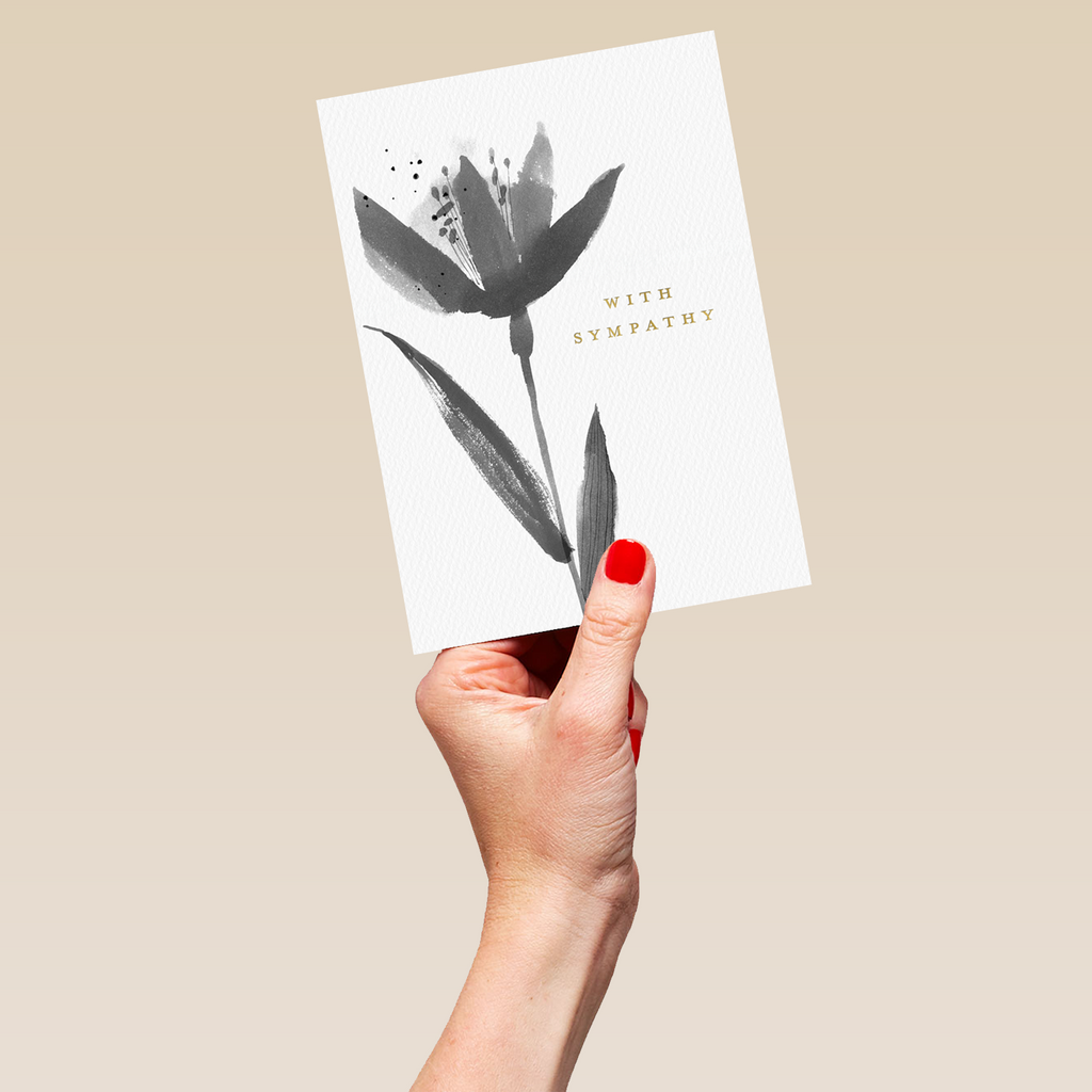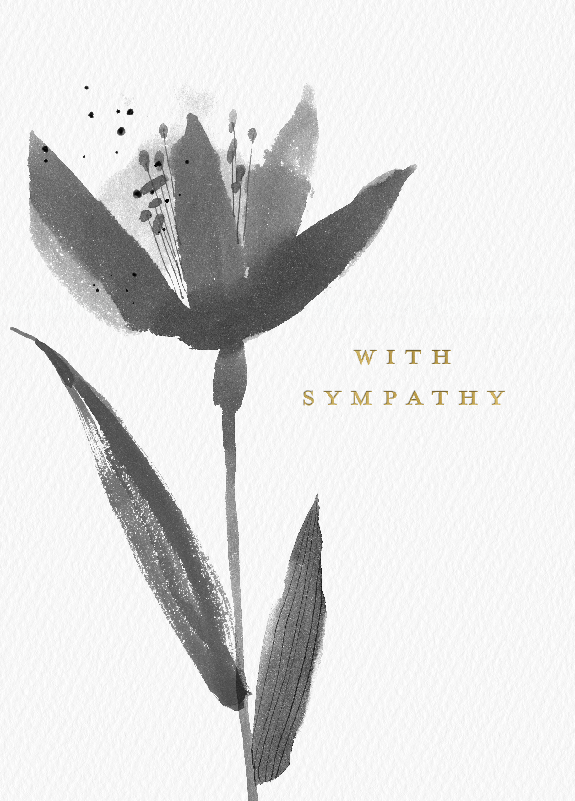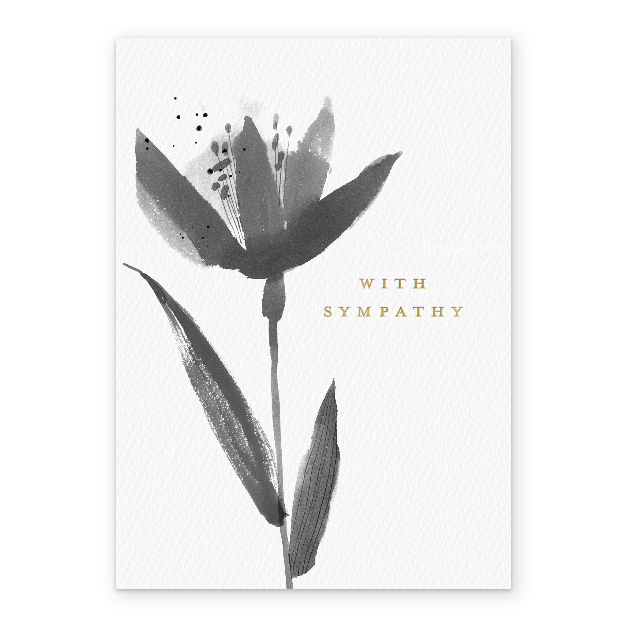Printed on premium-quality board, this card features a simple, monochrome illustration of a single flower set against a plain white background, paired with subtle, gold effect lettering, with the message 'With Sympathy', and comes complete with a co-ordinating white envelope.