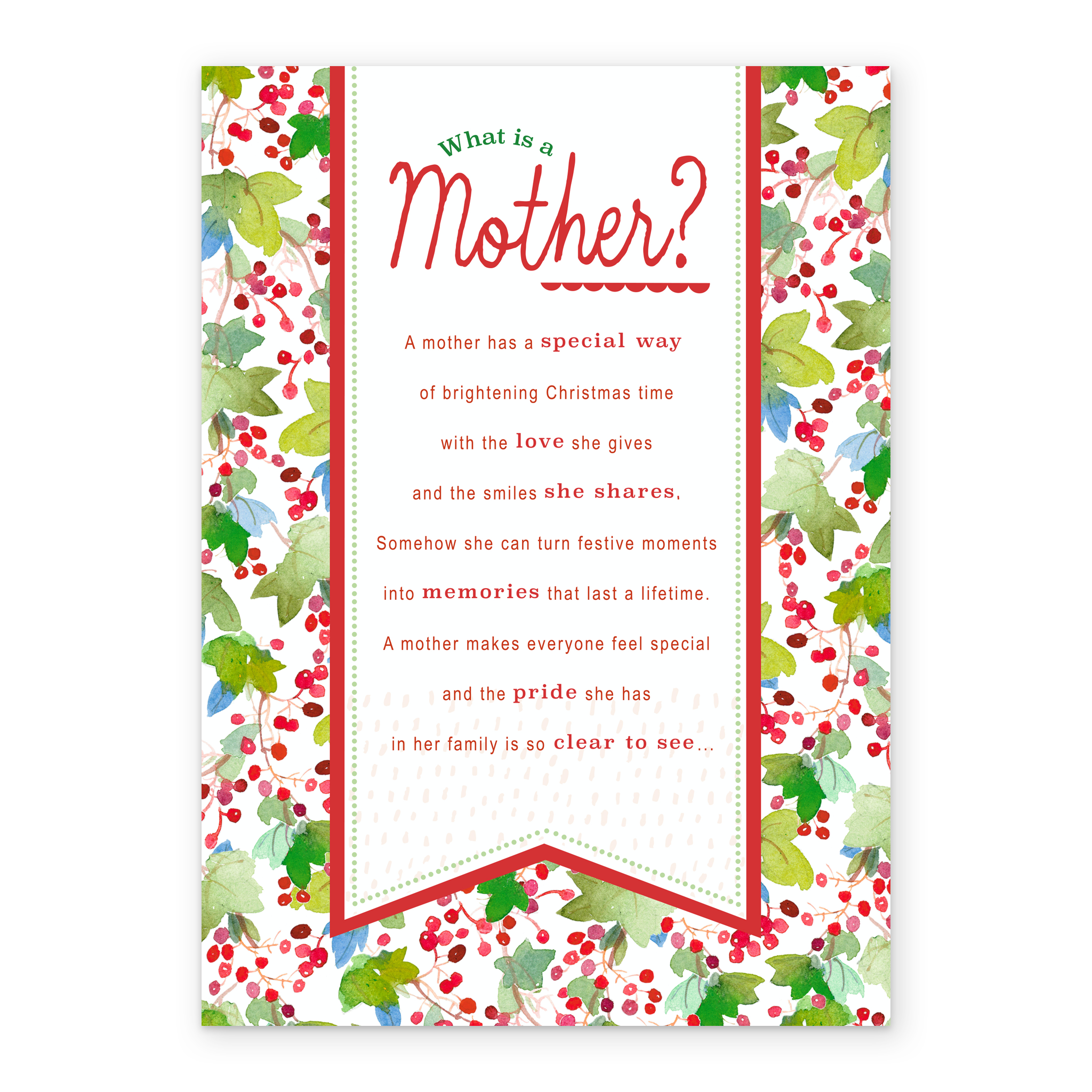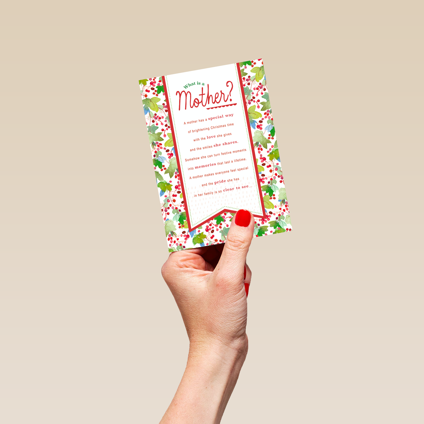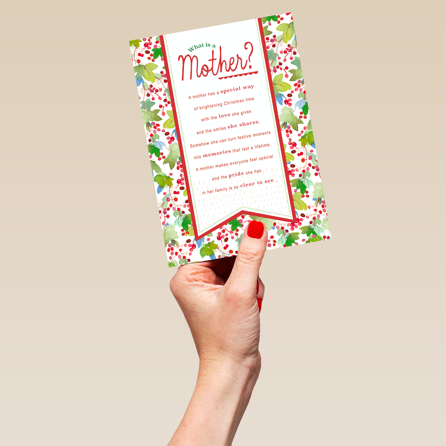 Show them you care with a personalised mother poem card from Hallmark. Our Christmas cards are printed on premium quality, FSC®-certified card & delivered nationwide. This card is available as standard 12cm by 16.7cm and large 15.5cm by 21.6cm.