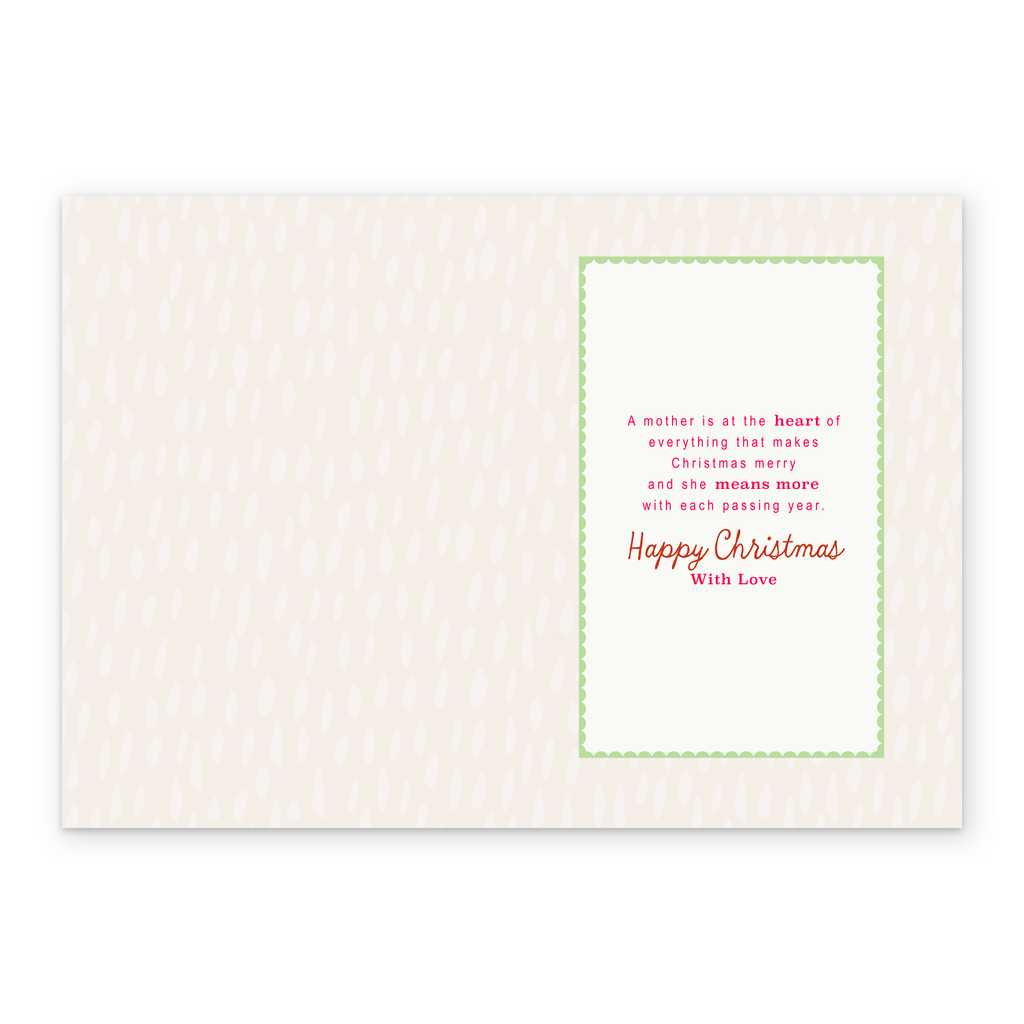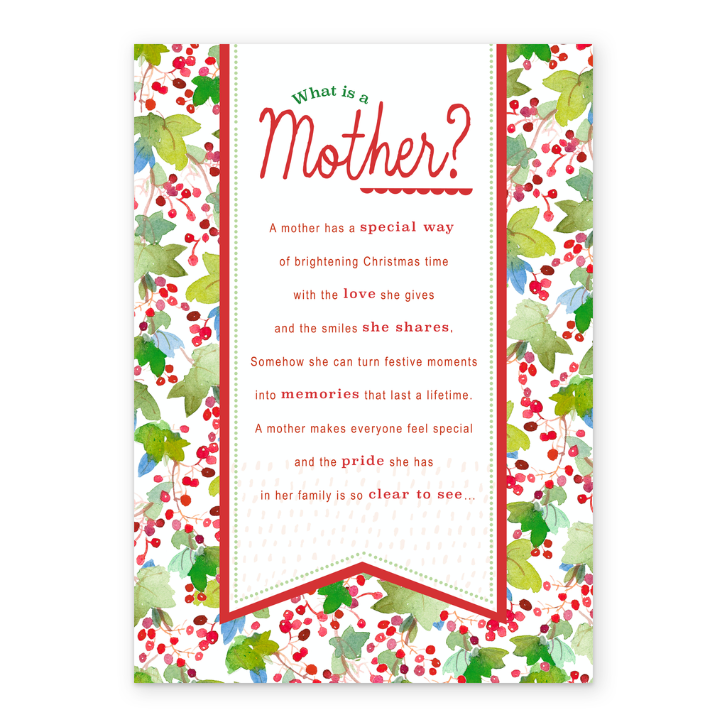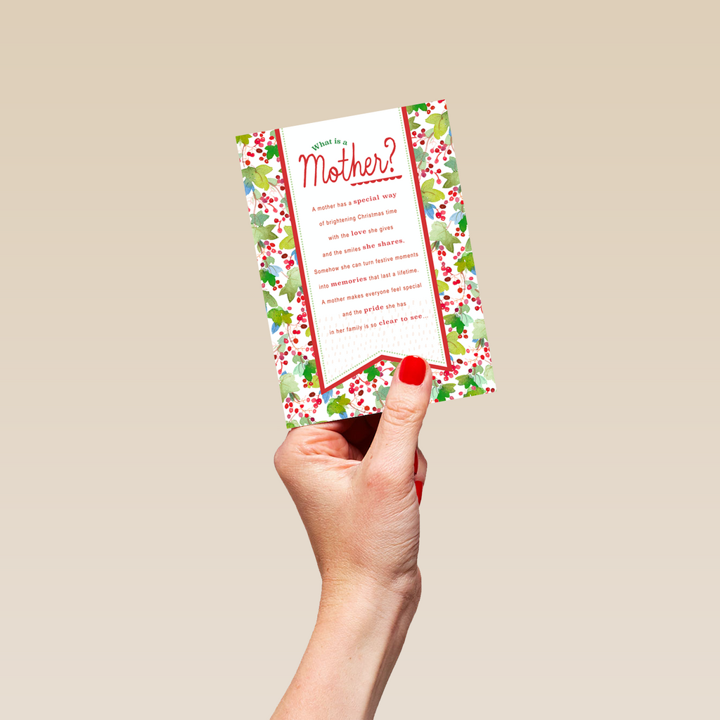 Show them you care with a personalised mother poem card from Hallmark. Our Christmas cards are printed on premium quality, FSC®-certified card & delivered nationwide. This card is available as standard 12cm by 16.7cm and large 15.5cm by 21.6cm.