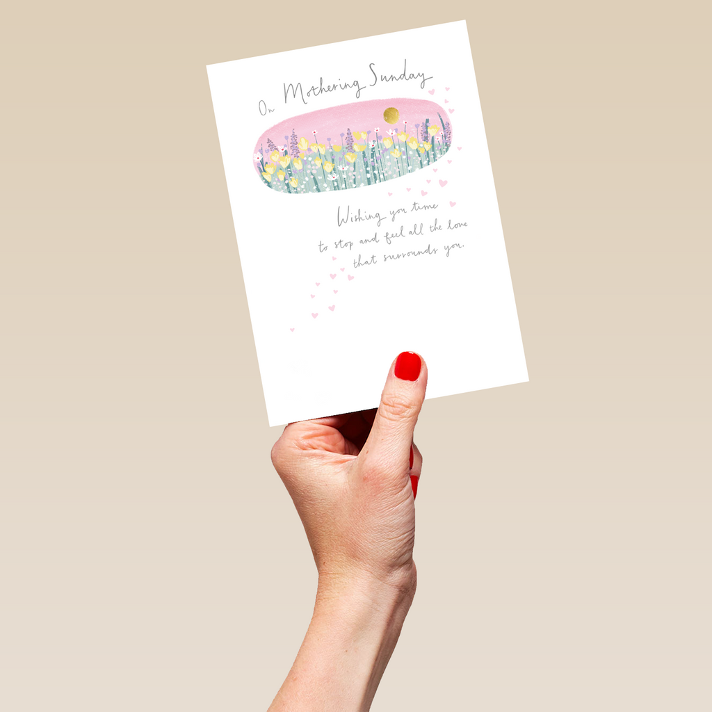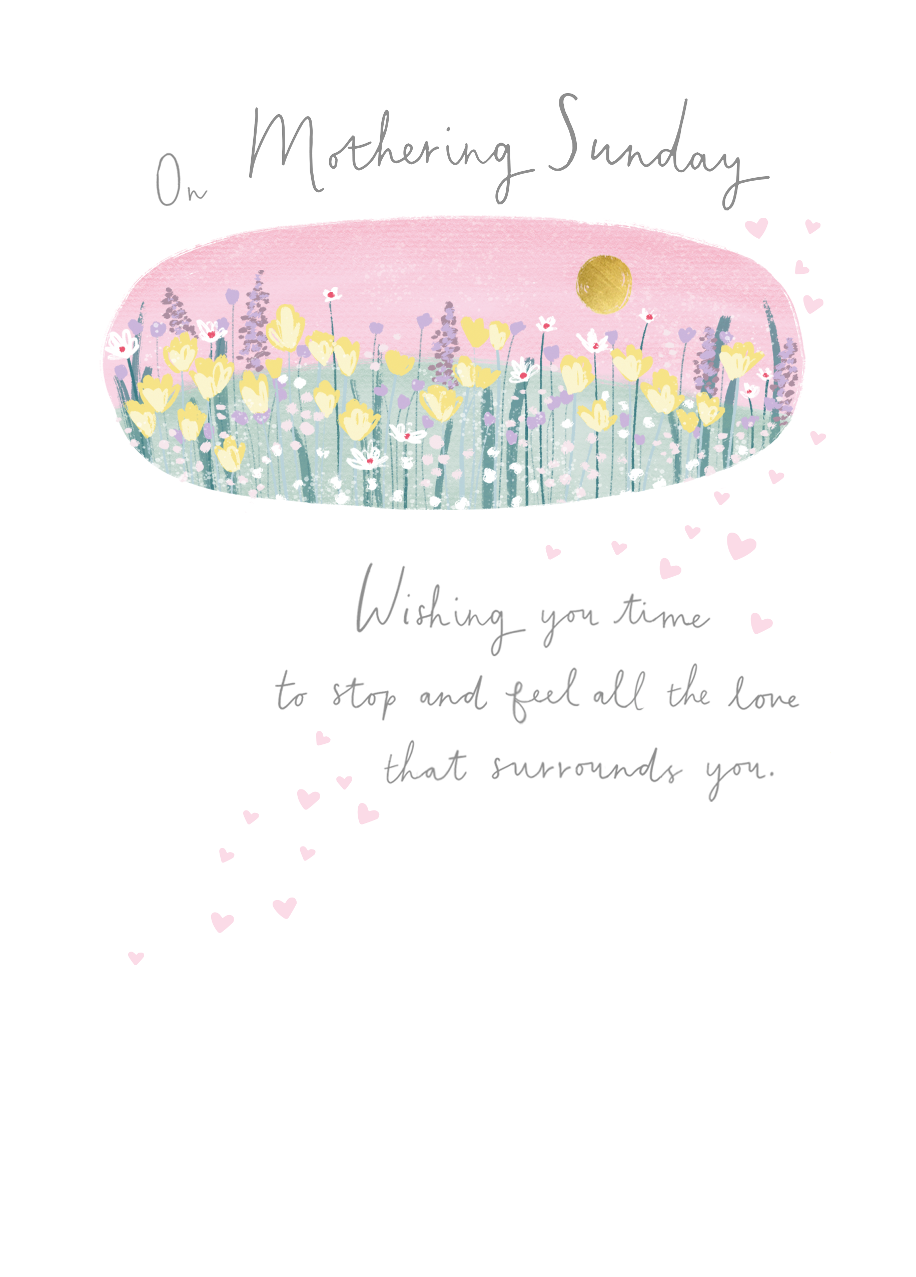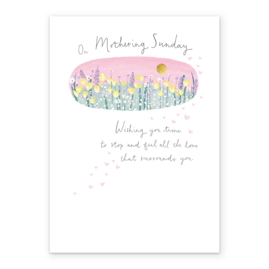 Printed on premium-quality board, this card features an illustrated scene of beautiful wildflowers, on a white background embellished with light pink hearts, with the message 'On Mothering Sunday. Wishing you time to stop and feel all the love that surrounds you.', and comes complete with a co-ordinating white envelope.