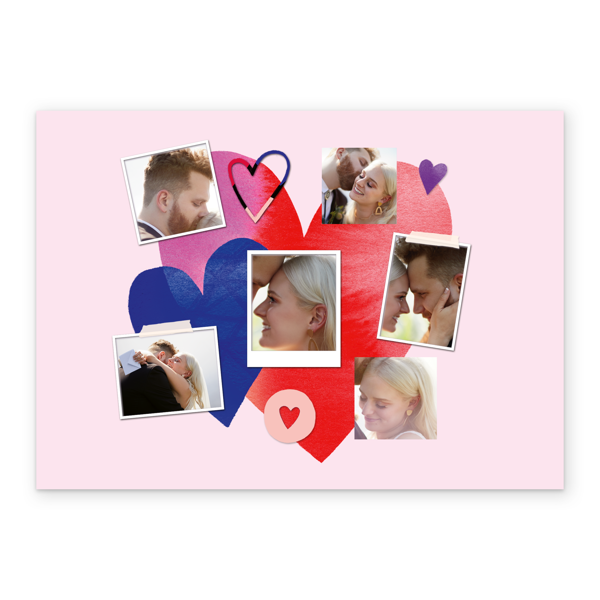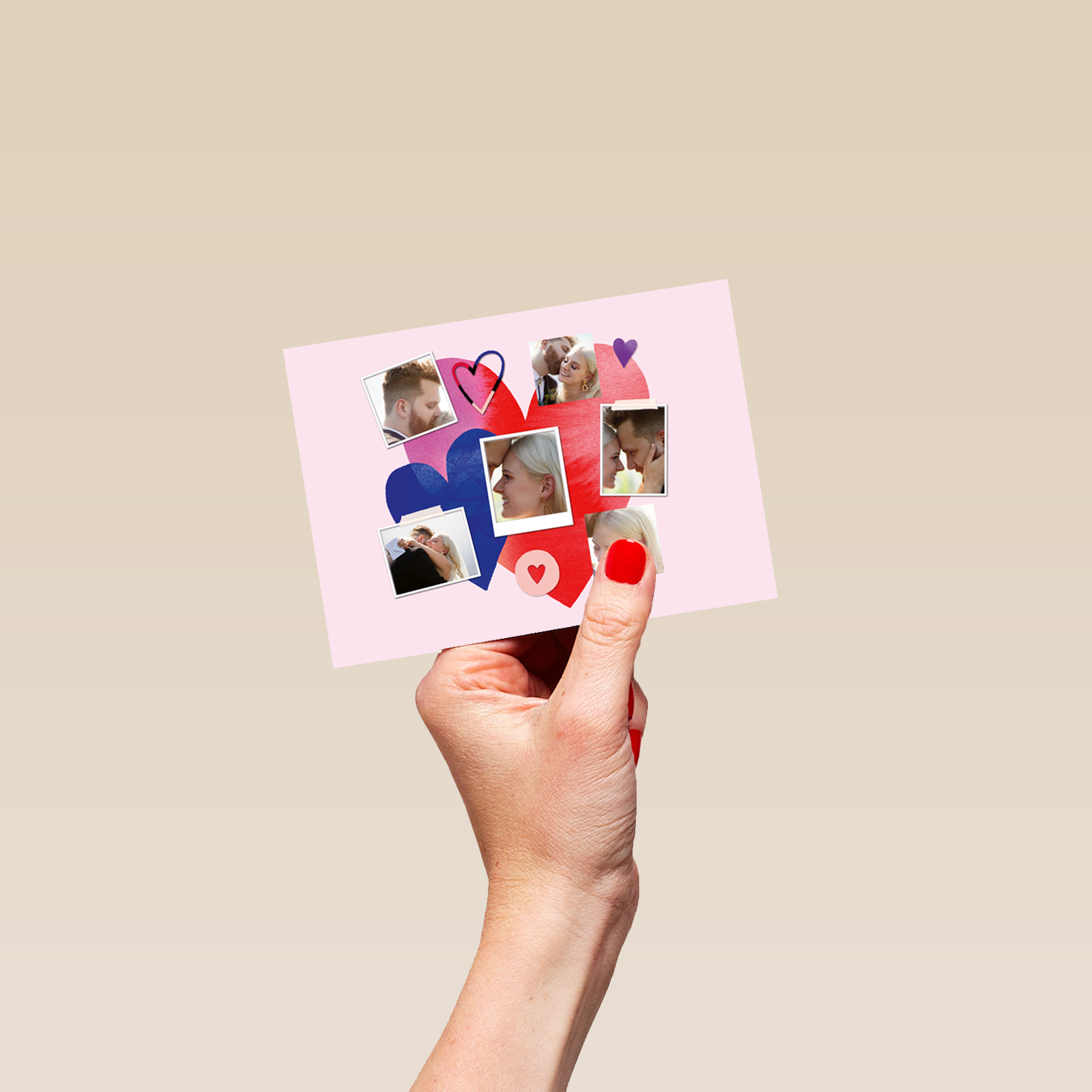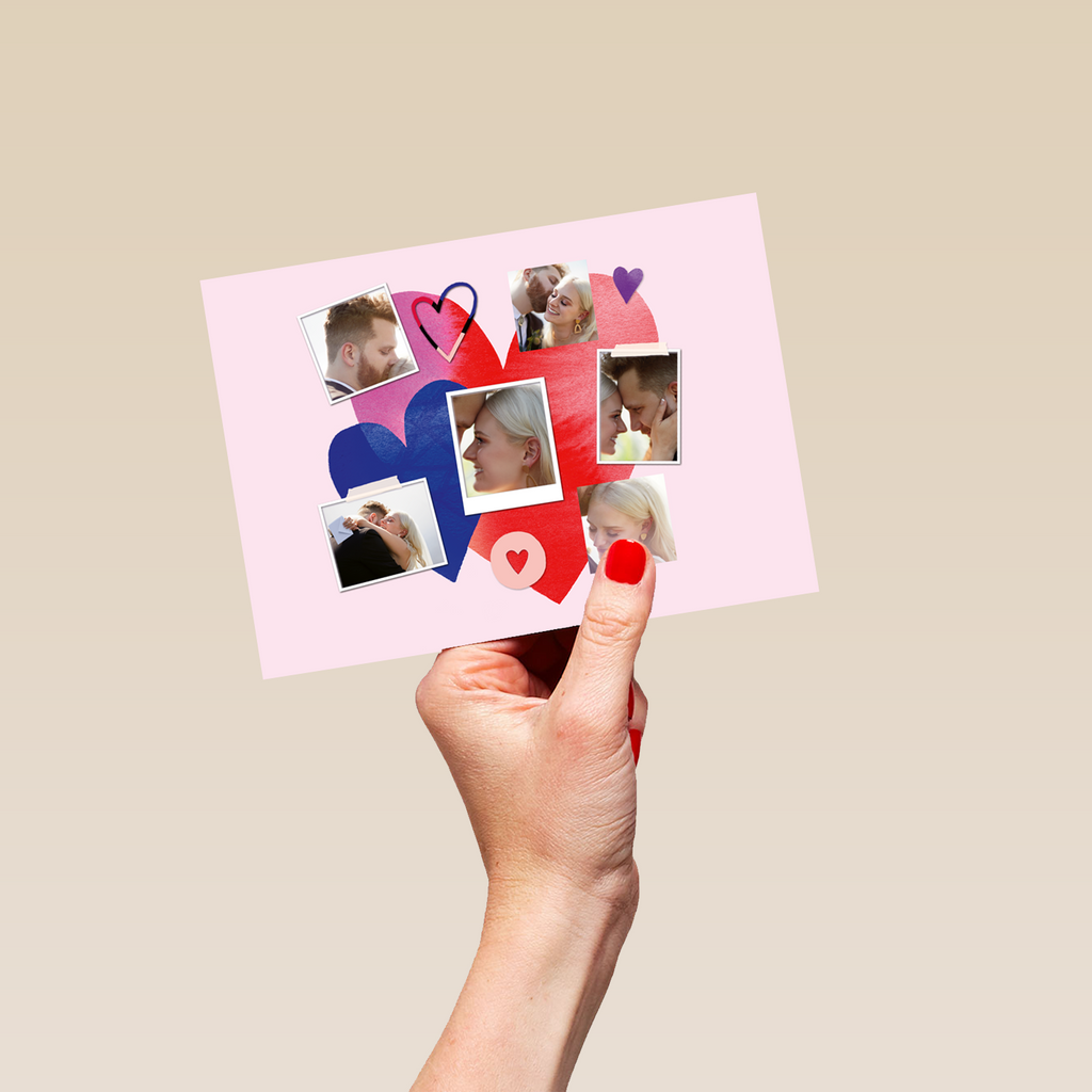 Printed on premium-quality board, this card features a pink background with hearts and frames, space to upload photos, and comes complete with a co-ordinating white envelope.