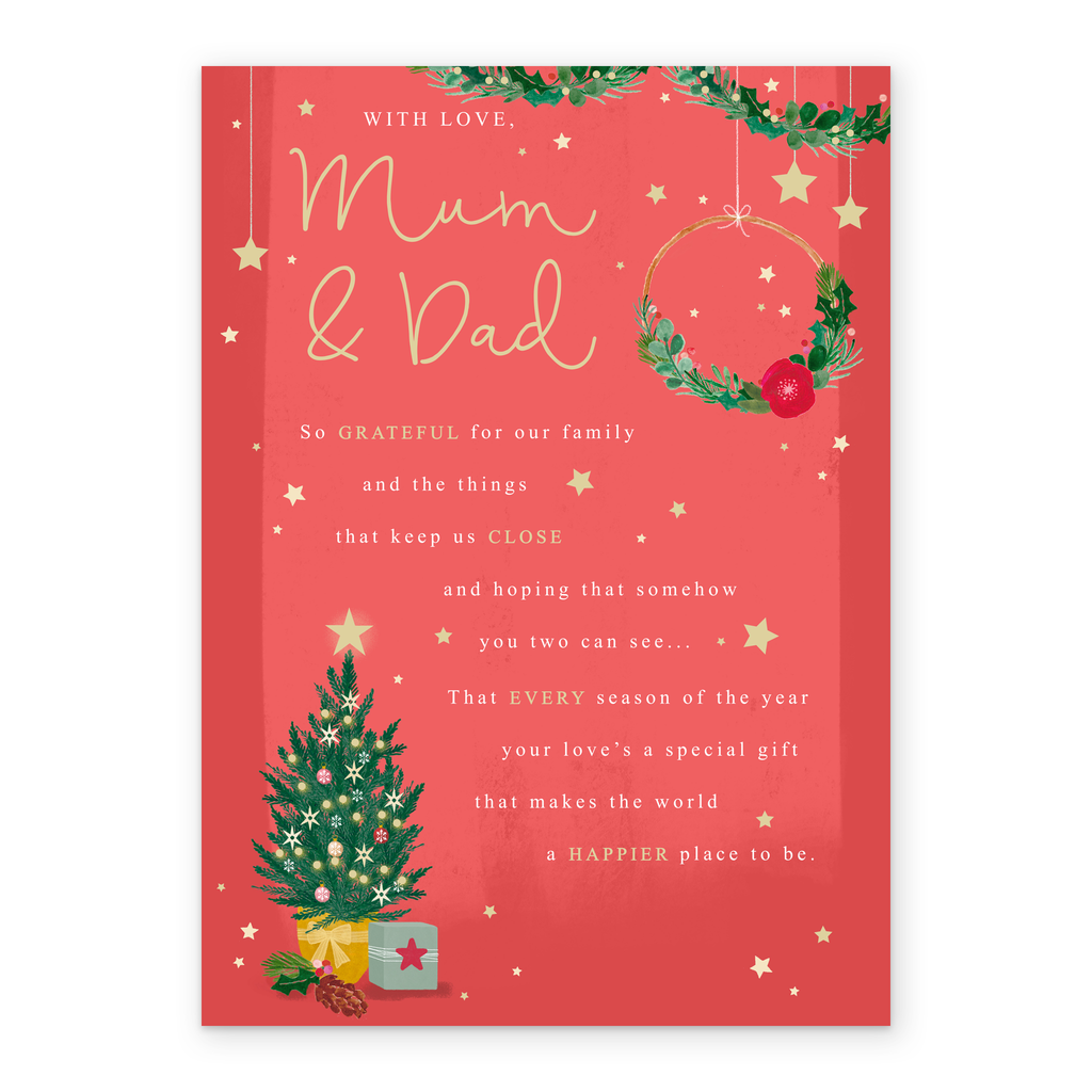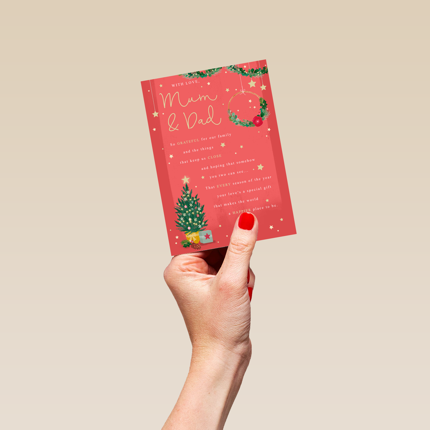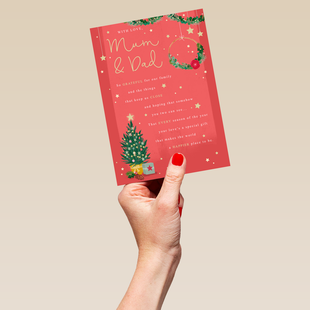 Show them you care with a personalised mum and dad heartfelt Christmas card from Hallmark. Our greetings cards are printed on premium quality, FSC®-certified card & delivered nationwide. This card is available as standard 12cm by 16.7cm and large 15.5cm by 21.6cm.