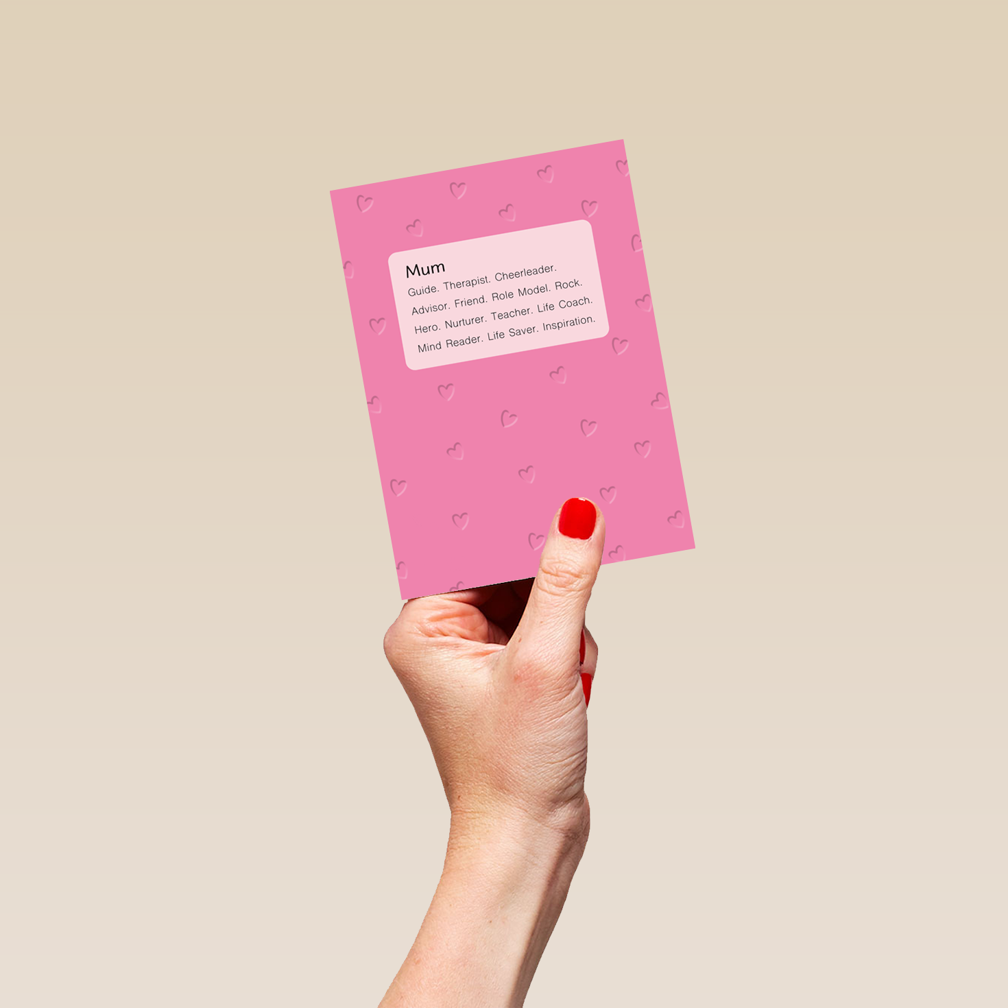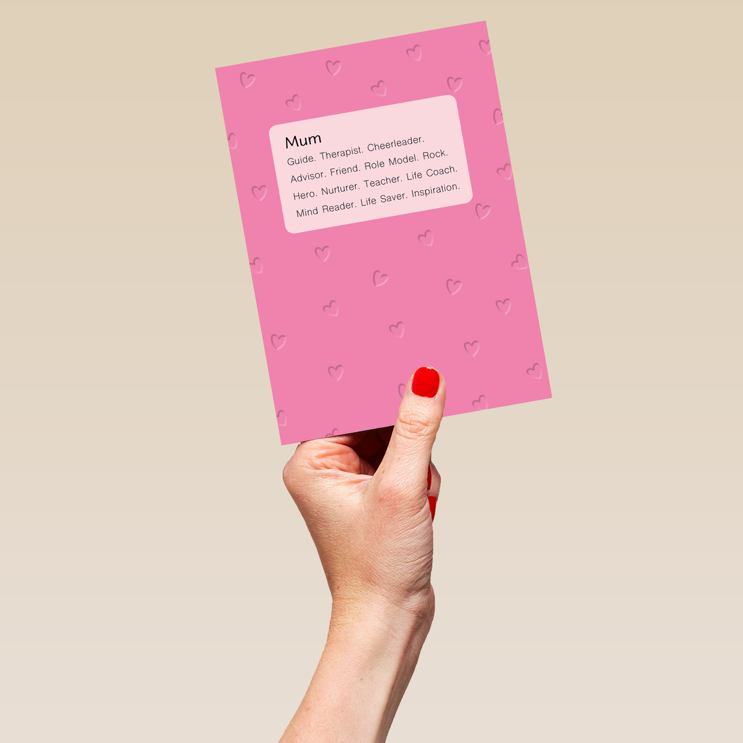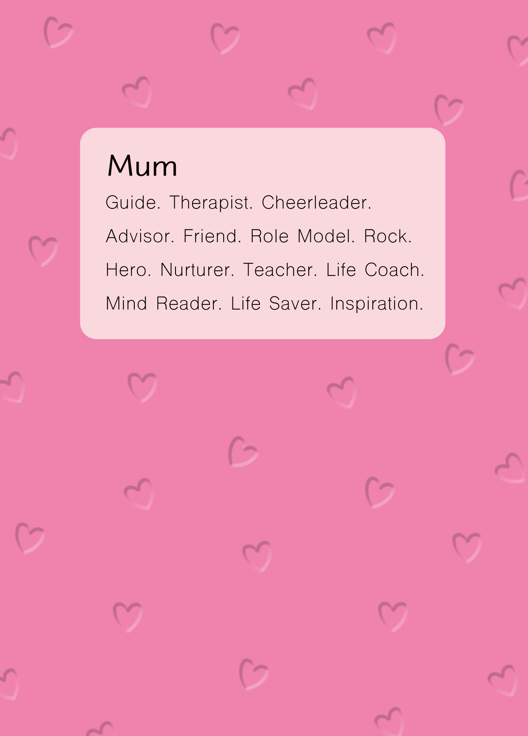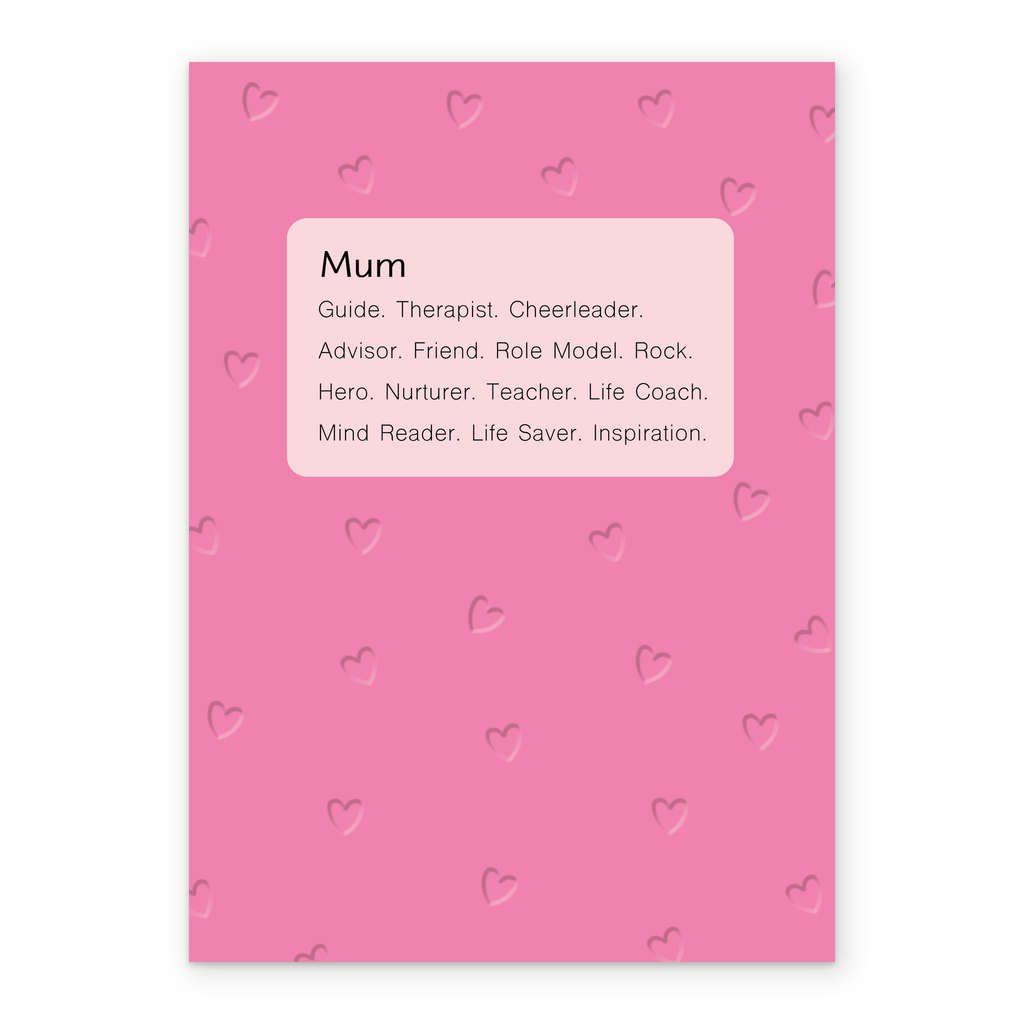 Printed on premium-quality board, this card features emboss-effect hearts on a pink background, and a thesaurus entry, describing everything a mum means to you, with the message 'Mum. Guide. Therapist. Cheerleader. Advisor. Friend. Role Model. Rock. Hero. Nurturer. Teacher. Life Coach. Mind Reader. Life Saver. Inspirational', space to personalise a name, and comes complete with a co-ordinating white envelope.