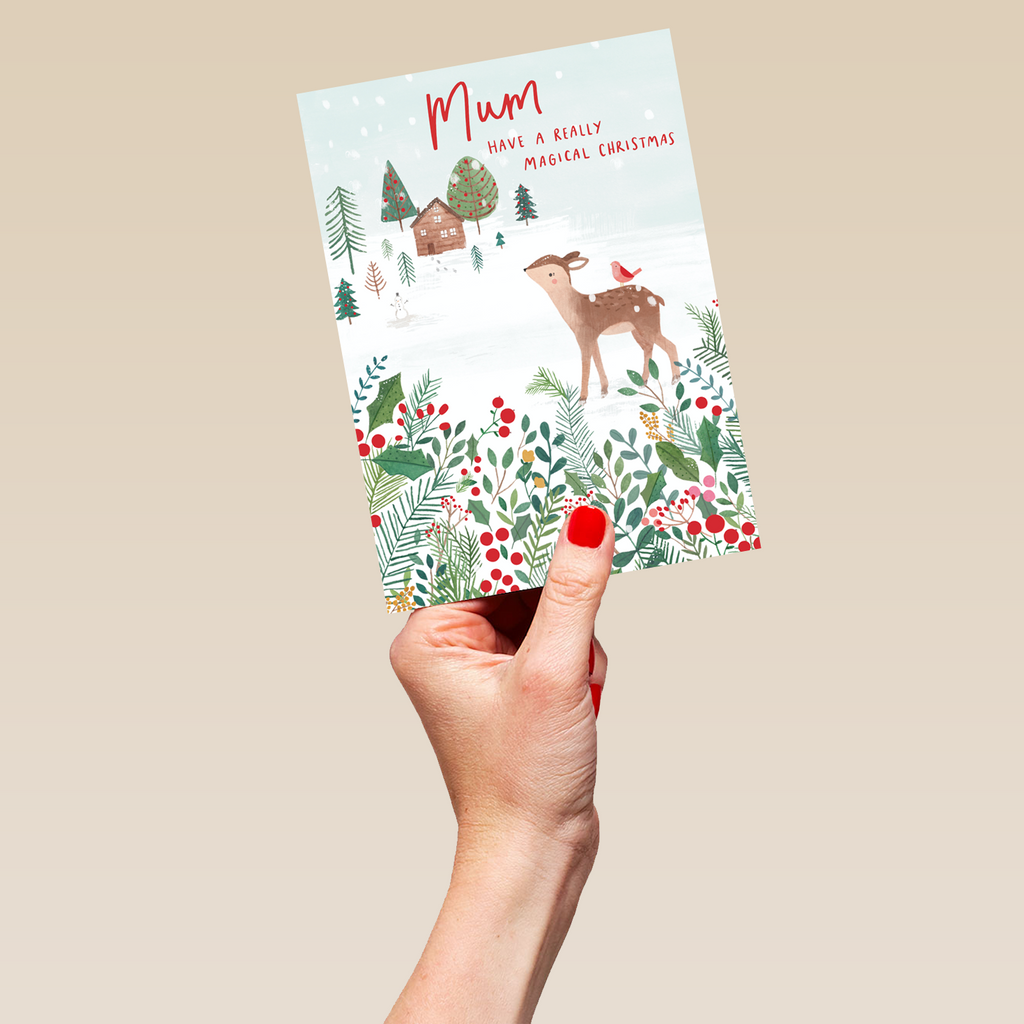 Show them you care with a personalised mum reindeer & snow card from Hallmark. Our Christmas cards are printed on premium quality, FSC®-certified card & delivered nationwide. This card is available as standard 12cm by 16.7cm and large 15.5cm by 21.6cm.