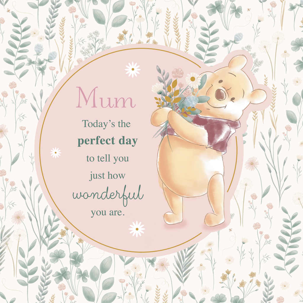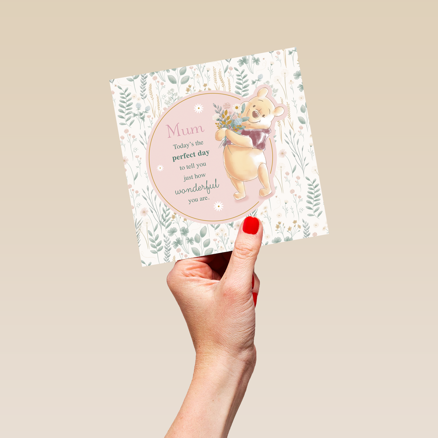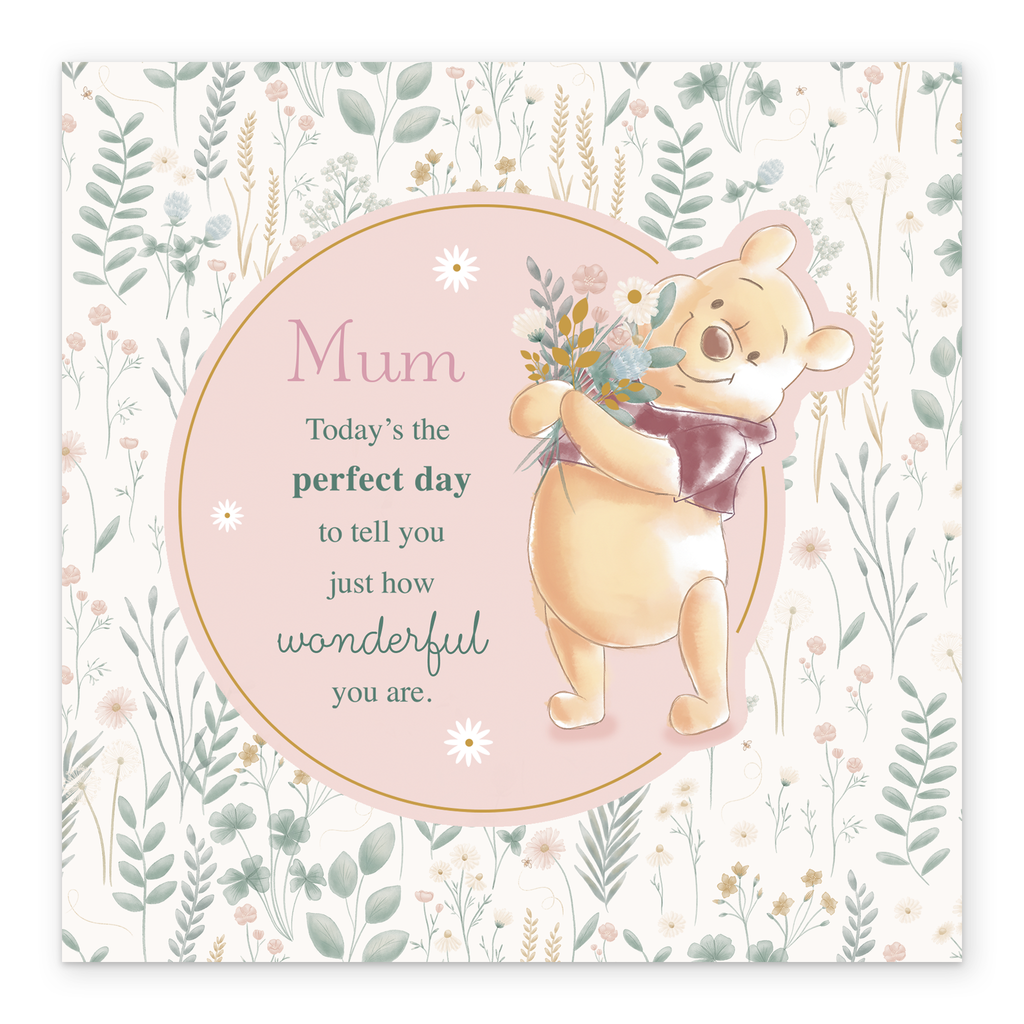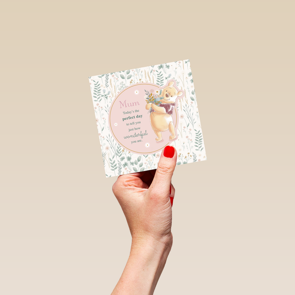 Printed on premium-quality board, this card features a fun design with Winnie the Pooh, with the message ‘Mum, today's the perfect day to tell you just how wonderful you are', space to personalise a name, and comes complete with a co-ordinating white envelope.