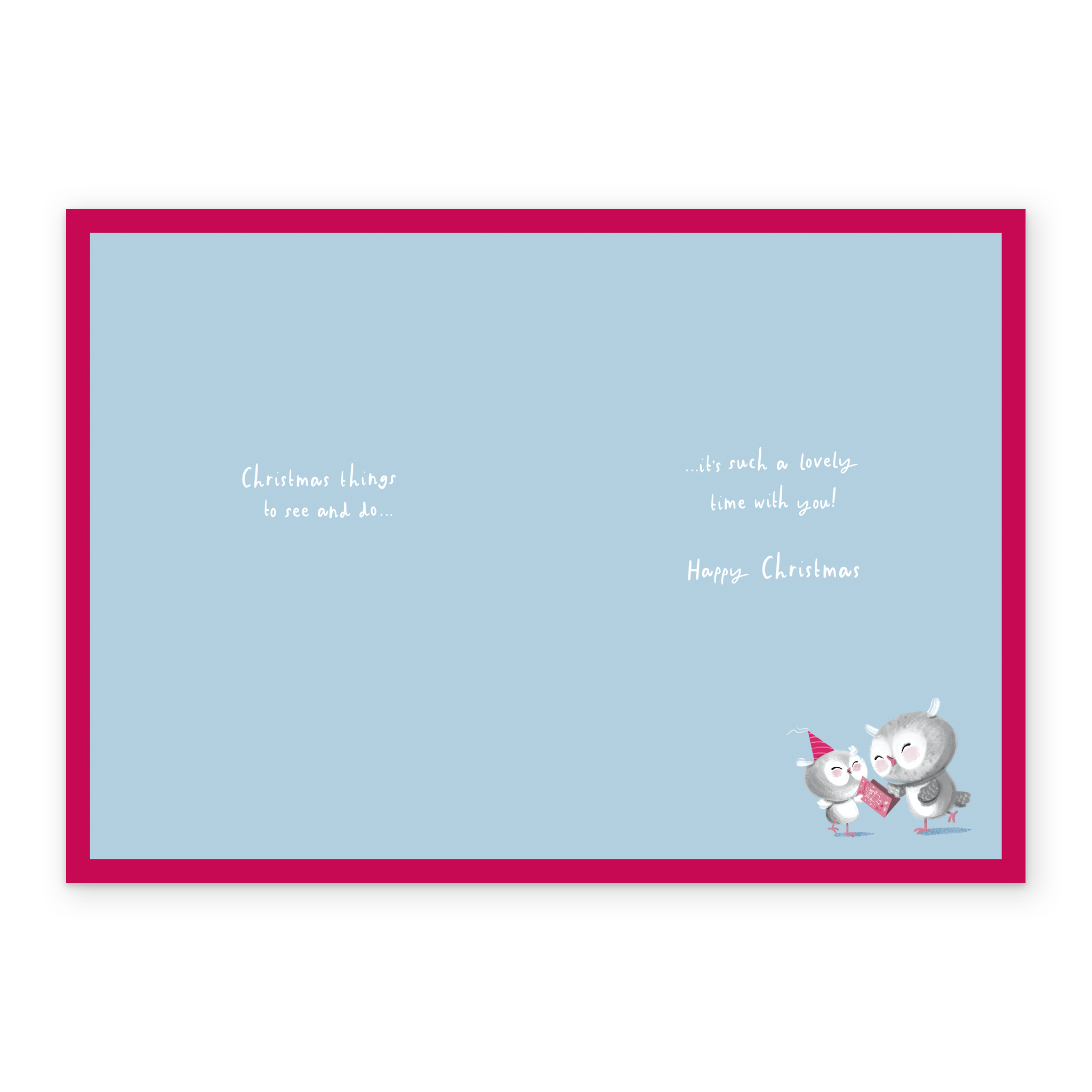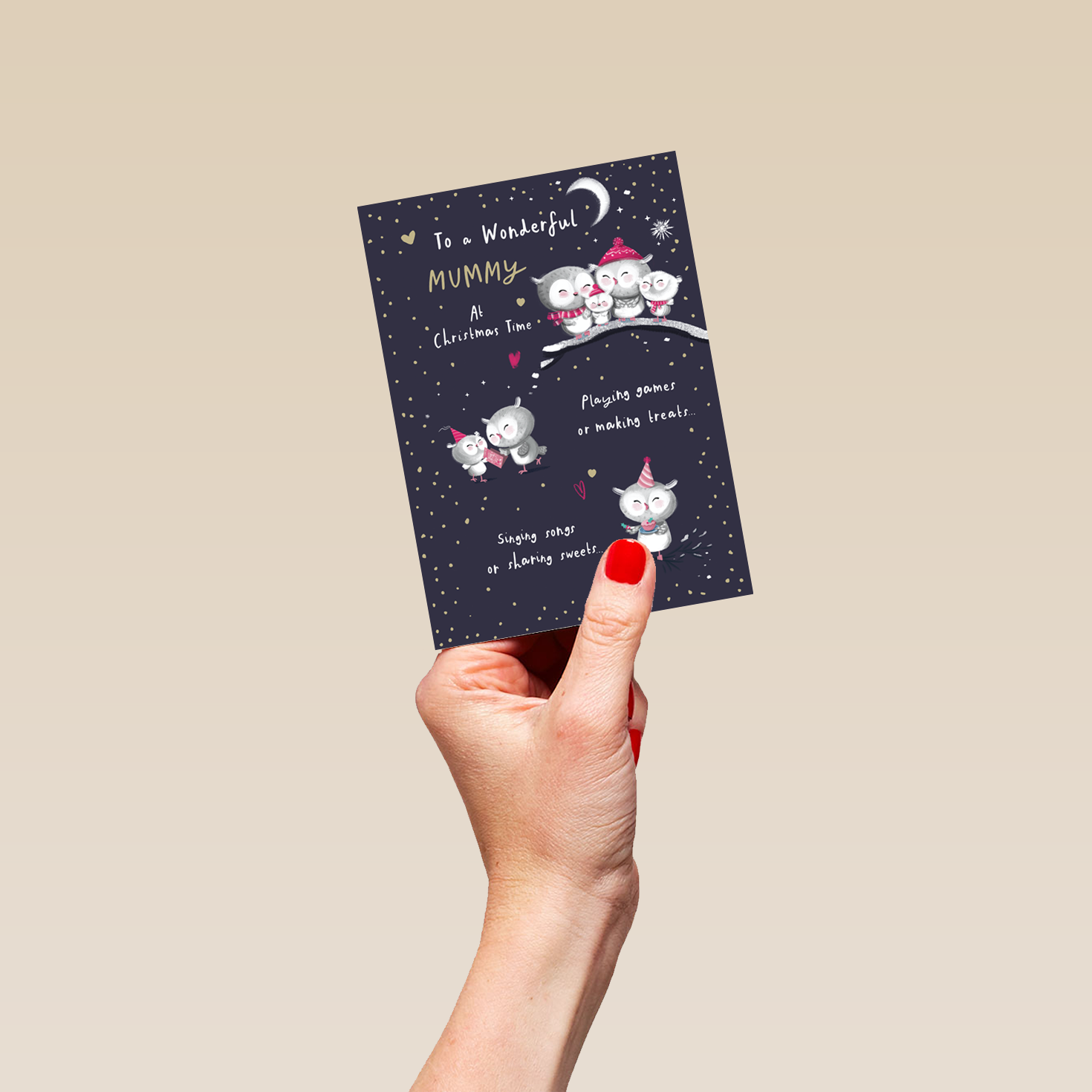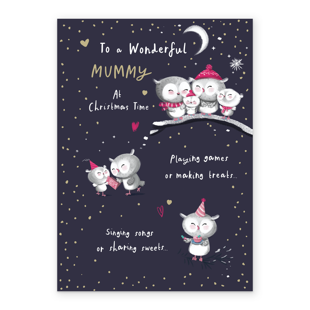 Show them you care with a personalised mummy cute owls verse Christmas card from Hallmark. Our greetings cards are printed on premium quality, FSC®-certified card & delivered nationwide. This card is available as standard 12cm by 16.7cm and large 15.5cm by 21.6cm.