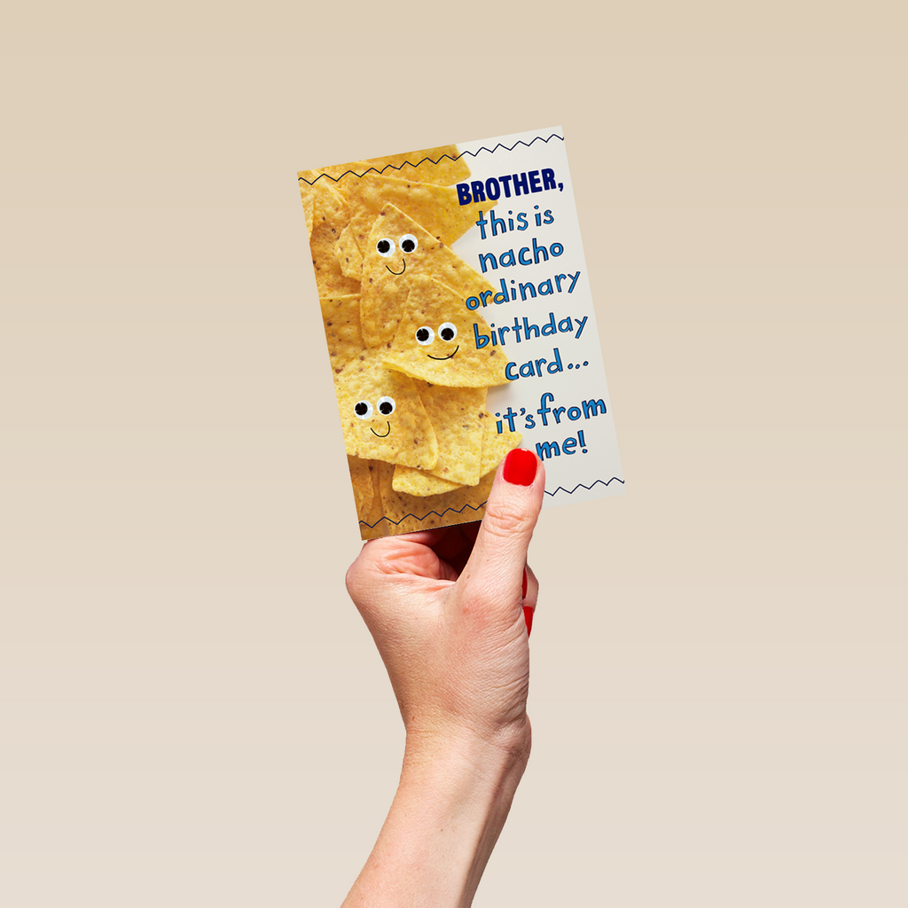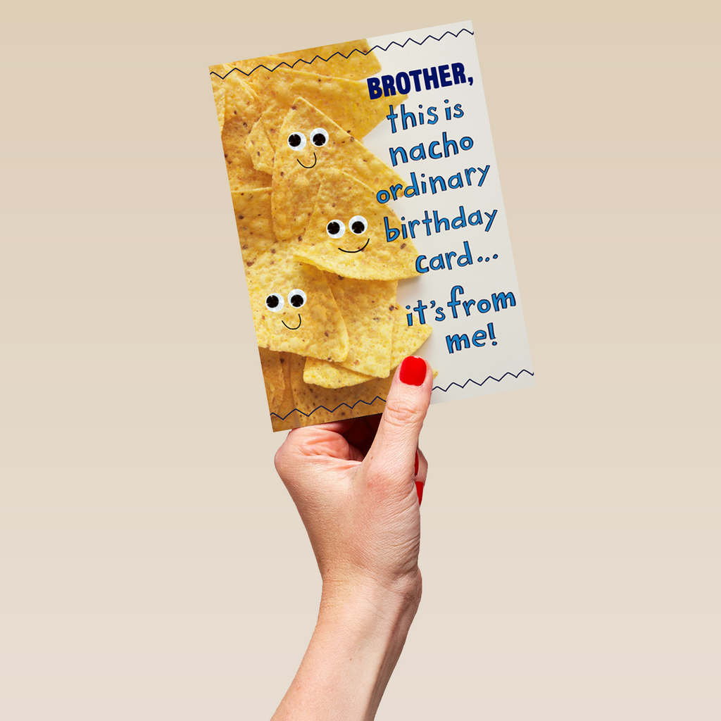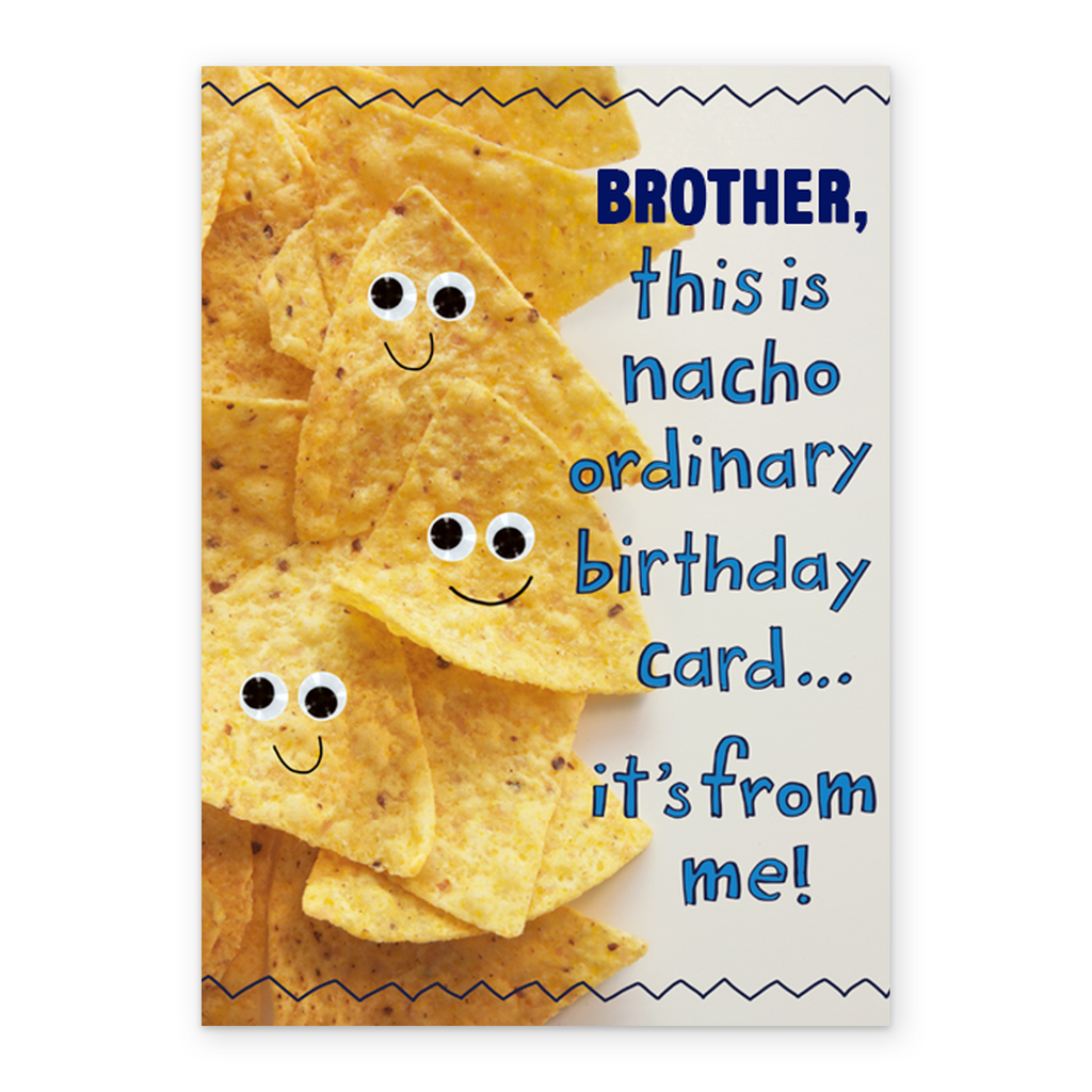 Show them you care with a personalised nachos brother birthday card from Hallmark. Our birthday cards are printed on premium quality, FSC®-certified card & delivered nationwide. This card is available as standard 12cm by 16.7cm and large 15.5cm by 21.6cm.