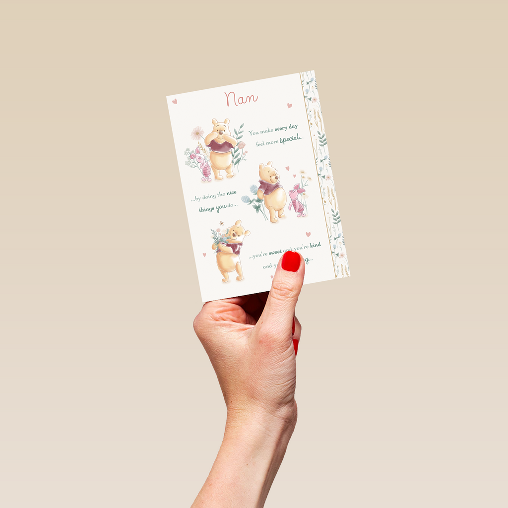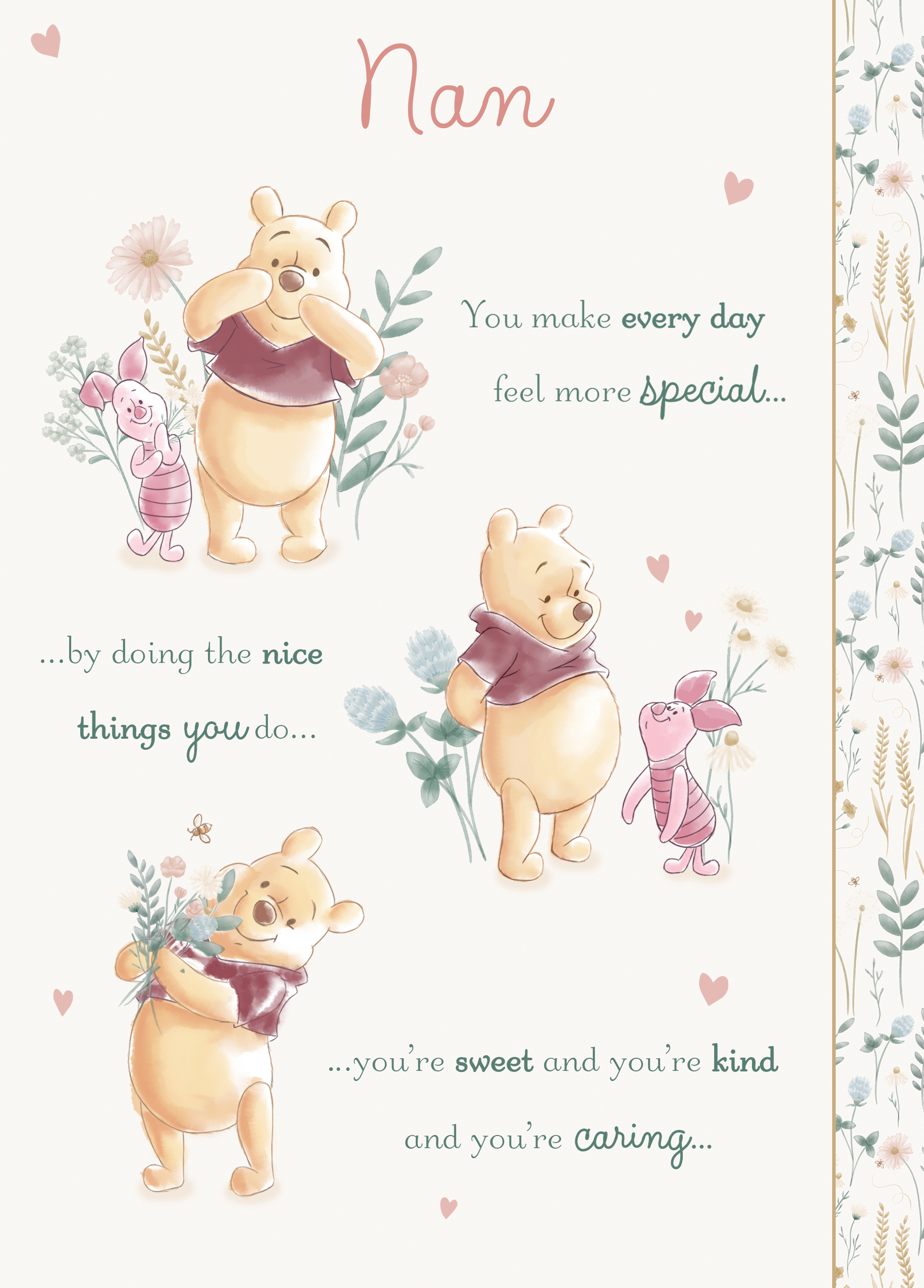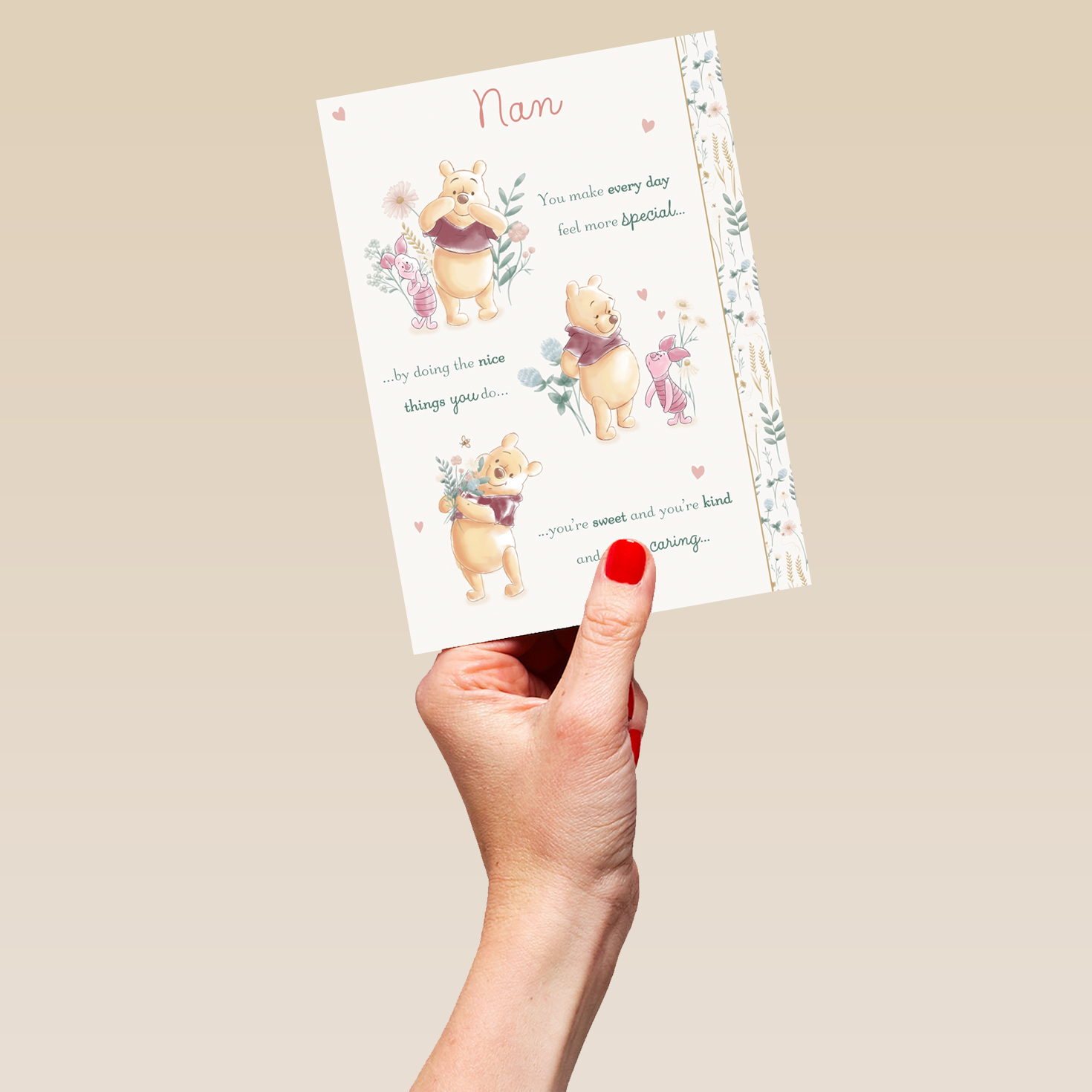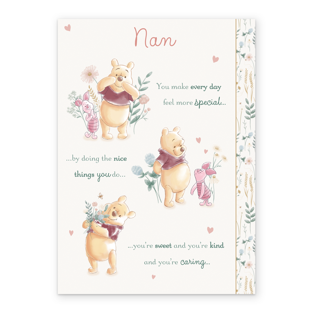 Printed on premium-quality board, this card features cute illustrations of Winnie the Pooh and Piglet, with the message ‘Nan, you make every day feel more special… by doing the nice things you do… you're sweet and you're kind and you're caring…', space to personalise a name, and comes complete with a co-ordinating white envelope.
