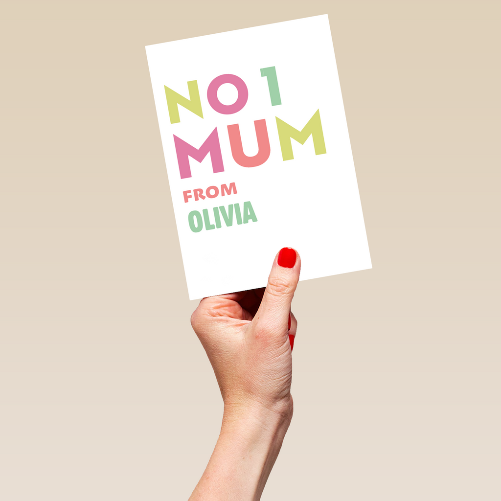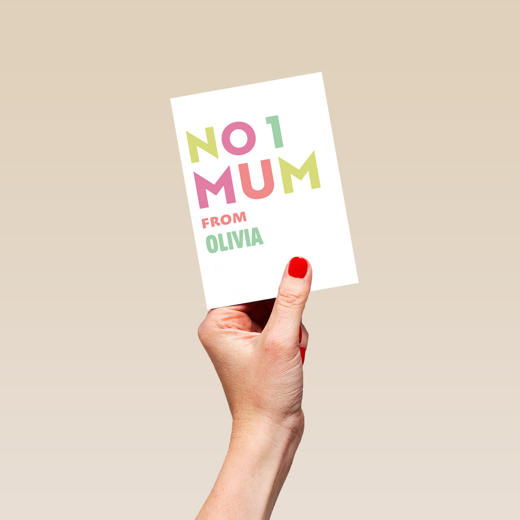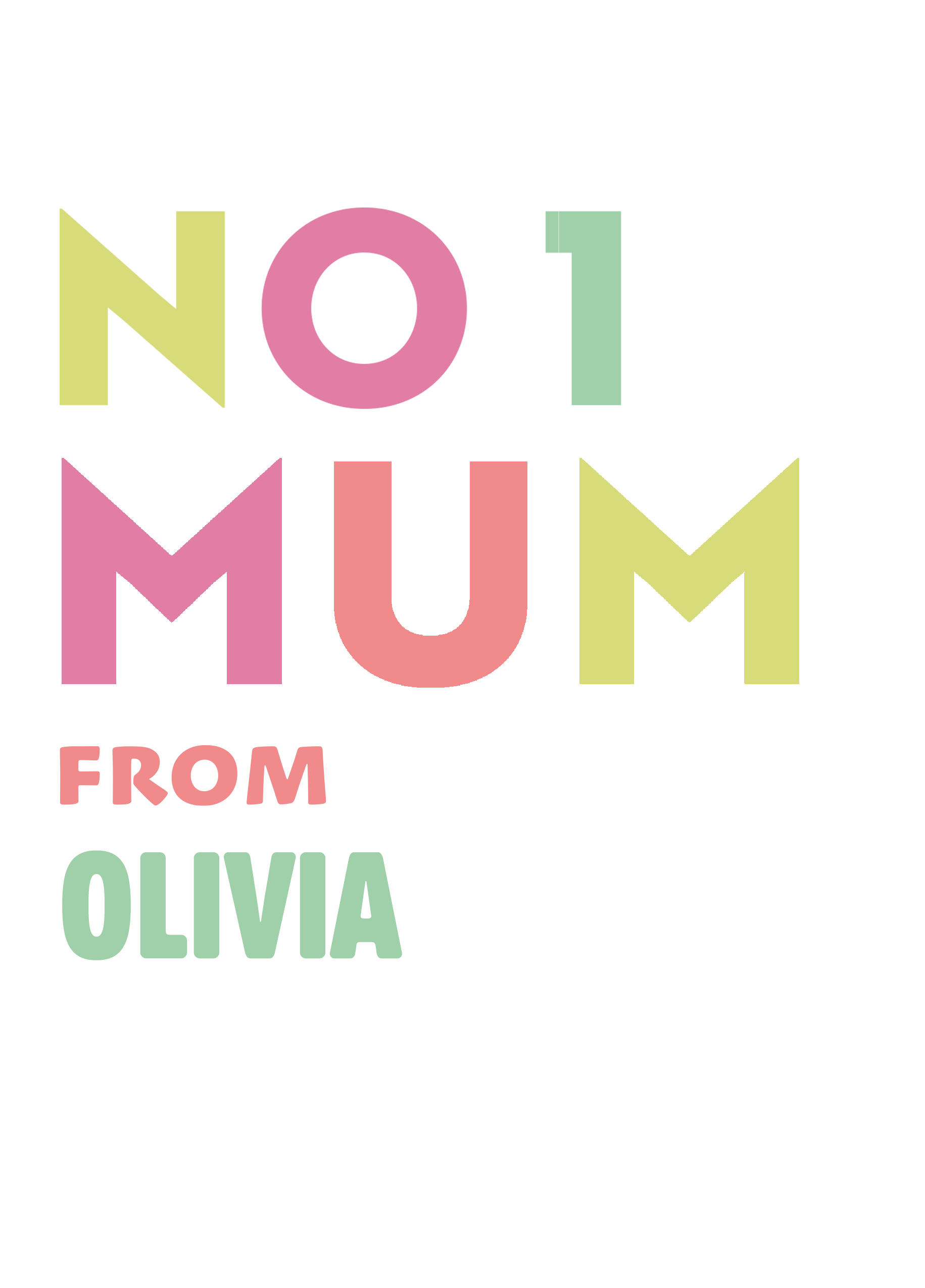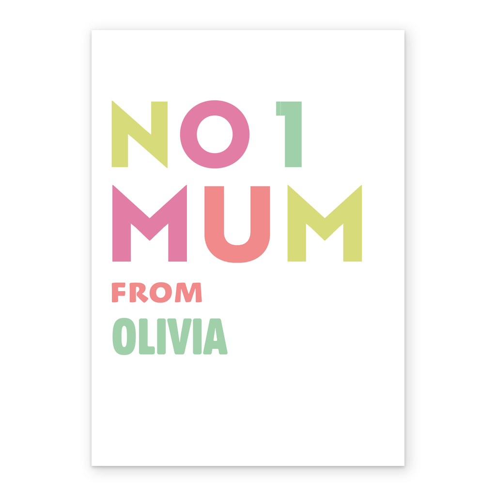 Printed on premium-quality board, this card features a contemporary text-based design with colourful letters on a white background, with the message 'No1 Mum From ____', space to personalise a name, and comes complete with a co-ordinating white envelope.