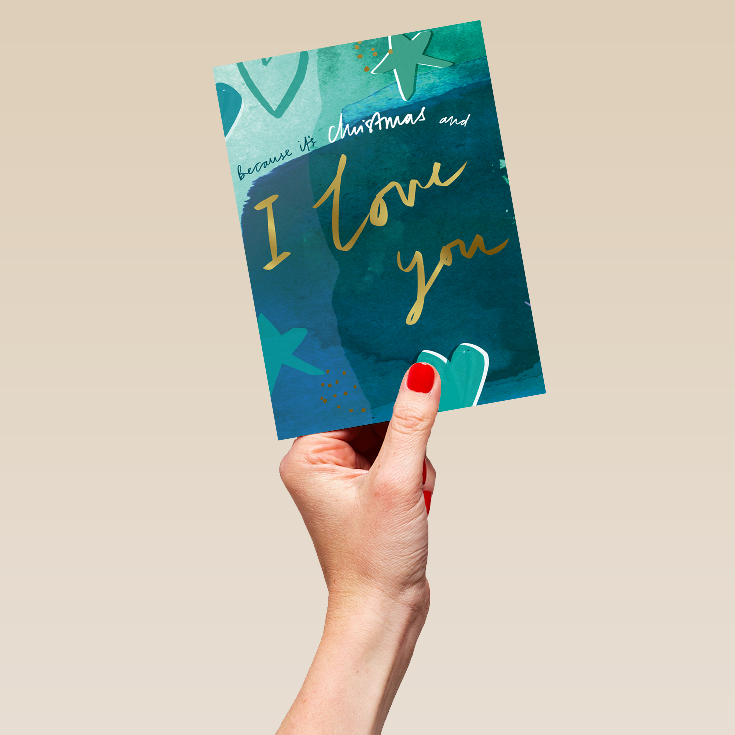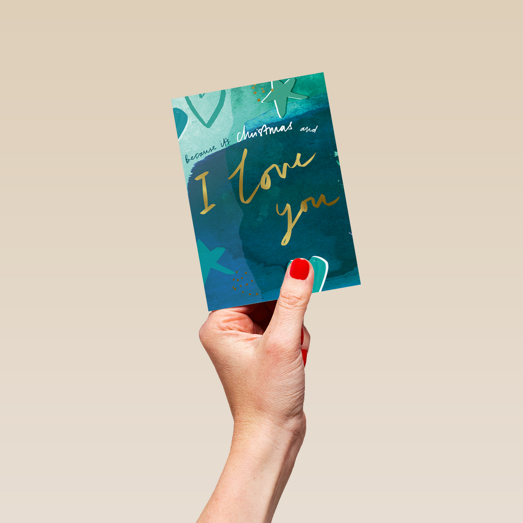 Show them you care with a personalised one I love hearts & stars contemporary Christmas card from Hallmark. Our greetings cards are printed on premium quality, FSC®-certified card & delivered nationwide. This card is available as standard 12cm by 16.7cm and large 15.5cm by 21.6cm.